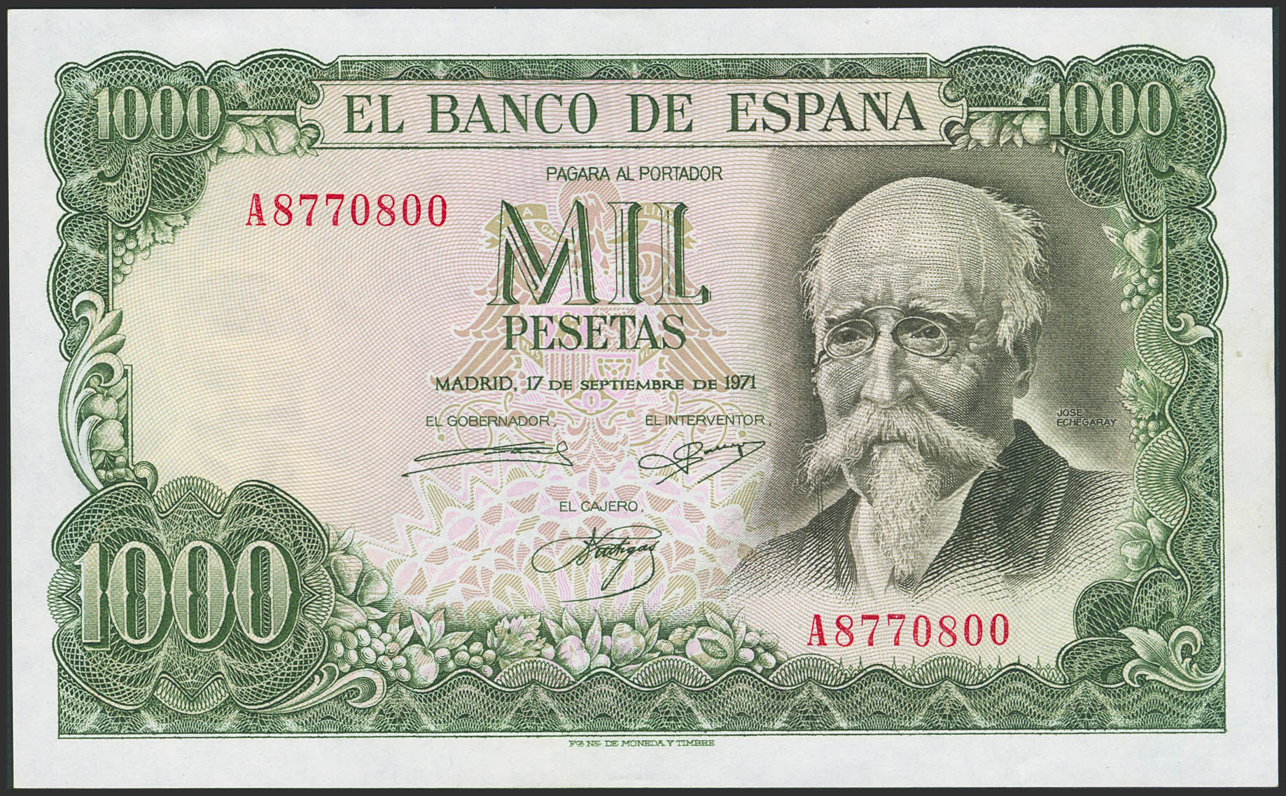 1000 Pesetas. September 17, 1971. Series A. (Edifil 2023: 474a). Original finish. Uncirculated.