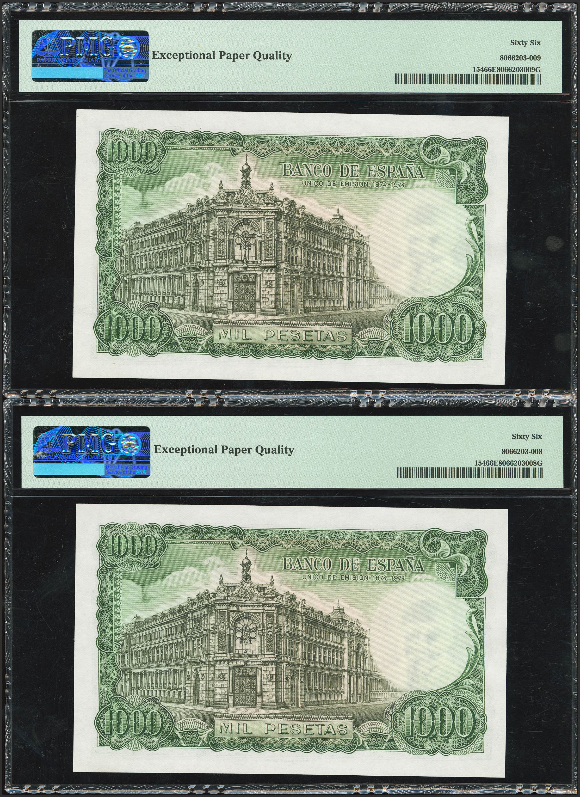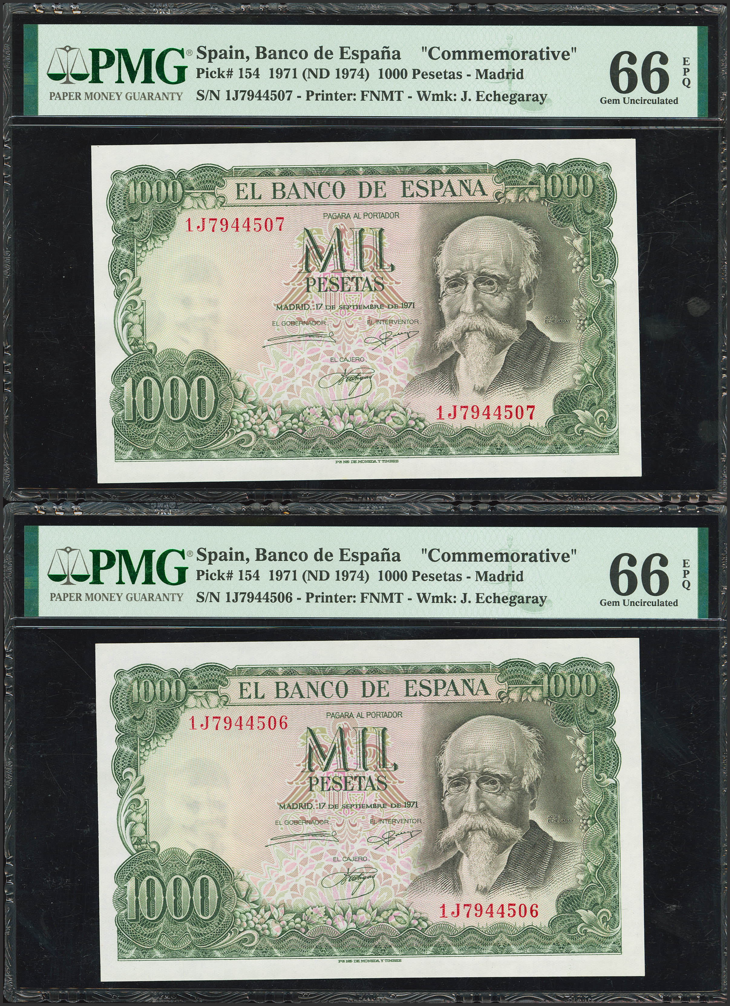 1000 Pesetas. September 17, 1971. Consecutive pair. Series 1J. (Edifil 2023: 474c, Pick: 154). Original finish. Uncirculated. PMG66EPQ capsules, both.