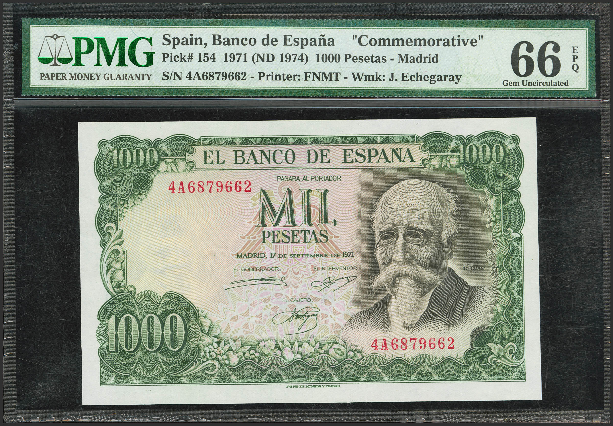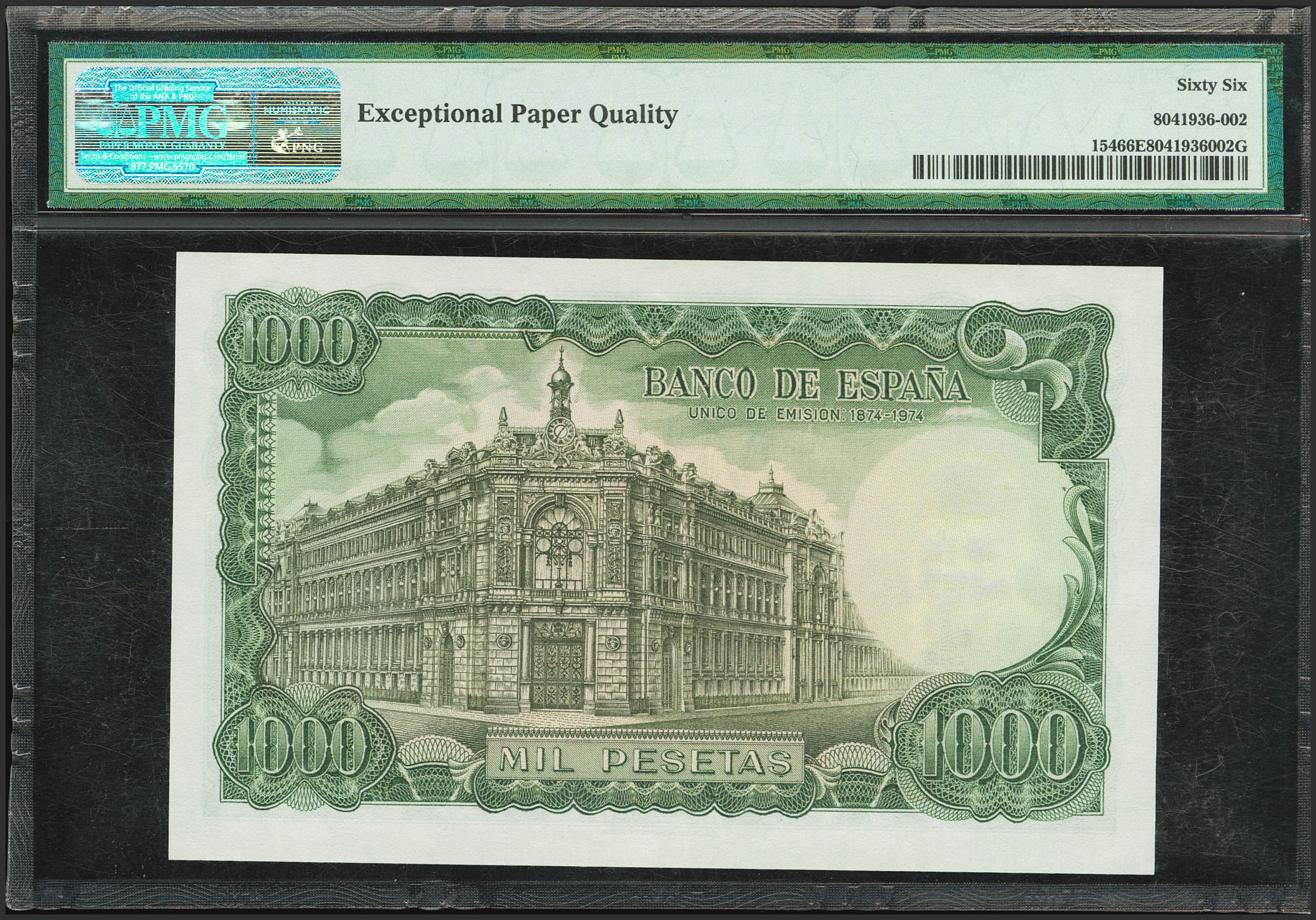 1000 Pesetas. September 17, 1971. Series 4A. (Edifil 2023: 474c, Pick: 154). Original finish. Uncirculated. PMG66EPQ package.