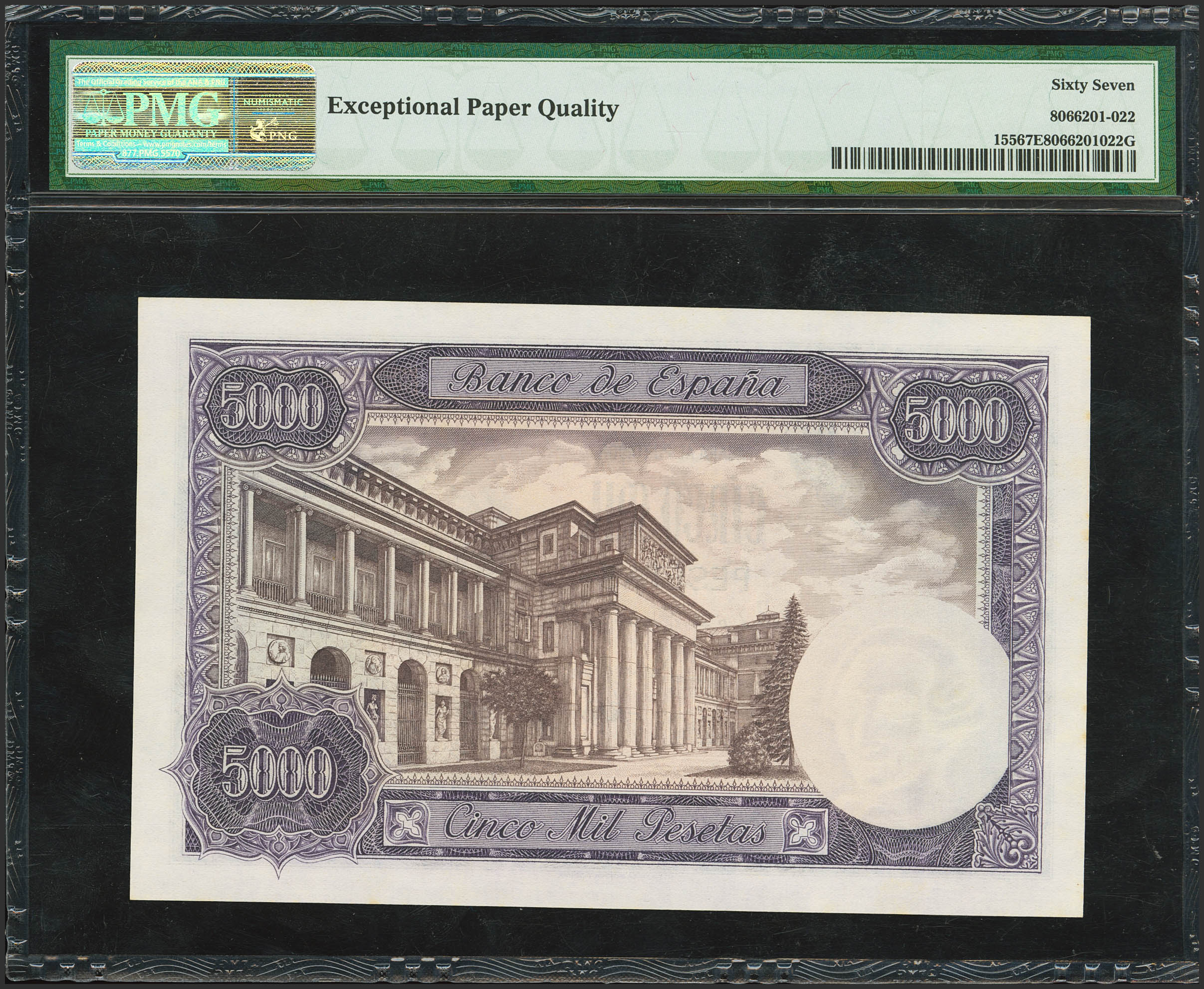 5000 Pesetas. February 6, 1976. No serial number. (Edifil 2023: 475, Pick: 155). Unusual in this exceptional condition. Uncirculated. Packaged as PMG67EPQ.