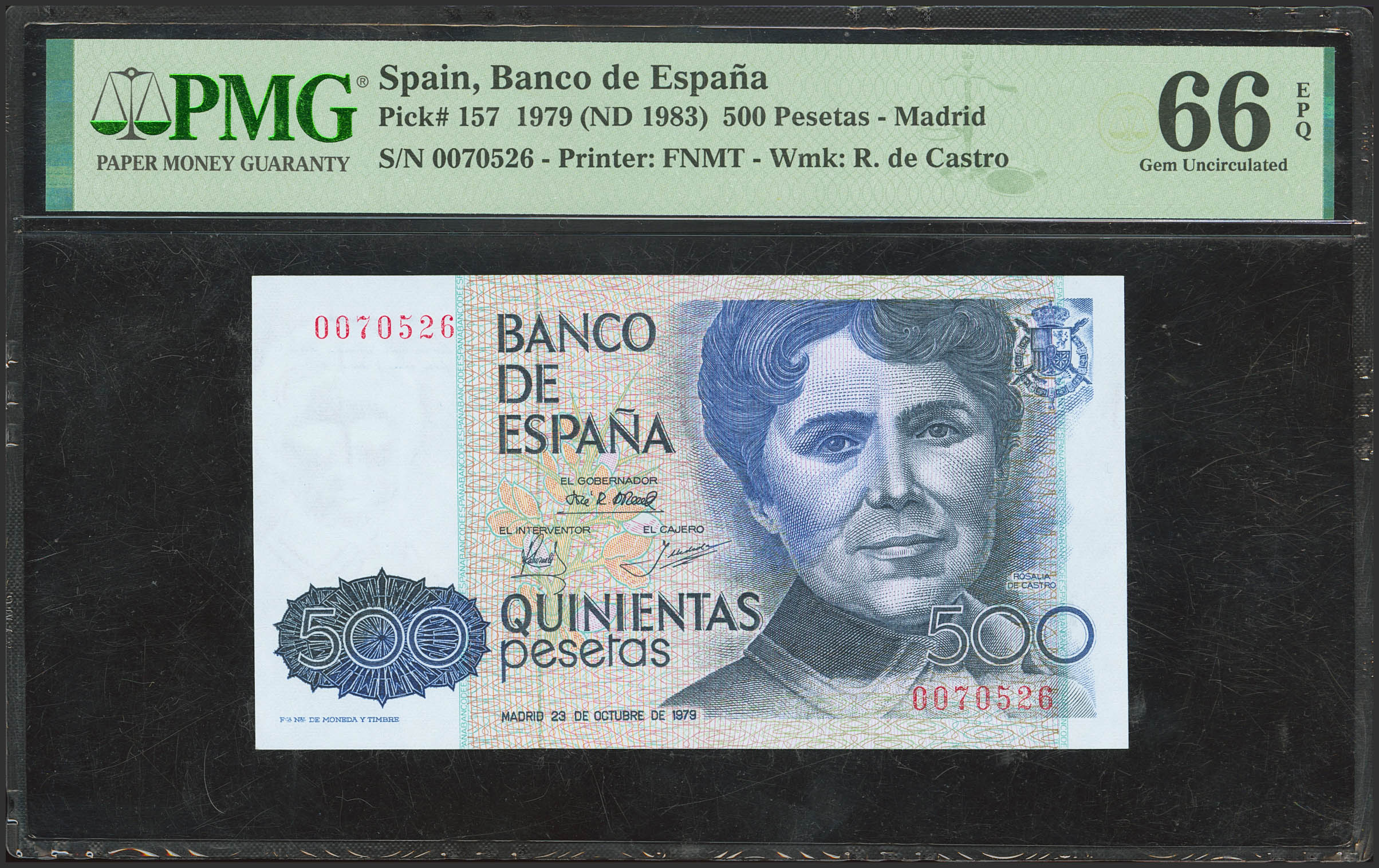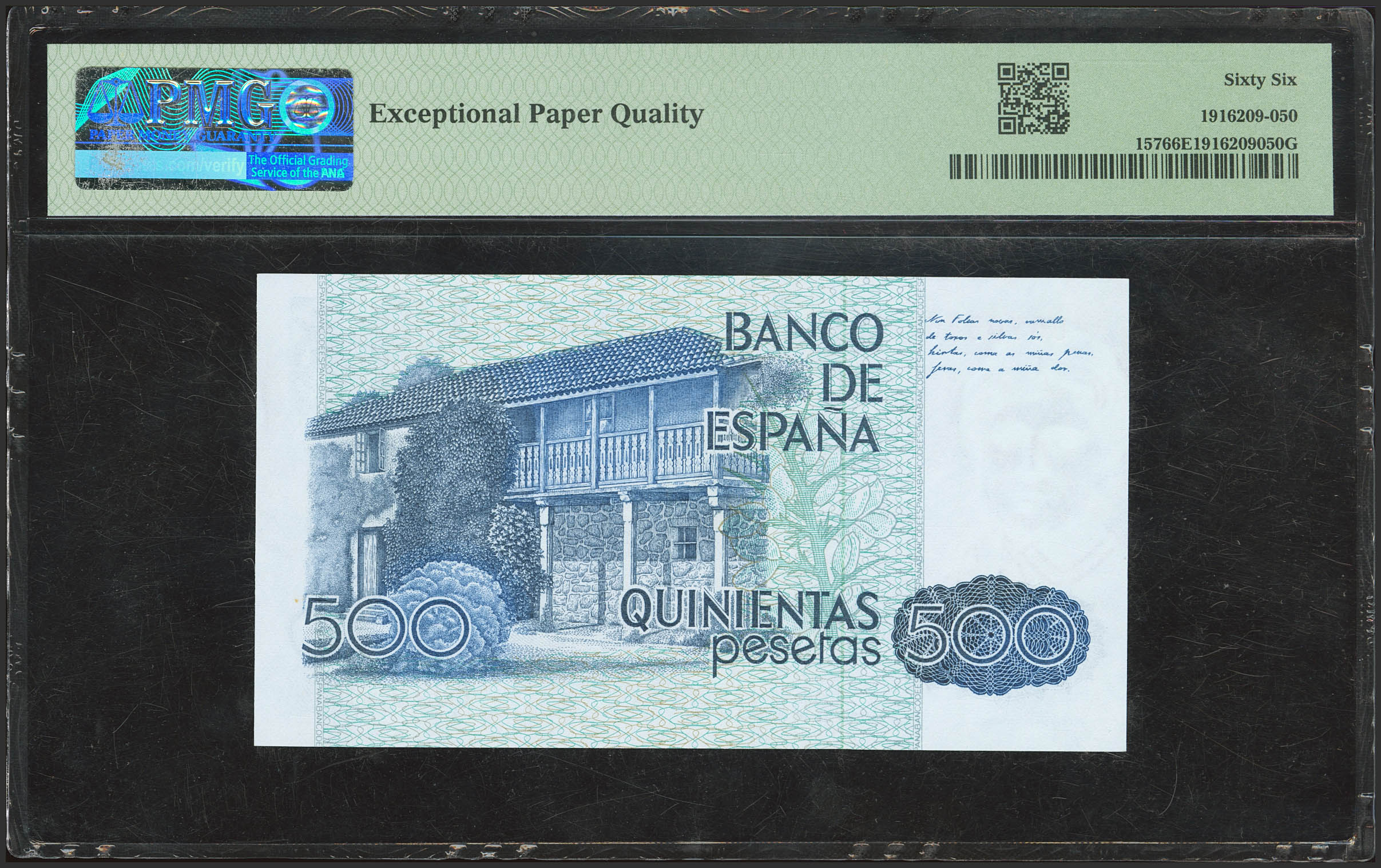 500 Pesetas. October 23, 1979. No serial number. (Edifil 2023: 476, Pick: 157). Uncirculated. PMG66EPQ package.