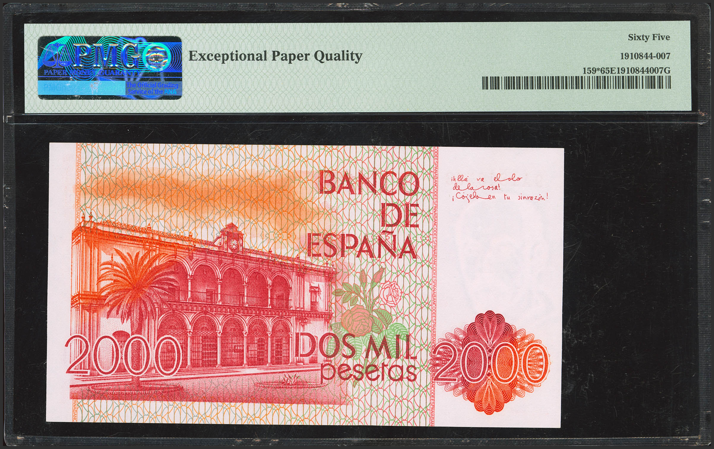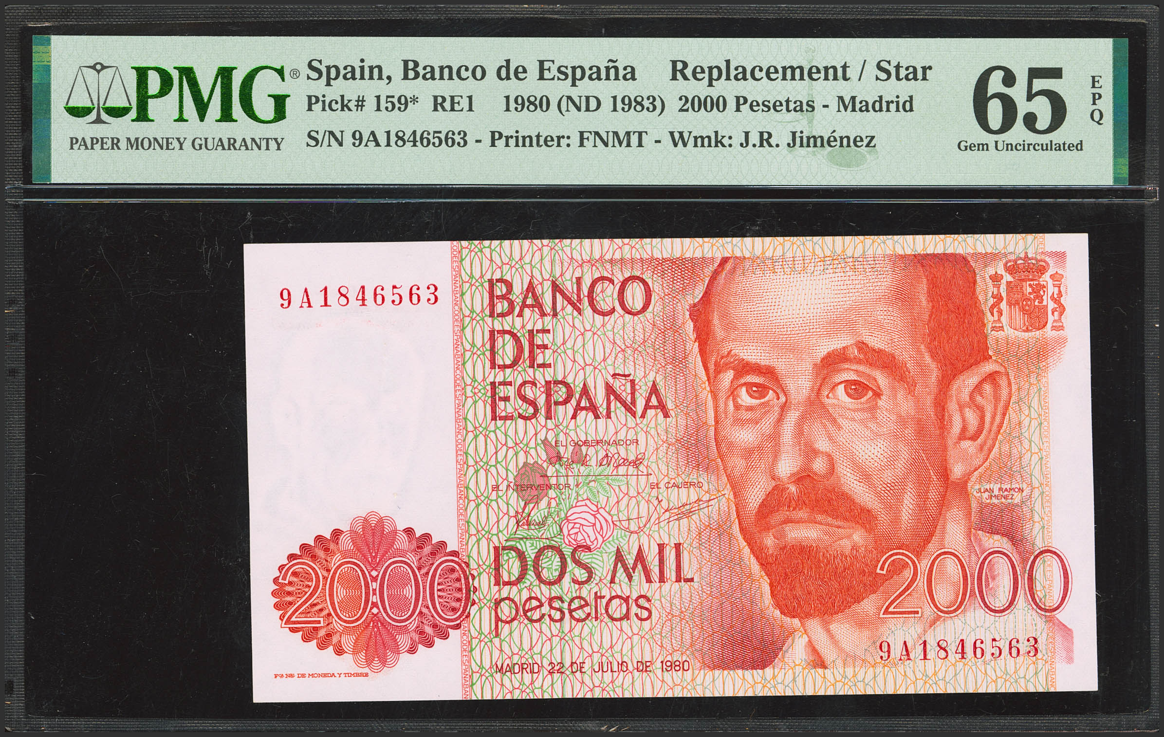 English 2000 Pesetas. July 22, 1980. Special Series 9A. (Edifil 2023: 479b, Pick: 159*). Uncirculated. PMG65EPQ package.