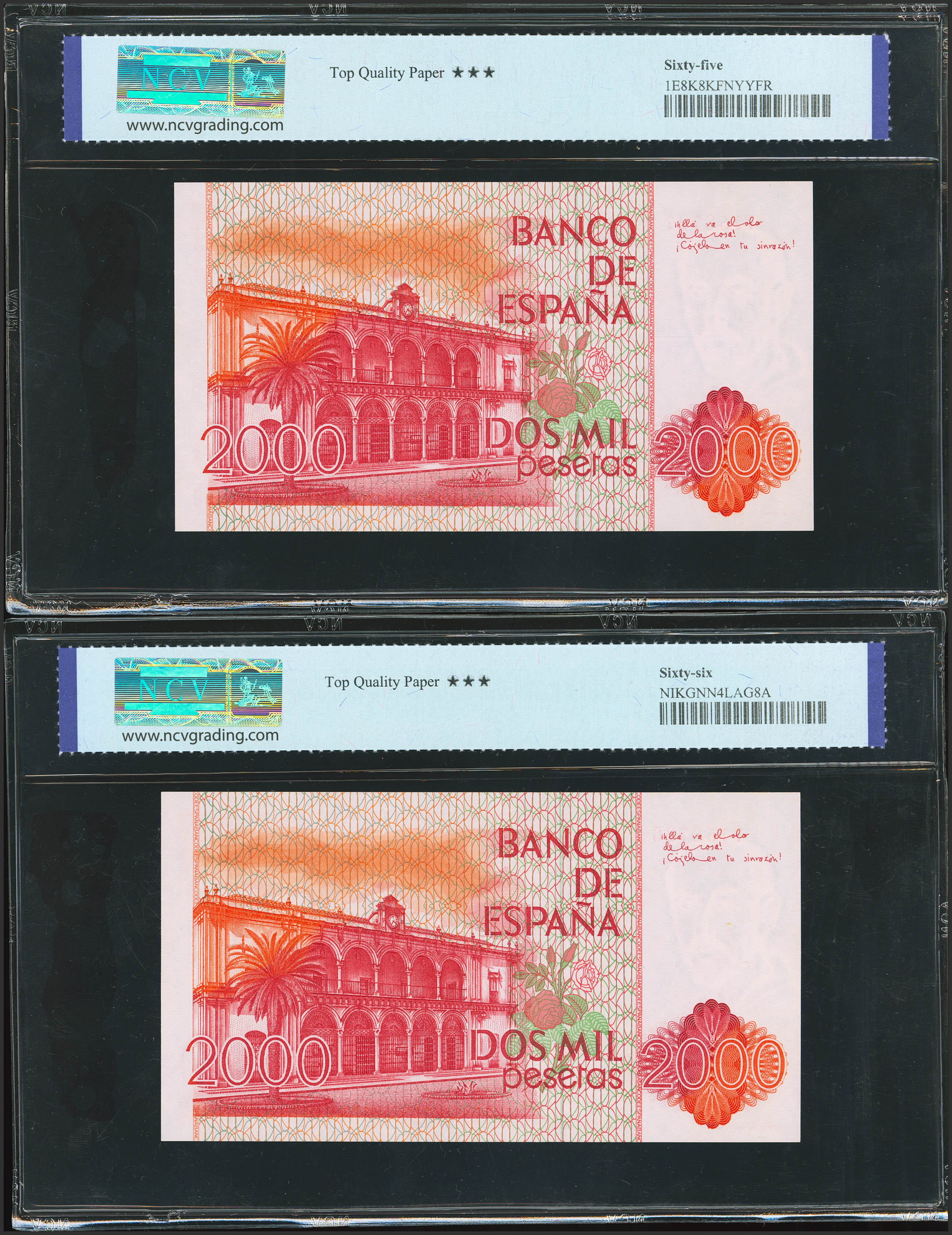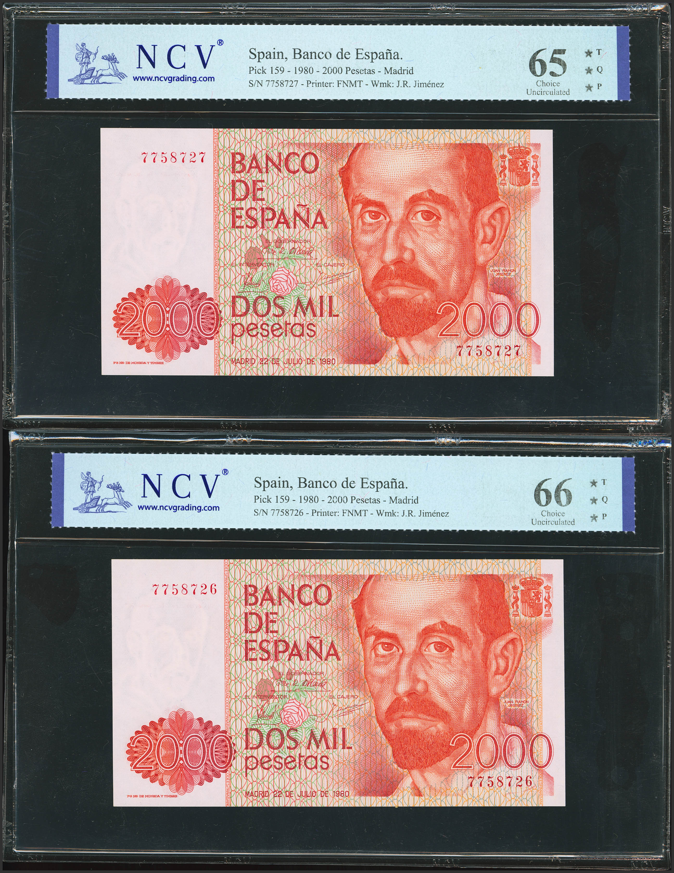 2000 Pesetas. July 22, 1980. Consecutive pair. No serial number. (Edifil 2023: 479, Pick: 159). Unusual in this exceptional condition. Uncirculated. Packaged NCV66TQP/65TQP.