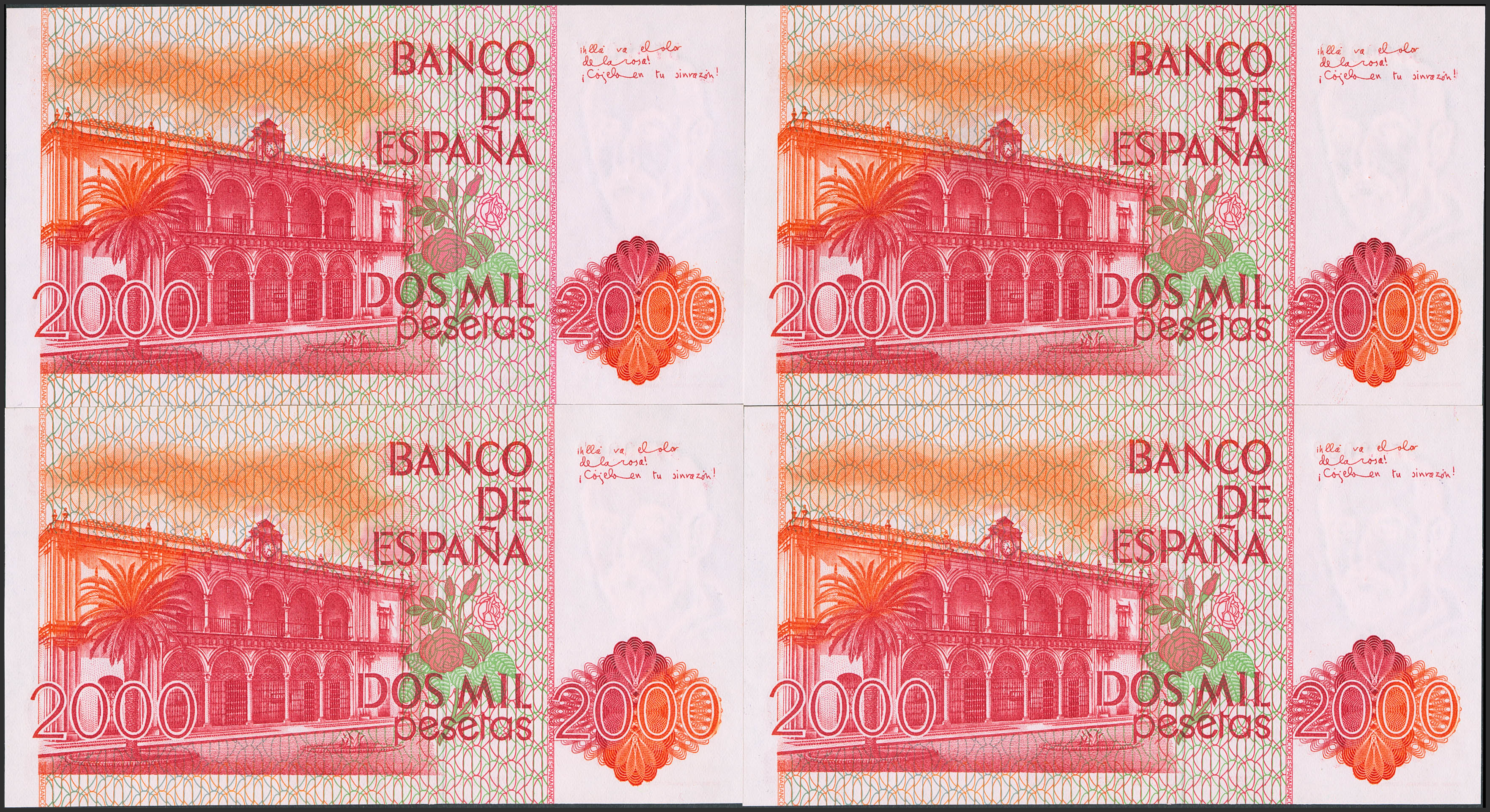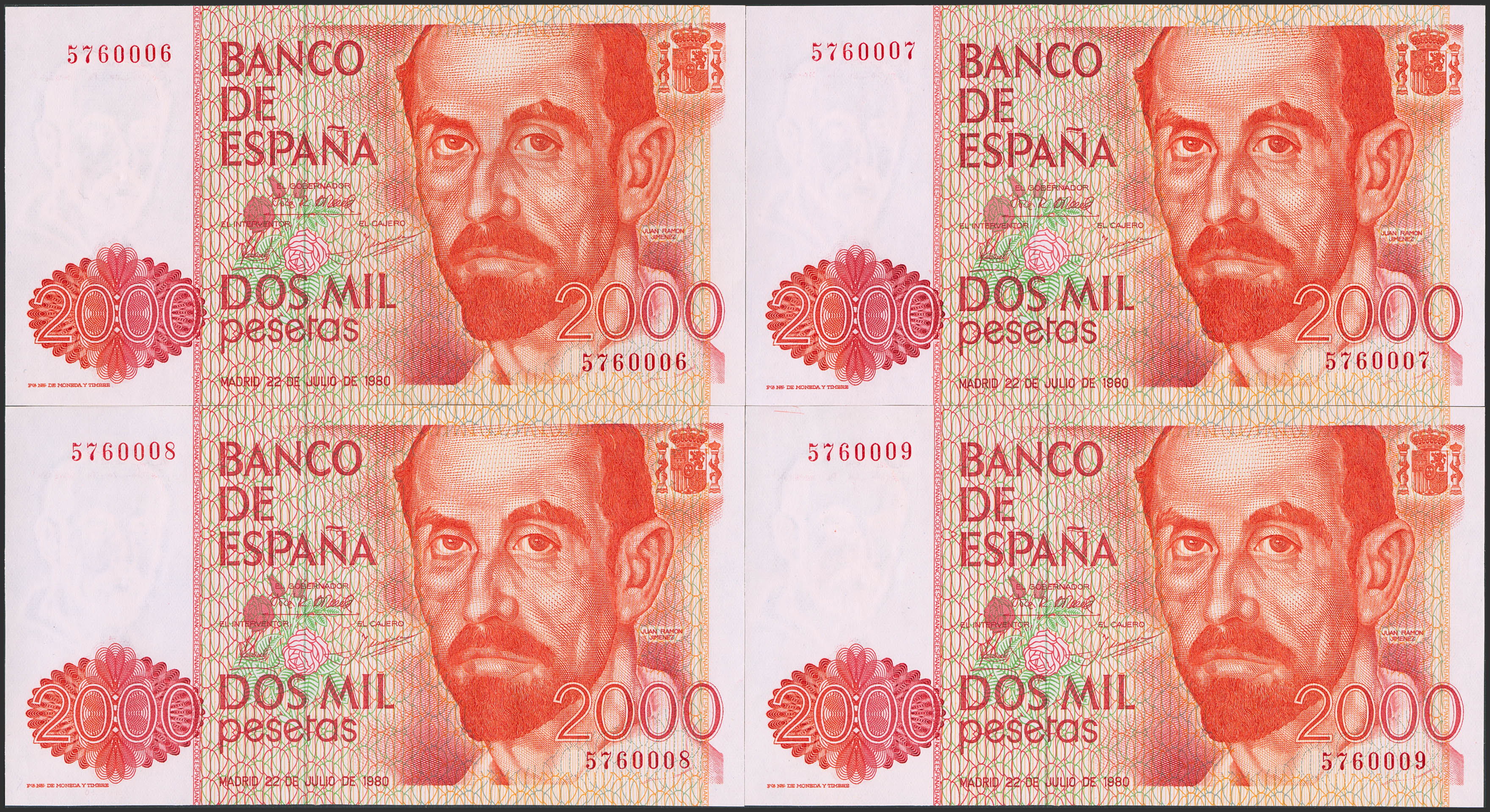 Set of 4 consecutive 2000 Pesetas banknotes issued on July 22, 1980, all without a series number. (Edifil 2023: 479). Uncirculated-.