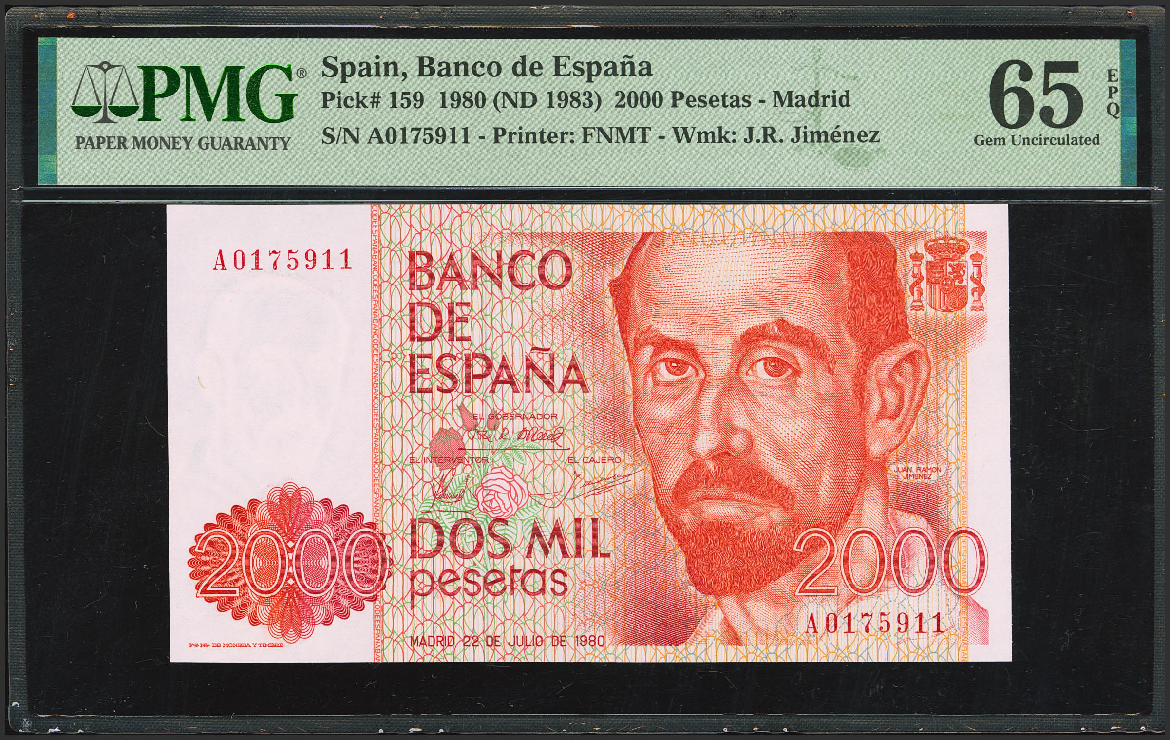 English 2000 Pesetas. July 22, 1980. Series A. (Edifil 2023: 479a, Pick: 159). Unusual in this exceptional quality. Uncirculated. PMG65EPQ capsule.