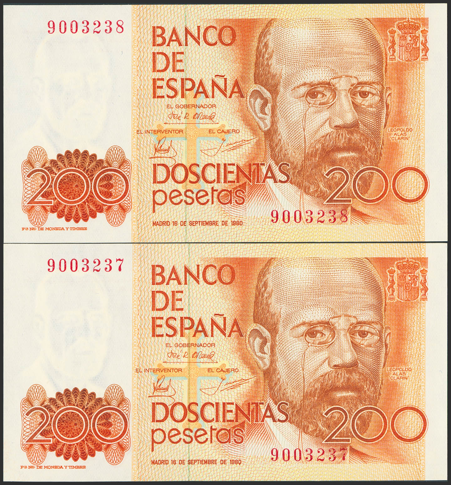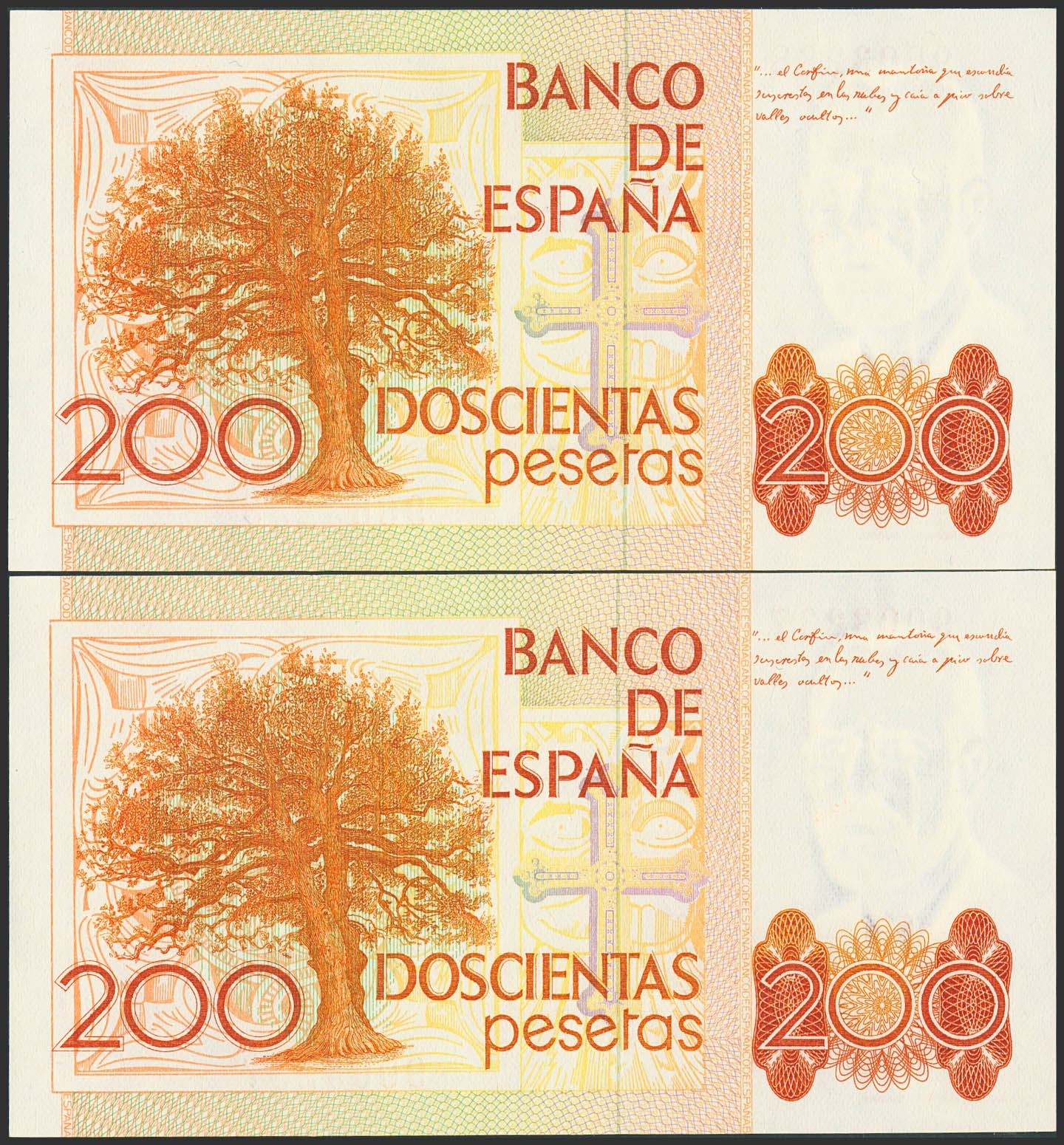200 Pesetas. September 16, 1980. Consecutive pair. No series. (Edifil 2023: 480). Uncirculated.