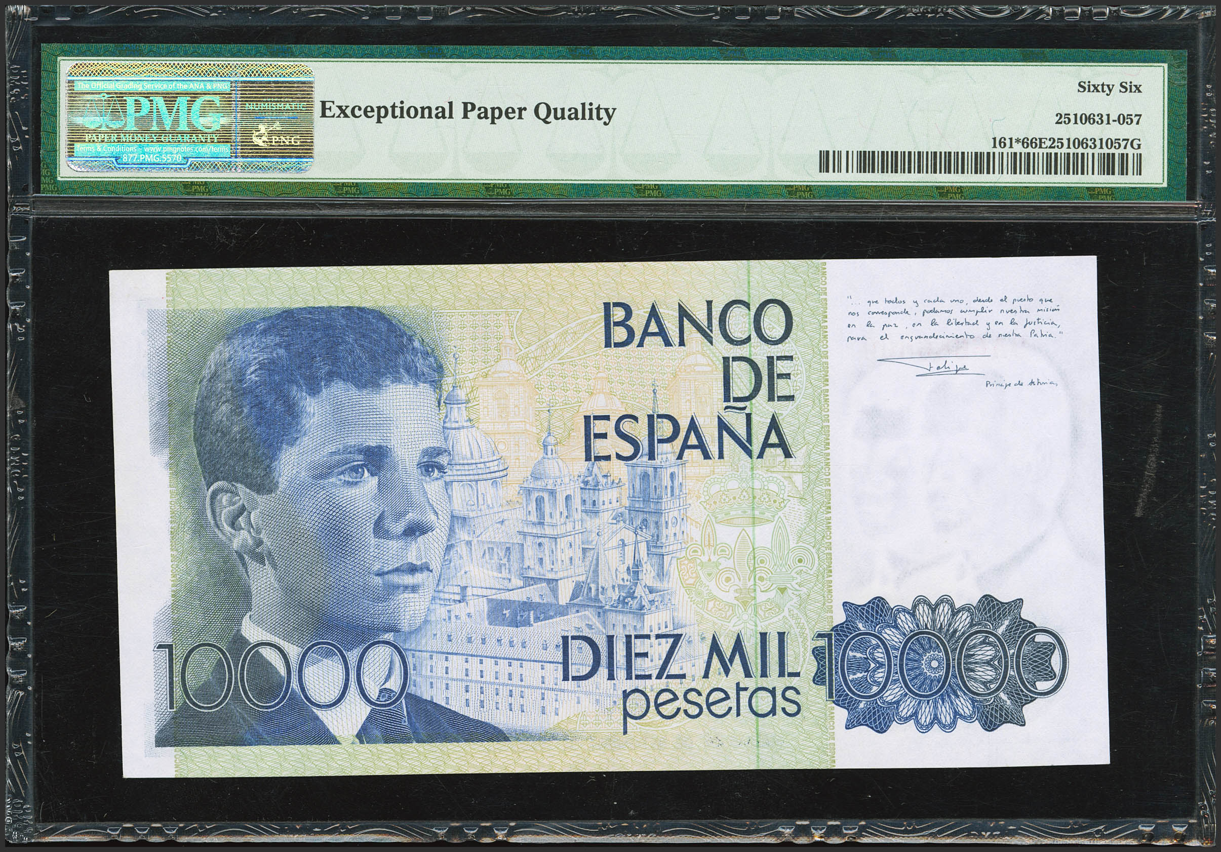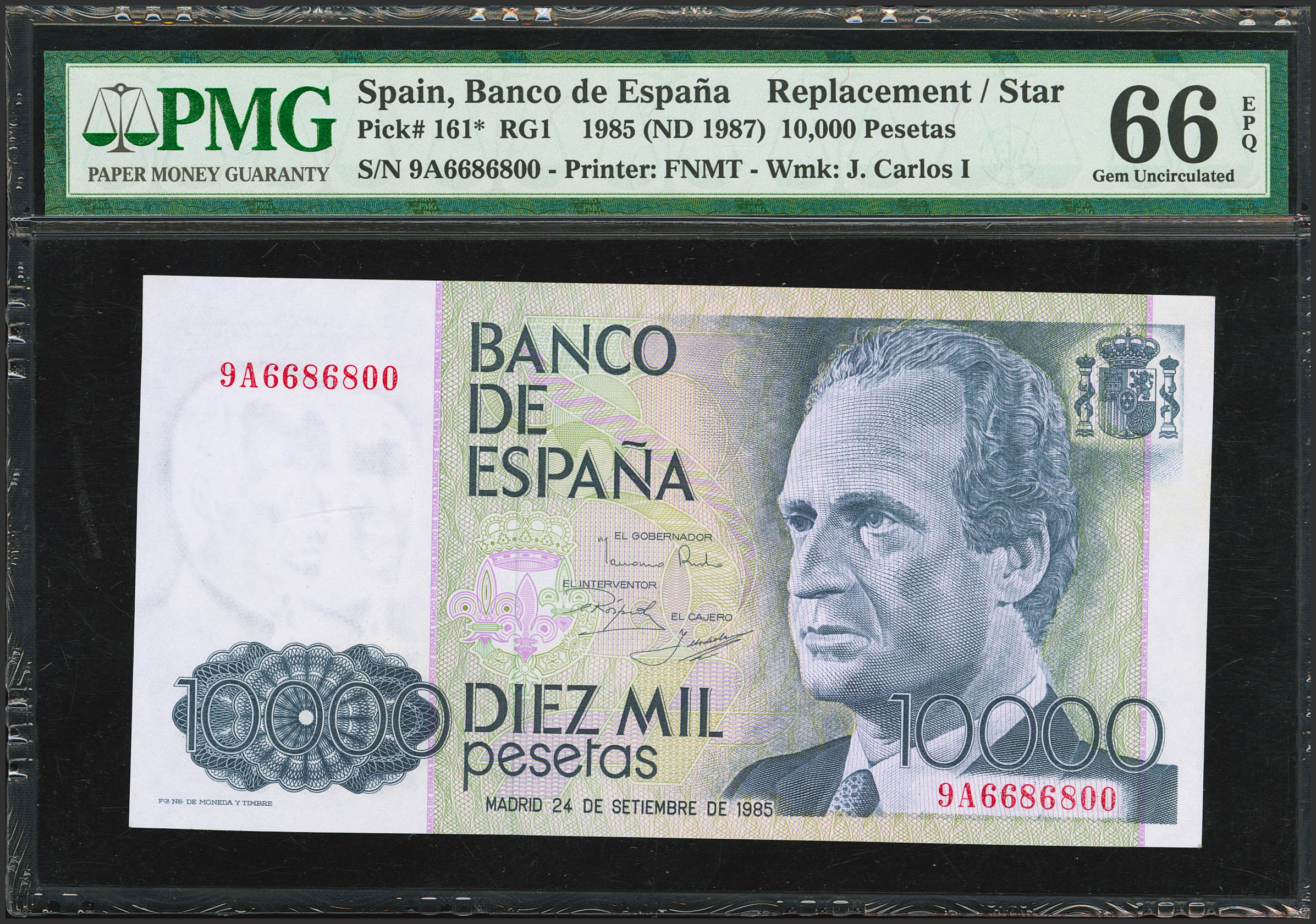 English 10,000 Pesetas. September 24, 1985. Special Series 9A. (Edifil 2021: 481b, Pick: 161*). Rare in this exceptional condition. Uncirculated. Packaged in PMG66EPQ.