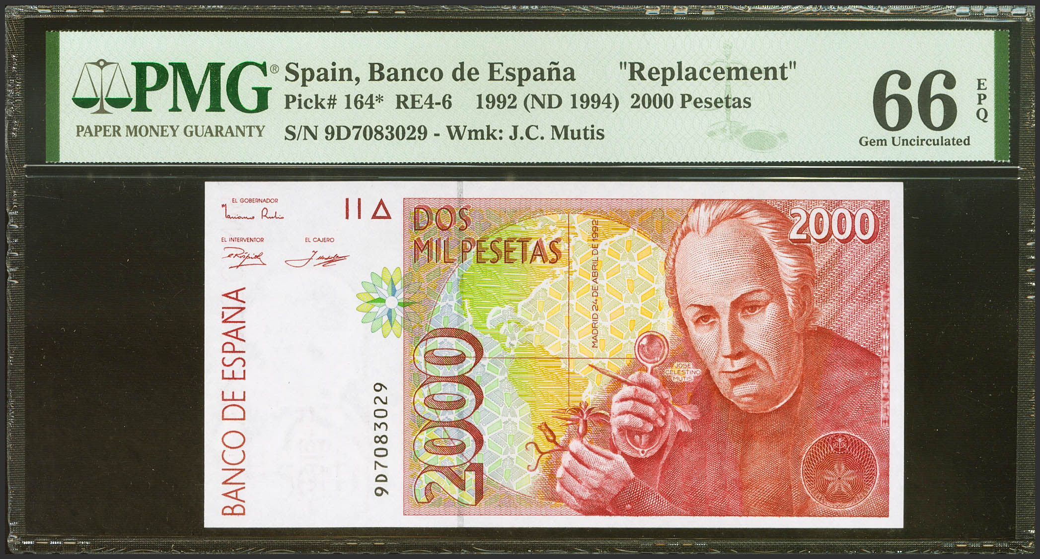 English 2000 Pesetas. April 24, 1992. Special Series 9D. (Edifil 2023: 482Ae, Pick: 164*). Rare in this exceptional condition. Uncirculated. Packaged in PMG66EPQ.