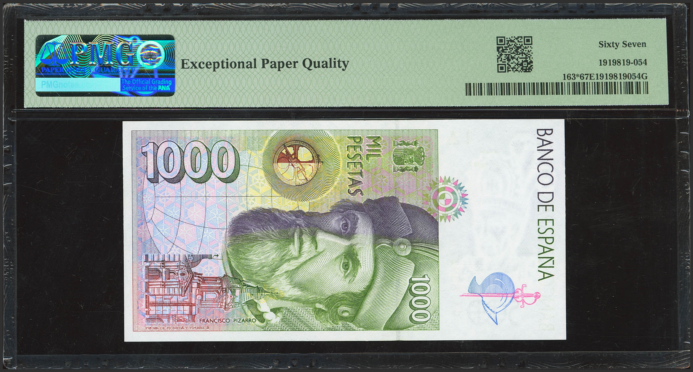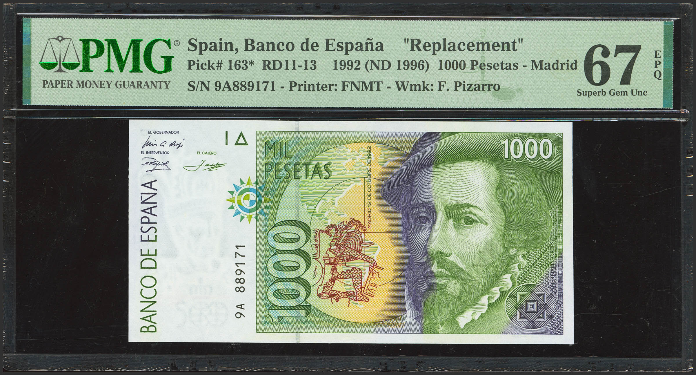 1000 Pesetas. October 12, 1992. Special Series 9A. (Edifil 2023: 483c, Pick: 163*). Uncirculated. PMG67EPQ package.