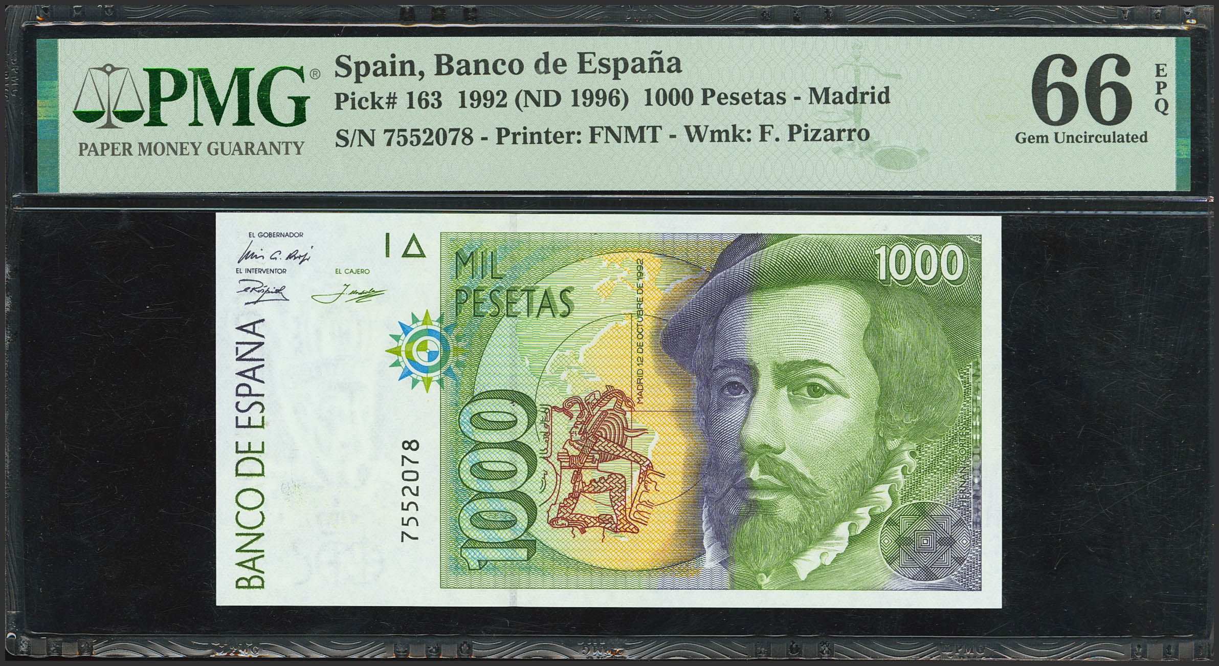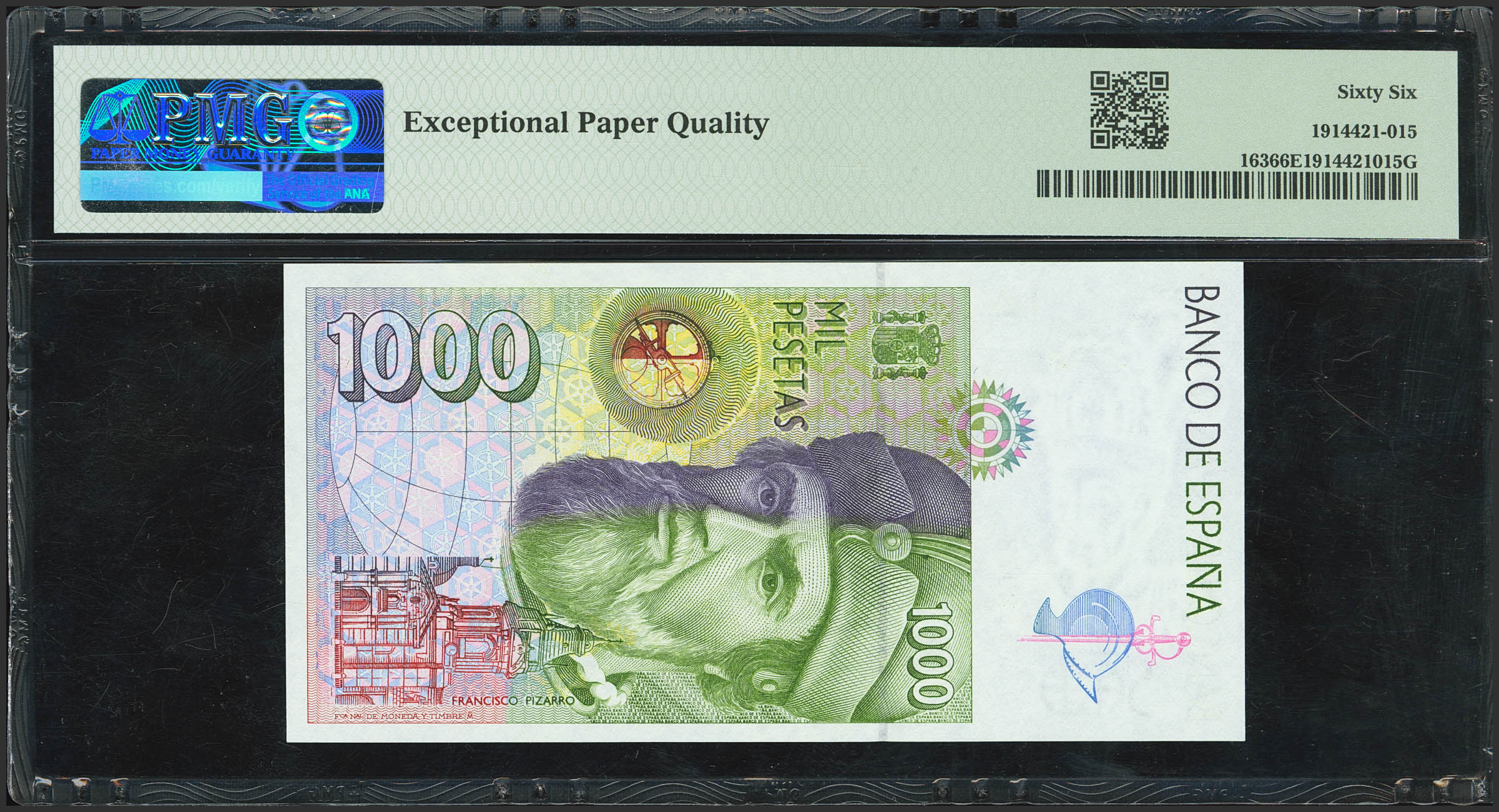 1000 Pesetas. October 12, 1992. No serial number. (Edifil 2021: 483, Pick: 163). Original finish. Uncirculated. PMG66EPQ package.