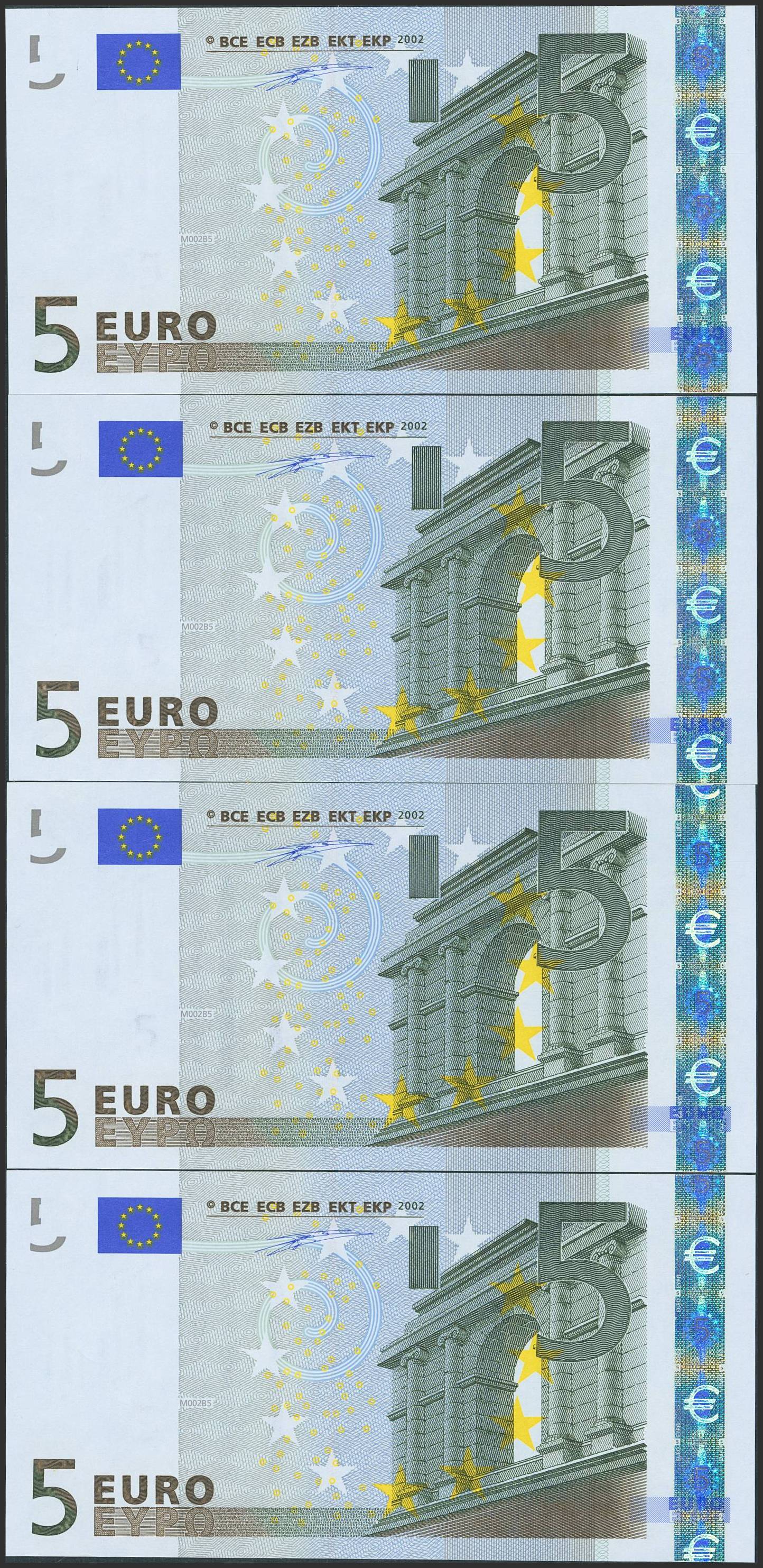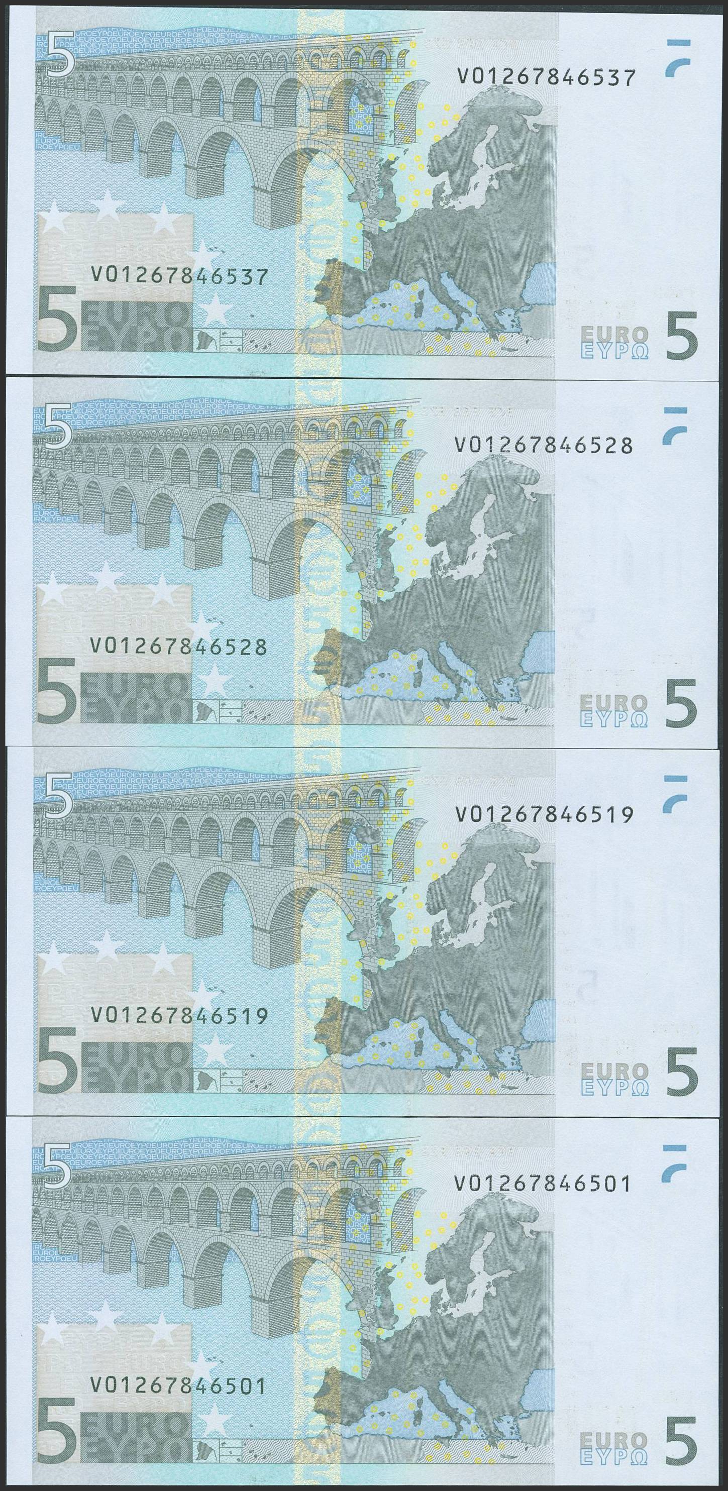 Set of 4 consecutive 5 Euro banknotes, issued on 1 January 2002, (it should be noted that the last digit of the serial number of all euro banknotes is for internal control by the European Central Bank; the penultimate digit indicates the serial number of the banknotes) with the Duisenberg signature and Series V (Spain), (Edifil 2023: 486). Uncirculated/Uncirculated-.