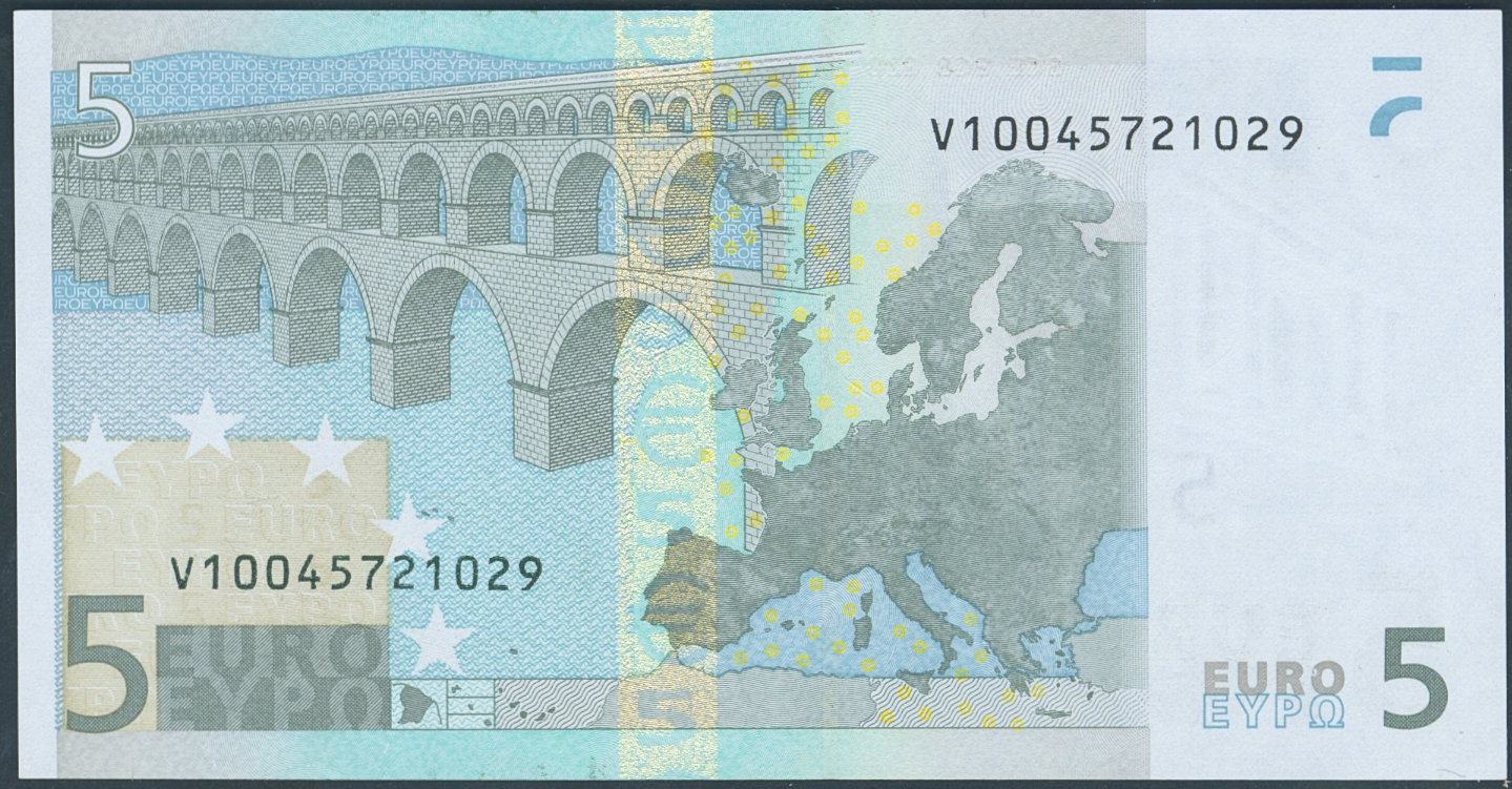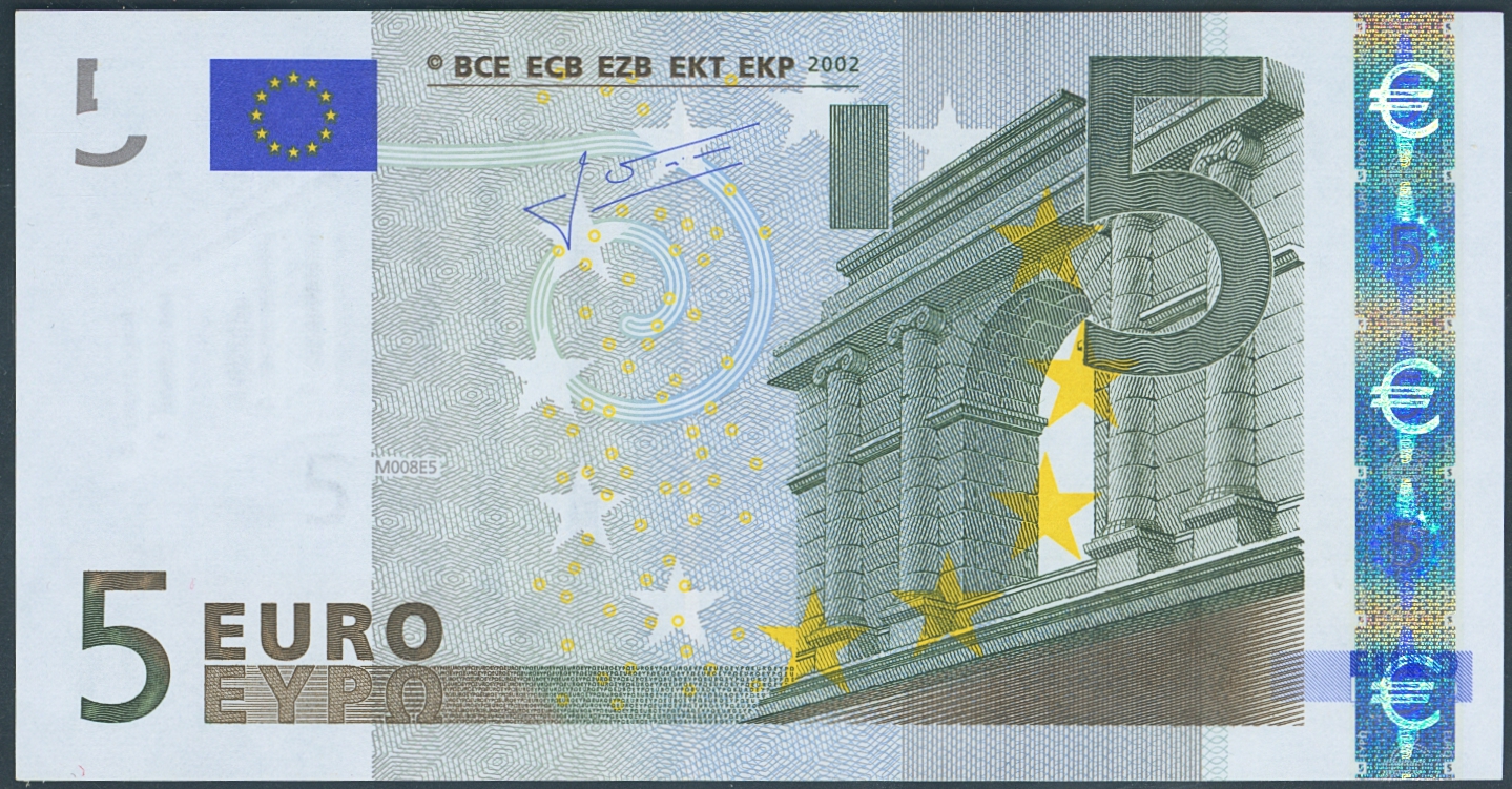 5 Euros. January 1, 2002. Trichet signature. Series V (Spain). (Edifil 2023: 486A). Uncirculated.