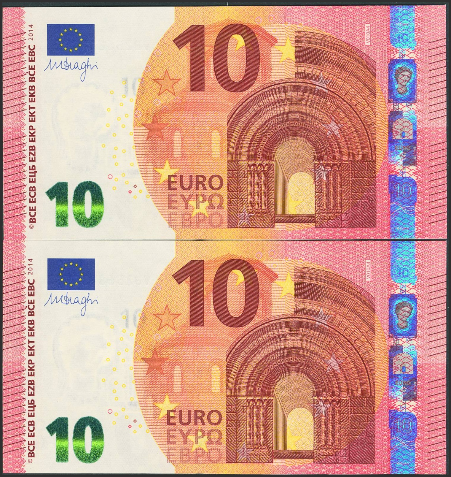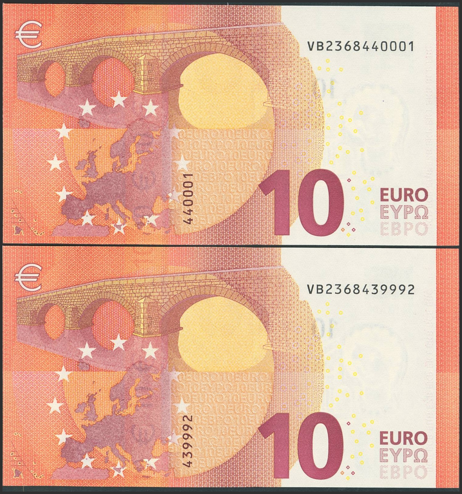 English 10 Euros. September 23, 2014. Consecutive pair (it should be noted that the last digit in the serial number of all euro banknotes is for the internal control of the European Central Bank; the penultimate digit is the one that determines the serial number of the banknotes). Signature Drahgi. Series VB (Spain). (Edifil 2023: 494a, Pick: 21v). Uncirculated.