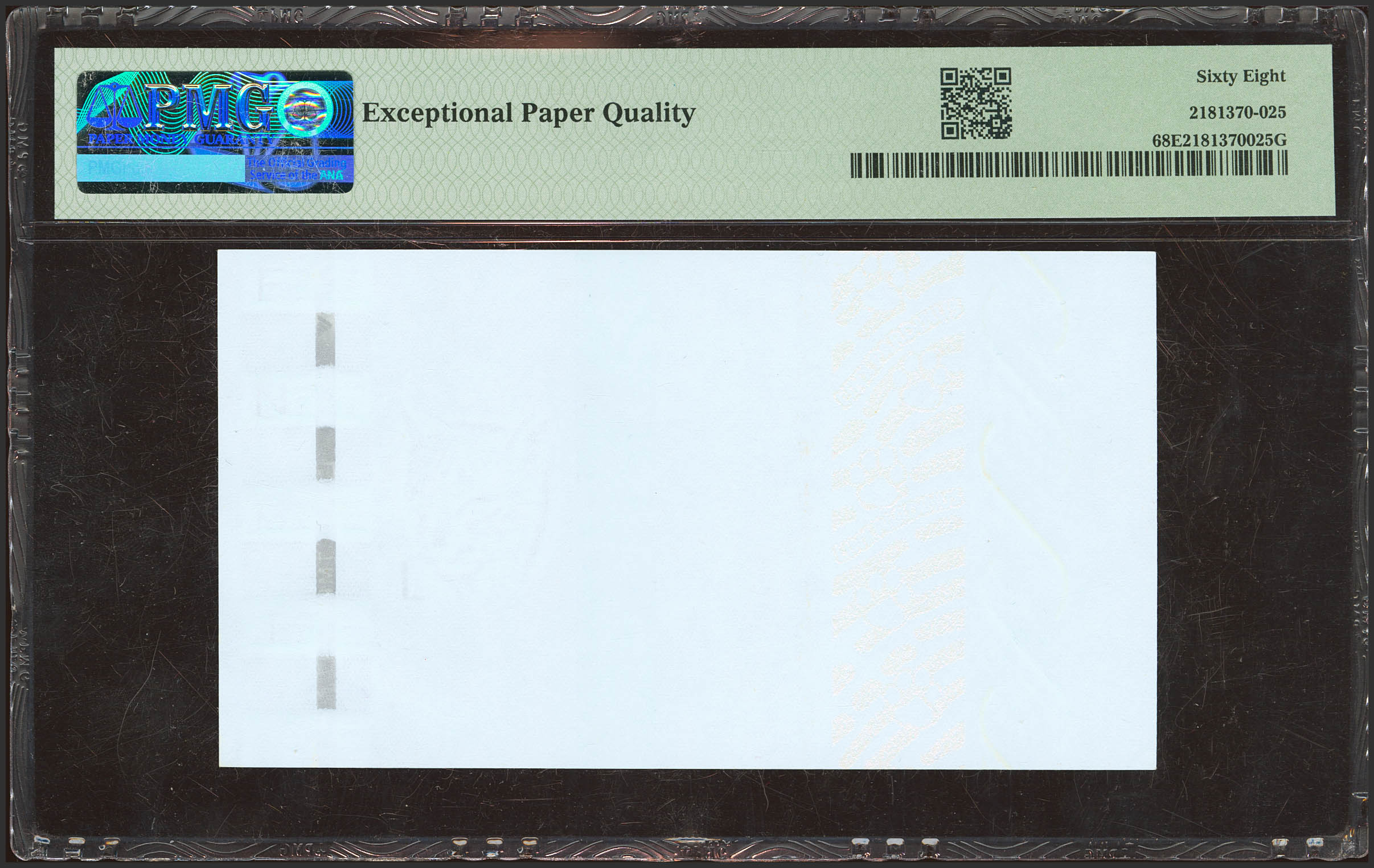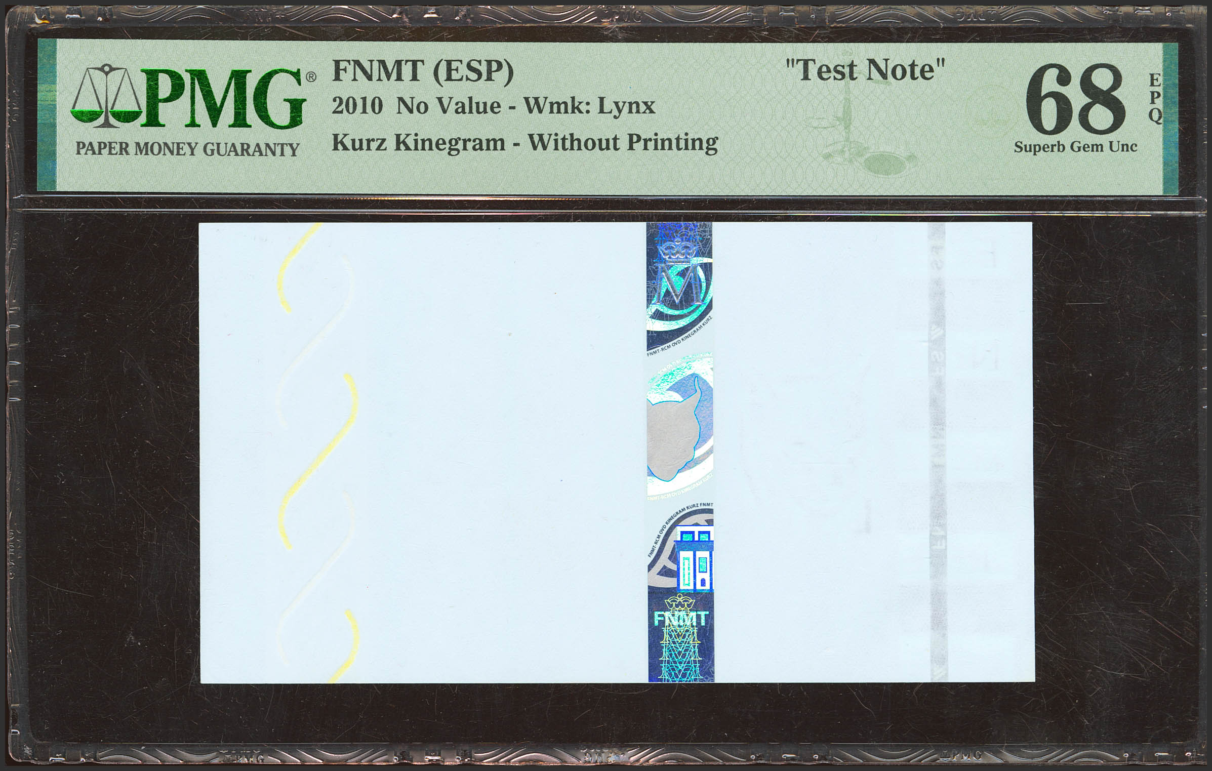 Proof banknote from the FNMT (Spanish Royal Mint) issued in 2010, dedicated to the Iberian lynx, in an intermediate stage highlighting the security features incorporated into the FNMT-Burgos paper, especially: the Tactocel™ system (patented by the FNMT) with UV-tinted reliefs suitable for the blind and a foil strip with OVD (Kinegram) holograms in full color. (Edifil 2023: 1P). Rare. Uncirculated. Encapsulated PMG68EPQ.