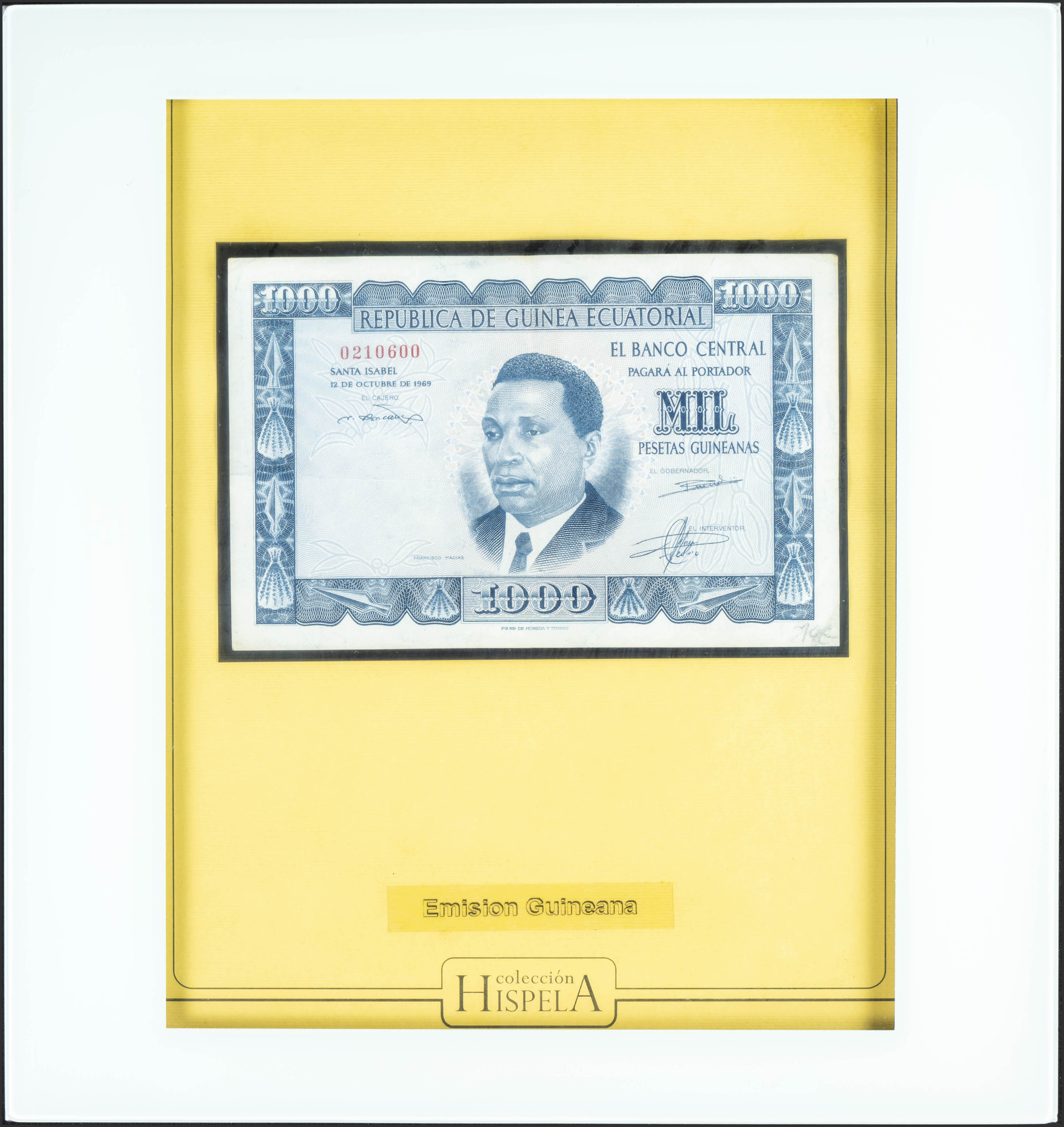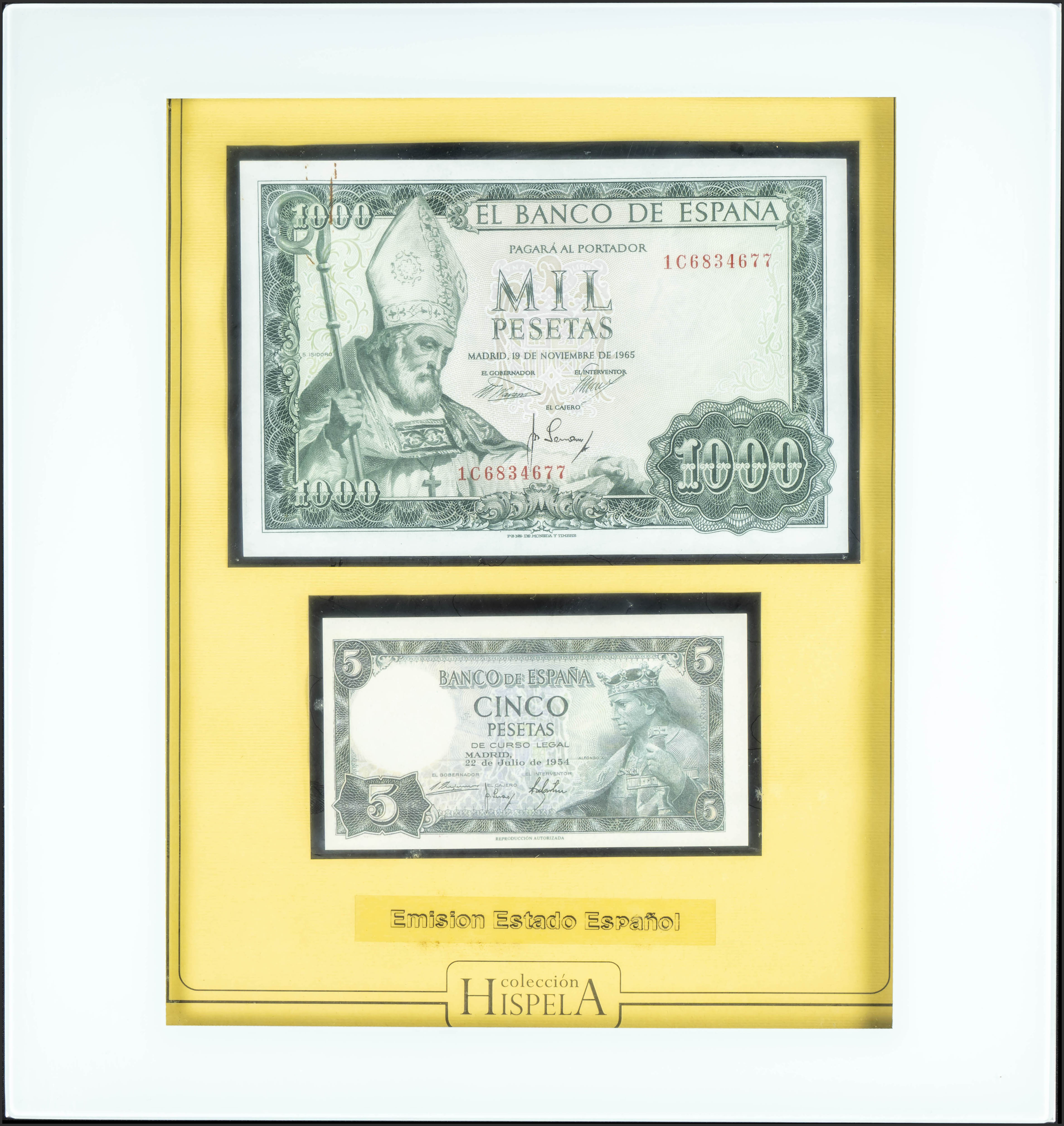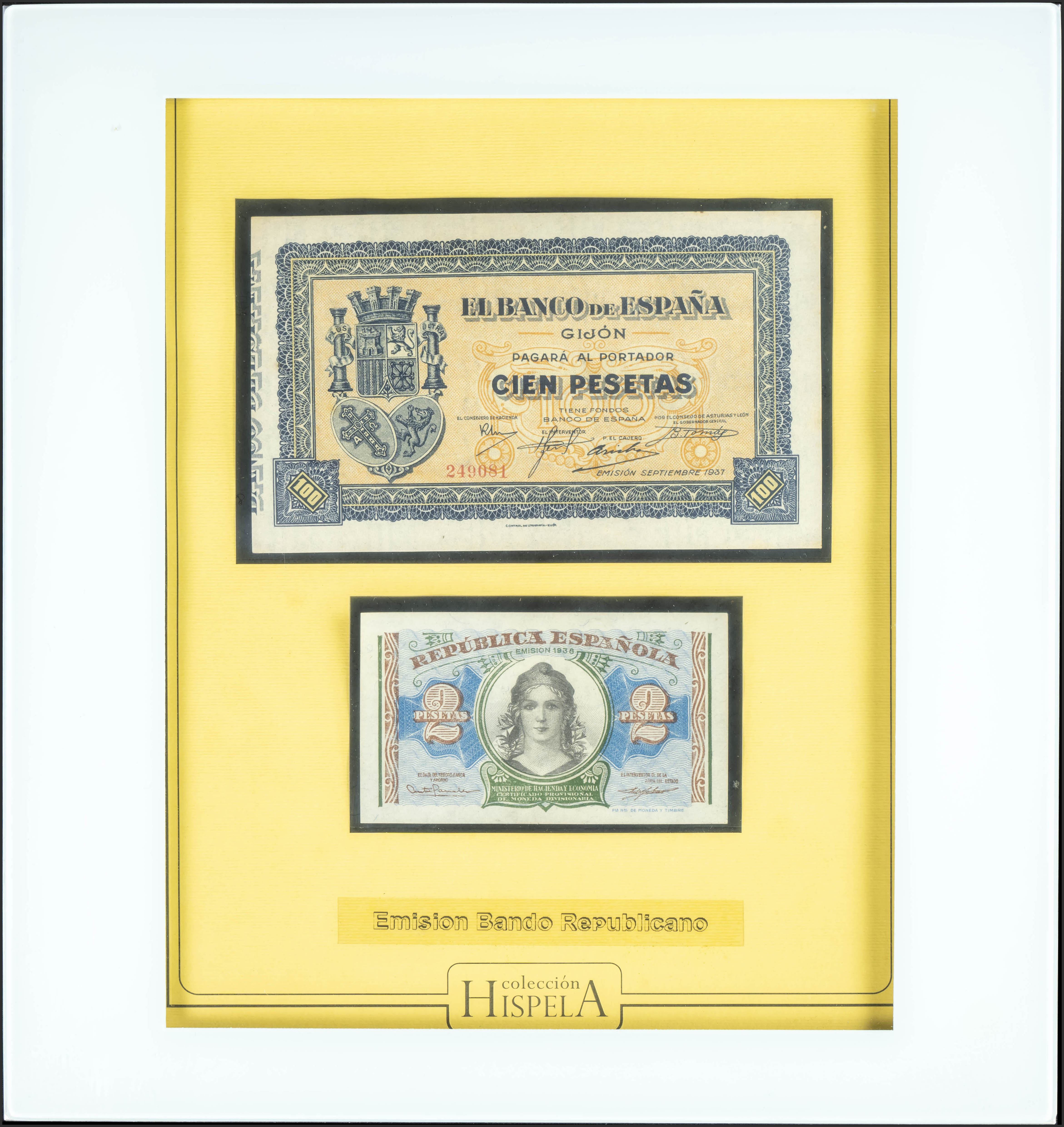 A set of 13 banknotes from the Bank of Spain, the Bank of Guinea, or from the Civil War era, of different issues, in various qualities, and presented in beautiful metal displays. For examination.