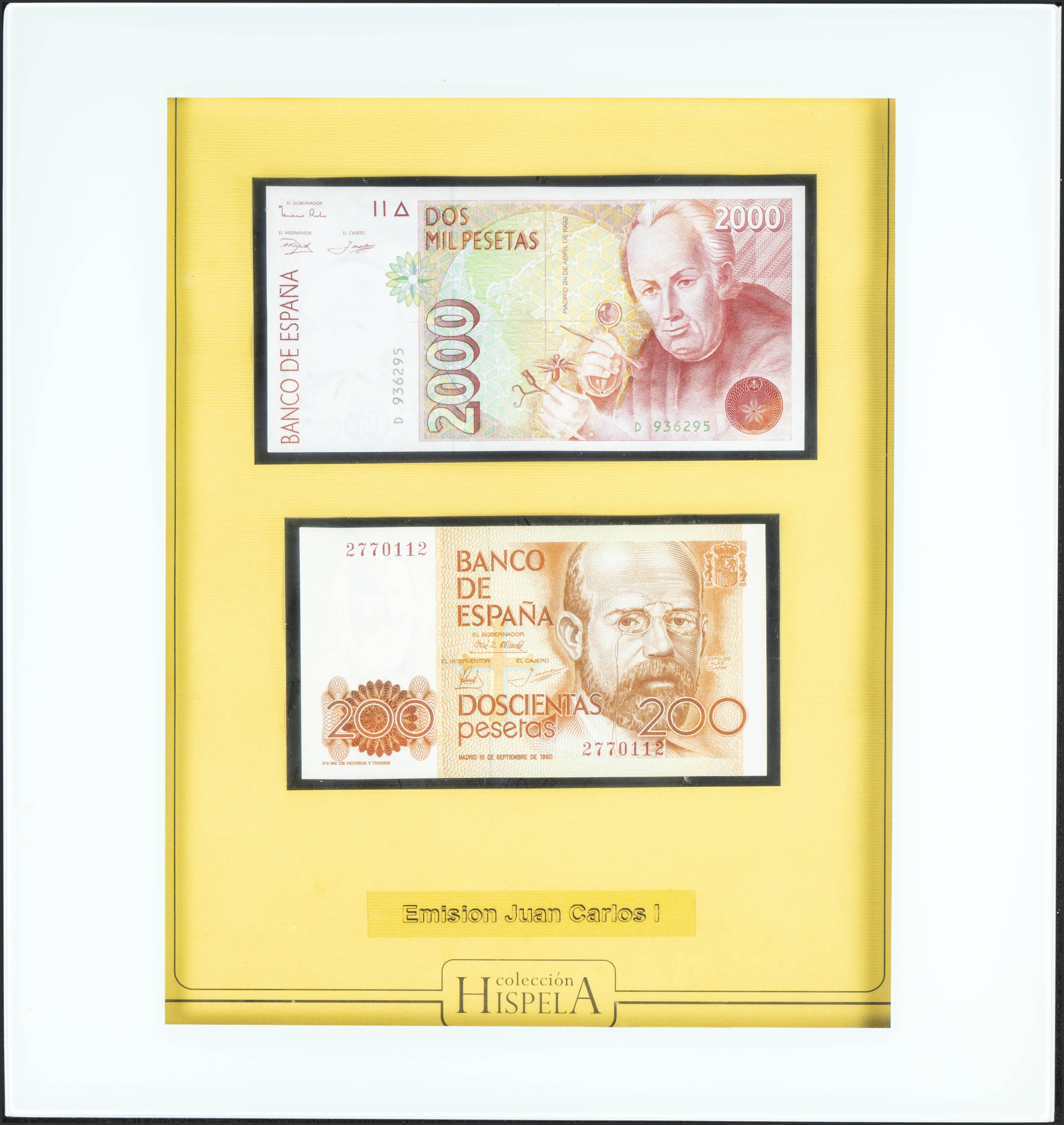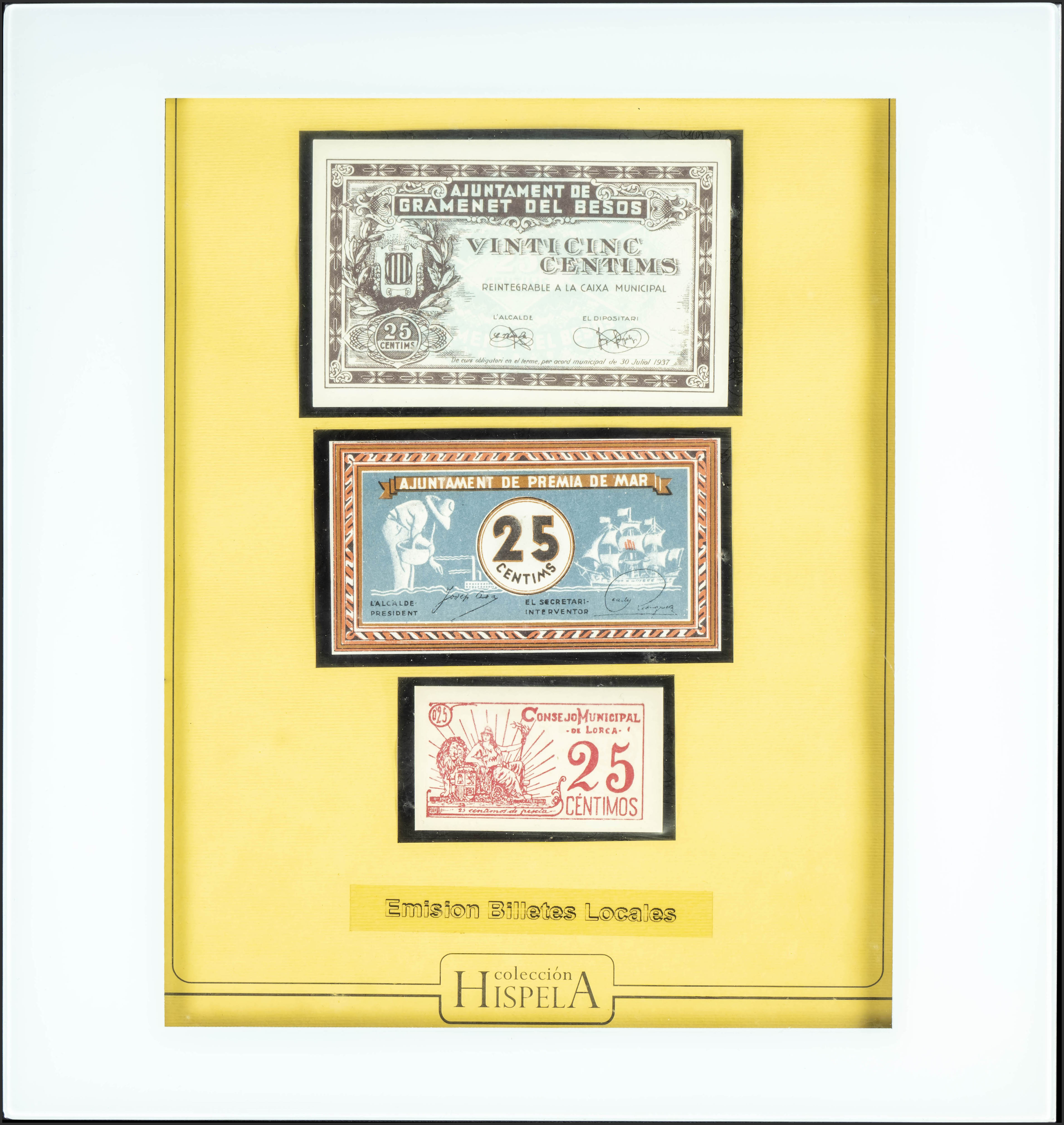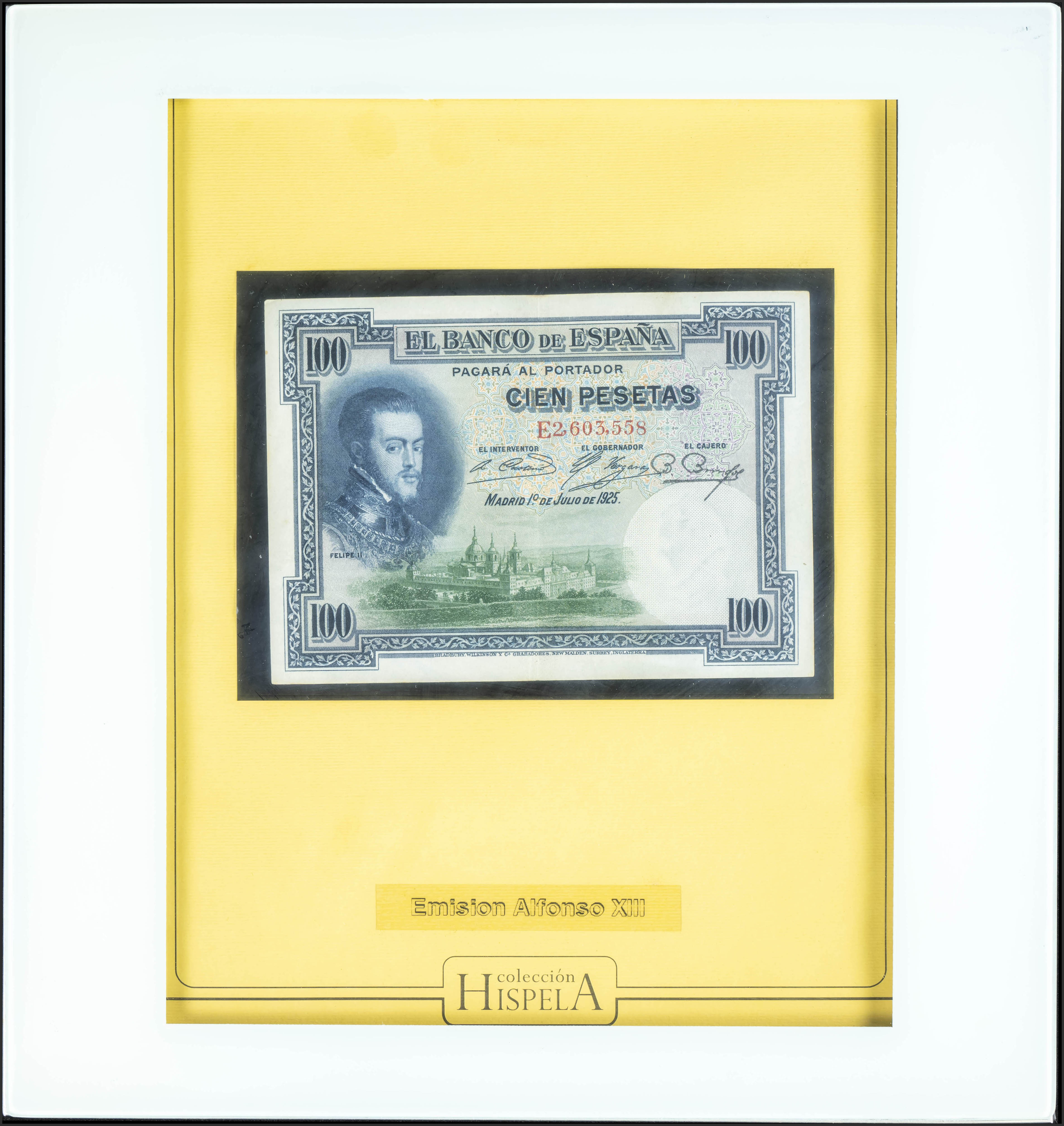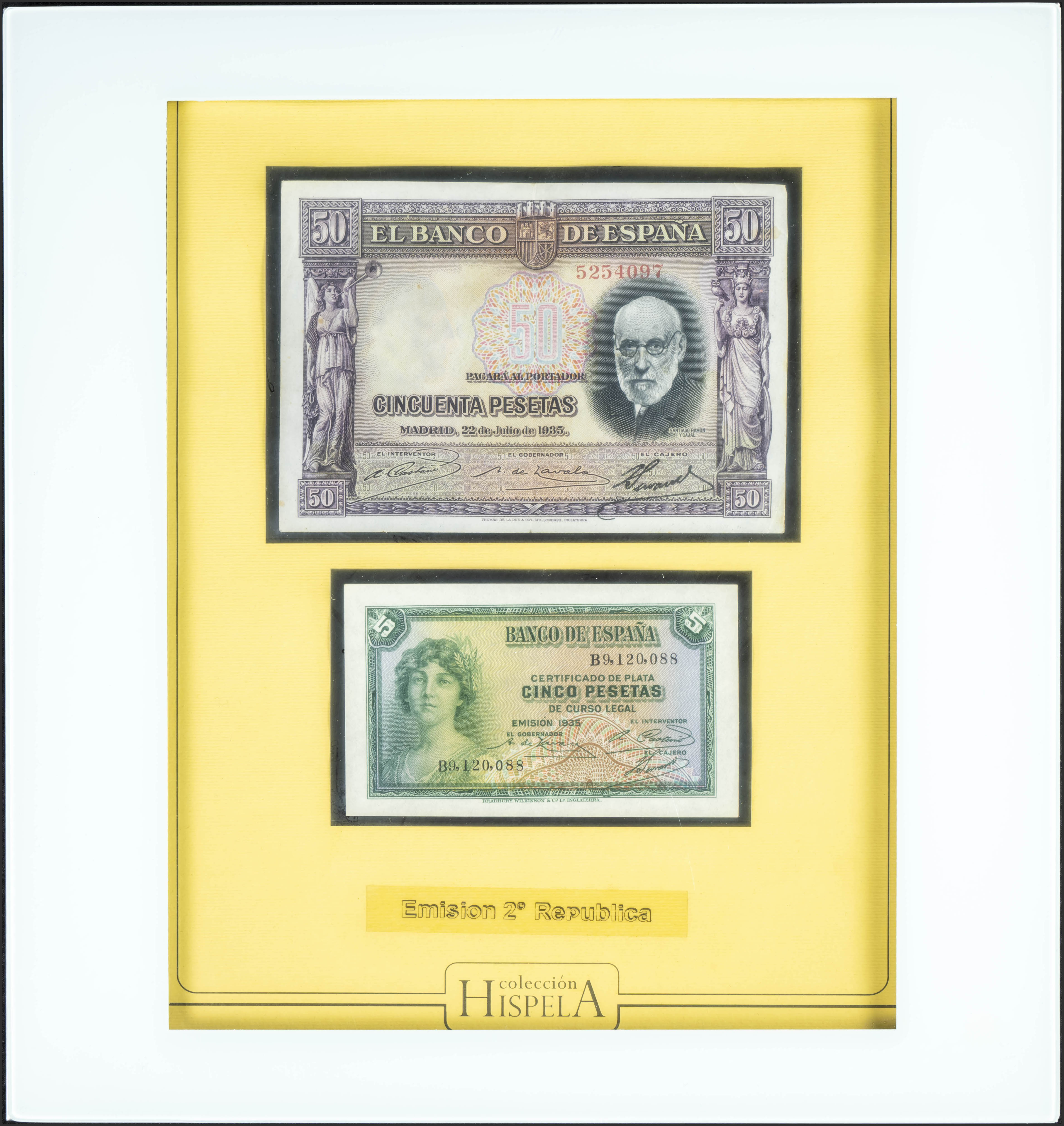 A set of 13 banknotes from the Bank of Spain, the Bank of Guinea, or from the Civil War era, of different issues, in various qualities, and presented in beautiful metal displays. For examination.