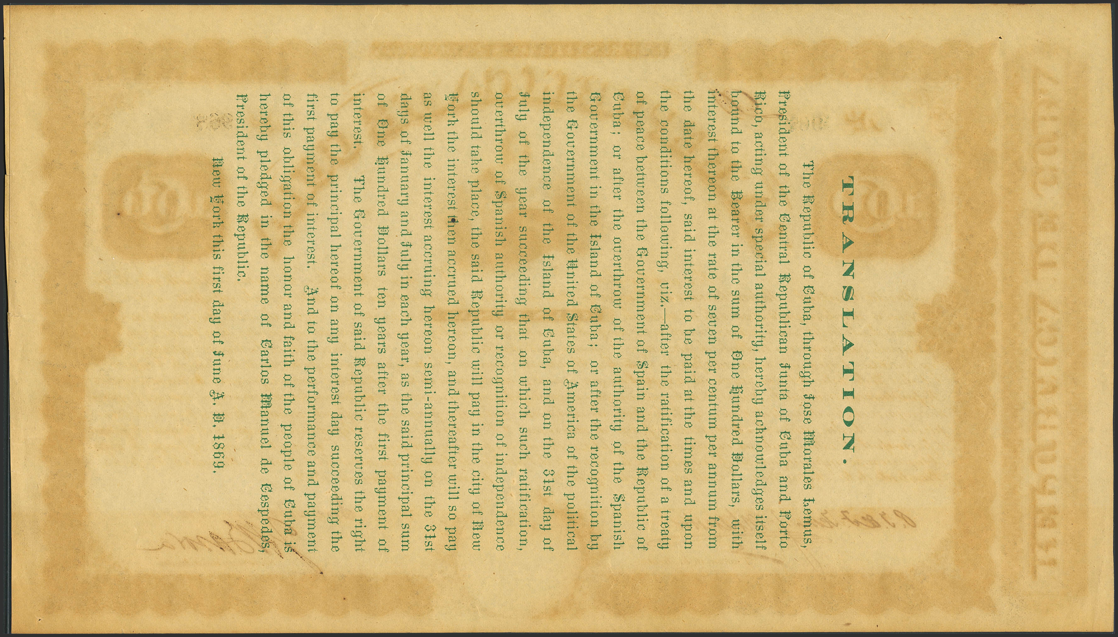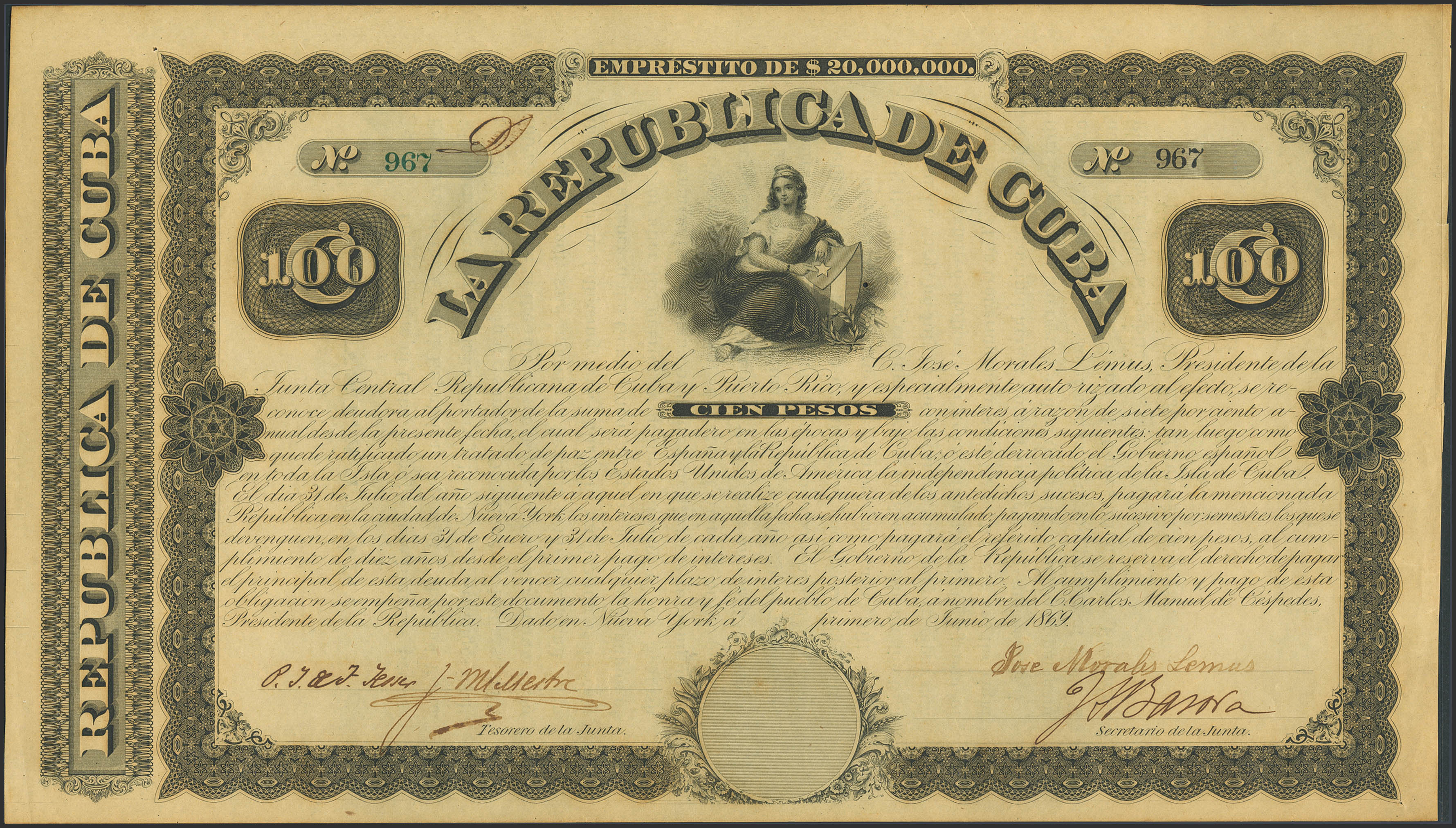 English Loan of the Republic of Cuba and Puerto Rico. 100 Pesos. June 1, 1869. This loan was issued at the beginning of the Ten Years' War in Cuba (1868-78) to raise funds for the liberation of Cuba and Puerto Rico from Spain. (Echenagusía: Page 80, Cuba Museum: A-06, PMUncirculatedP: Page 102). Rare, moth damage and typical age spots. EF+++.