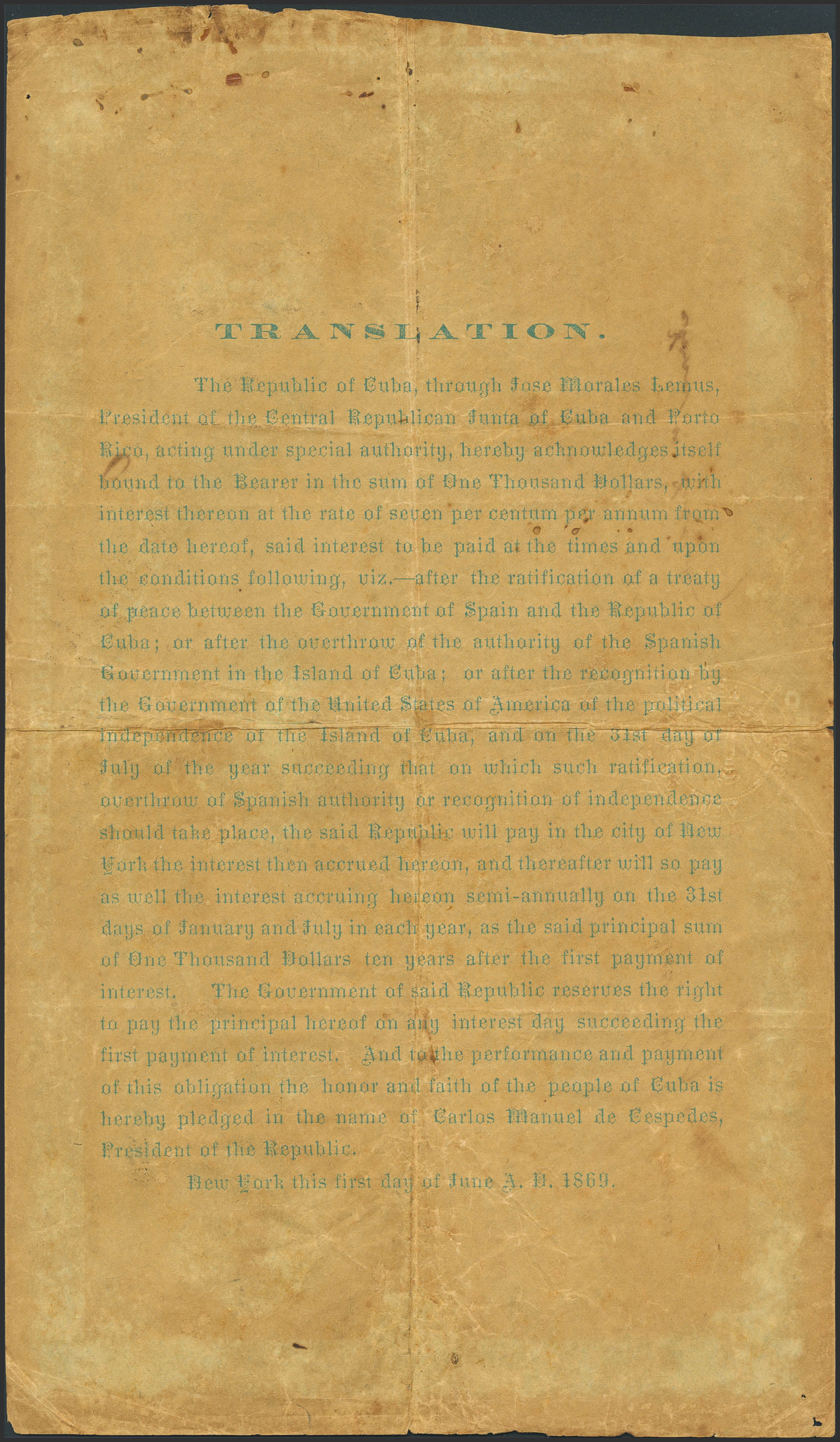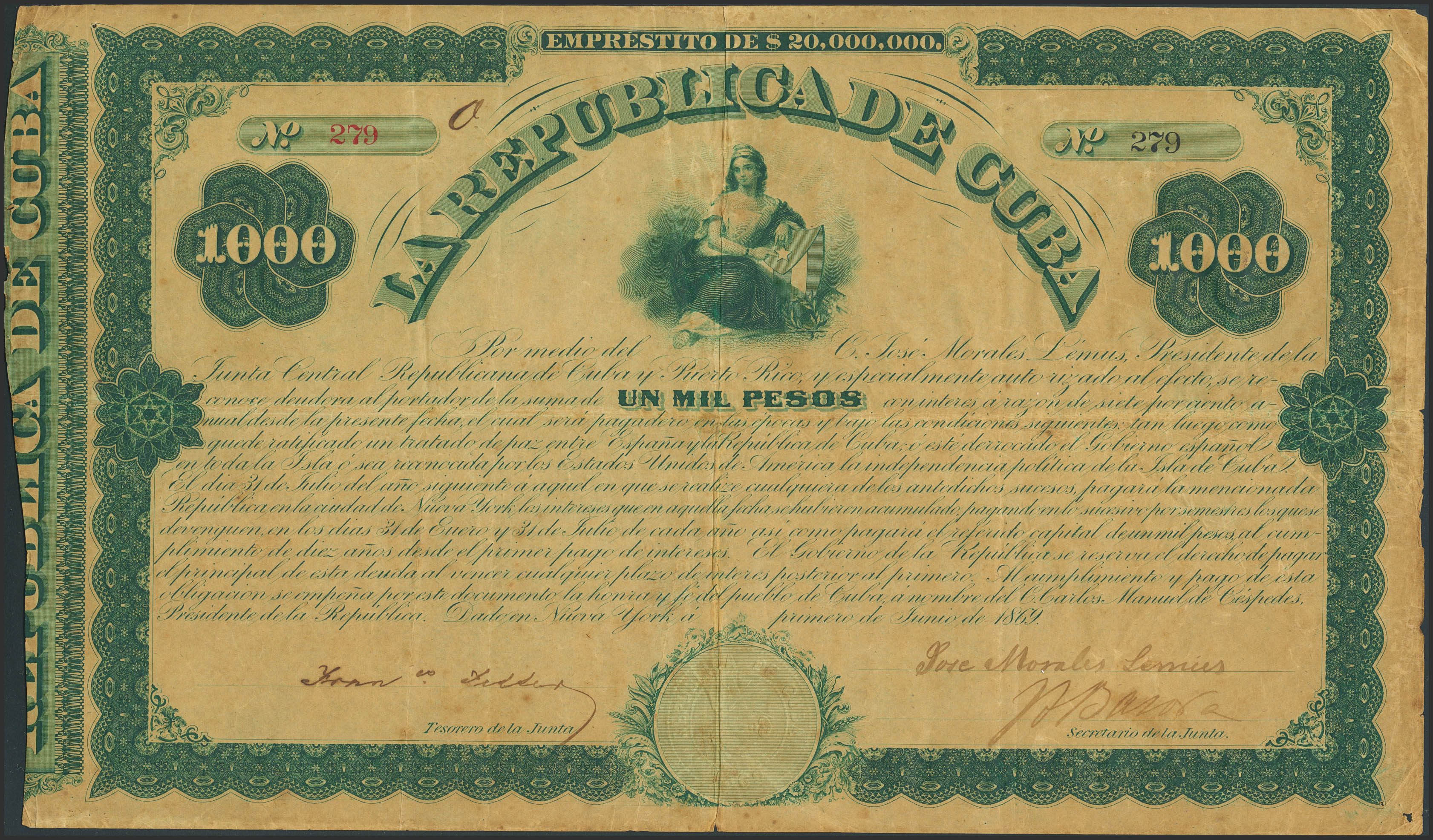 LOAN OF THE REPUBLIC OF CUBA AND PUERTO RICO. 1000 Pesos. June 1, 1869. This loan was issued at the beginning of the Ten Years' War in Cuba (1868-78) to raise funds for the liberation of Cuba and Puerto Rico from Spain. (Echenagusía: Page 80, Cuba Museum: A-08, PMUncirculatedP: Page 104). Rare, with the usual moth spots and age stains. VF-.