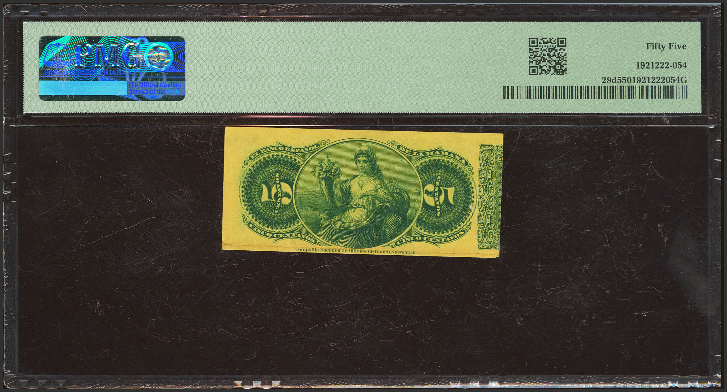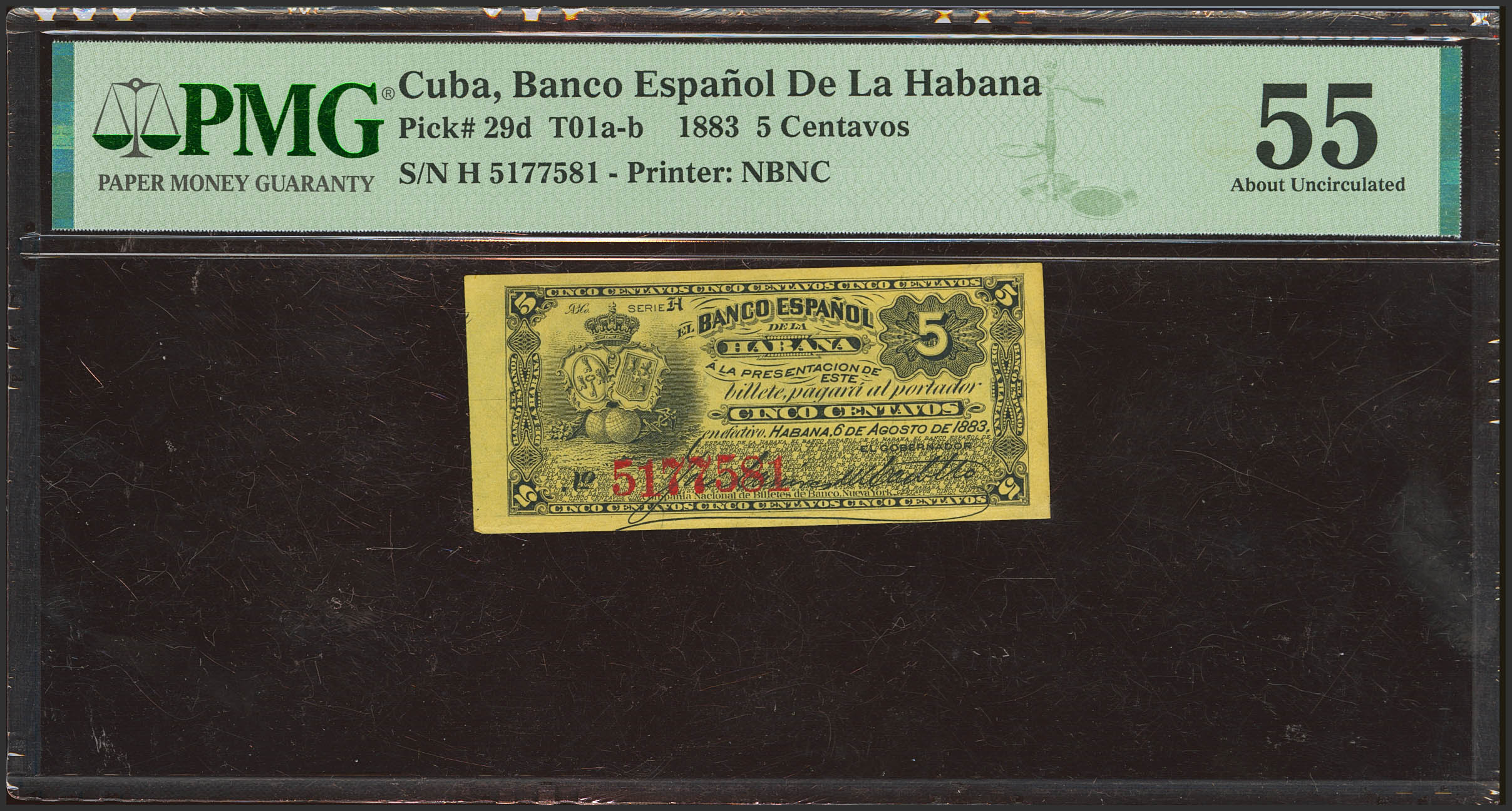English Spanish Bank of Havana. 5 Centavos. August 6, 1883. Series H. (Edifil 2023: 43). Rare. EF+. PMG55 encapsulated.