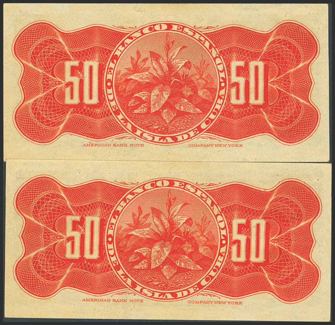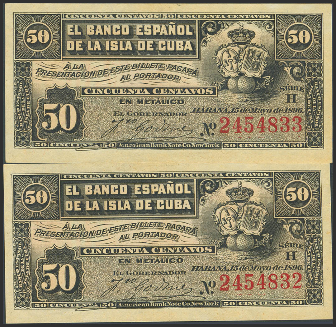 English SPANISH BANK OF THE ISLAND OF CUBA. 50 Centavos. Consecutive pair. May 15, 1896. Series H. (Edifil 2023: 70). Toned. Uncirculated-.