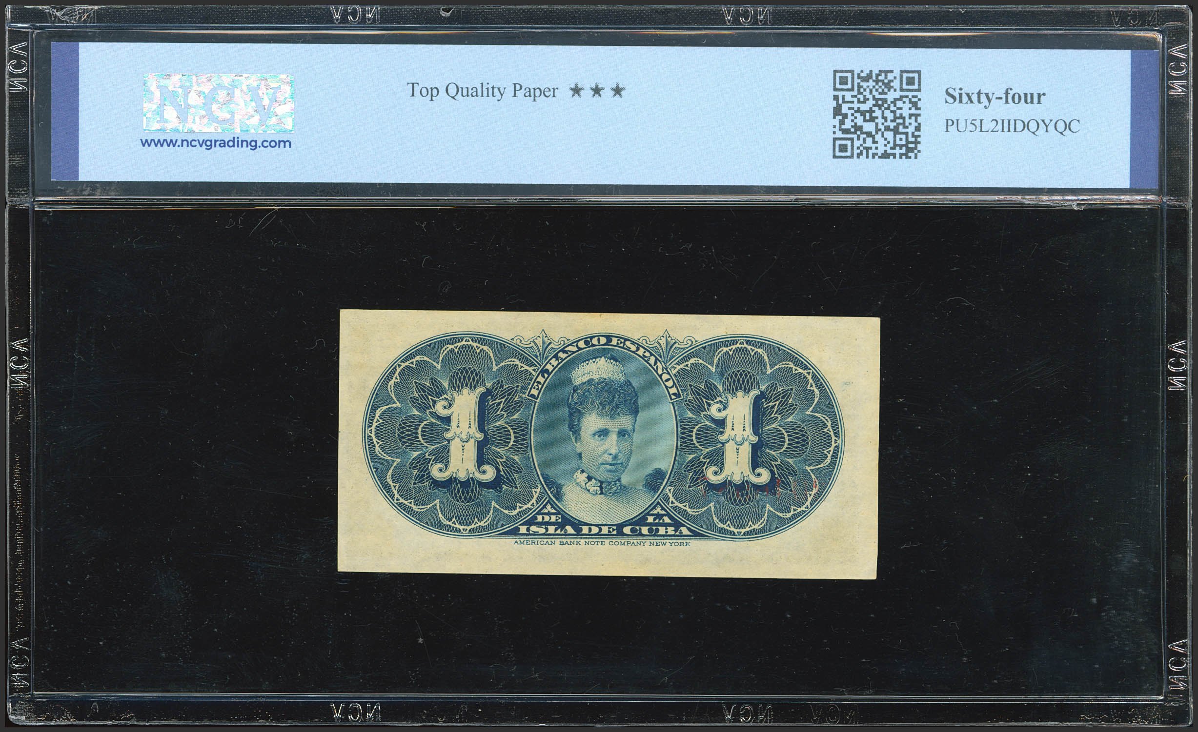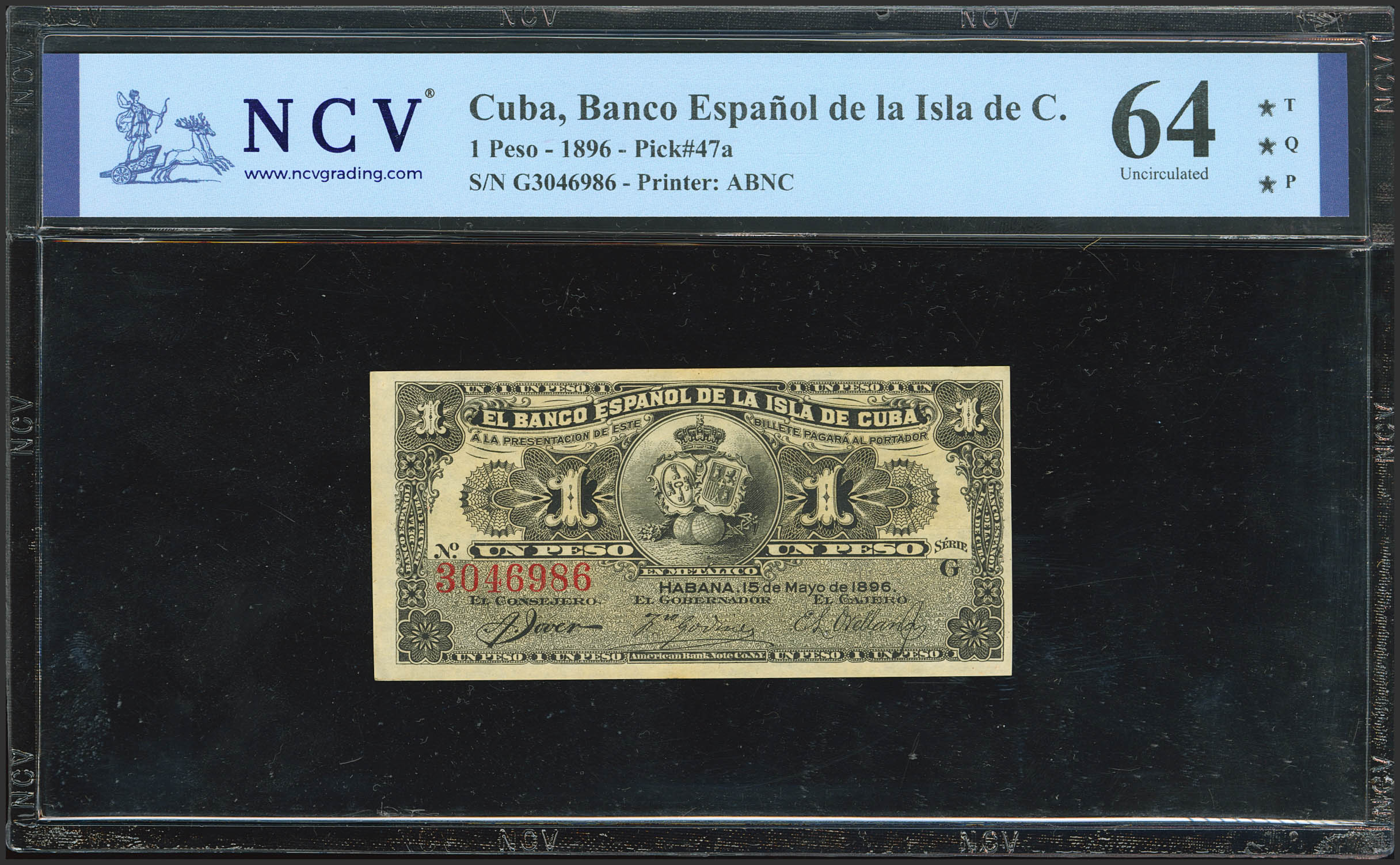 SPANISH BANK OF THE ISLAND OF CUBA. 1 Peso. May 15, 1896. Series G. (Edifil 2023: 71, Pick: 47a). Original finish. Uncirculated. Encapsulated NCV64TQP.