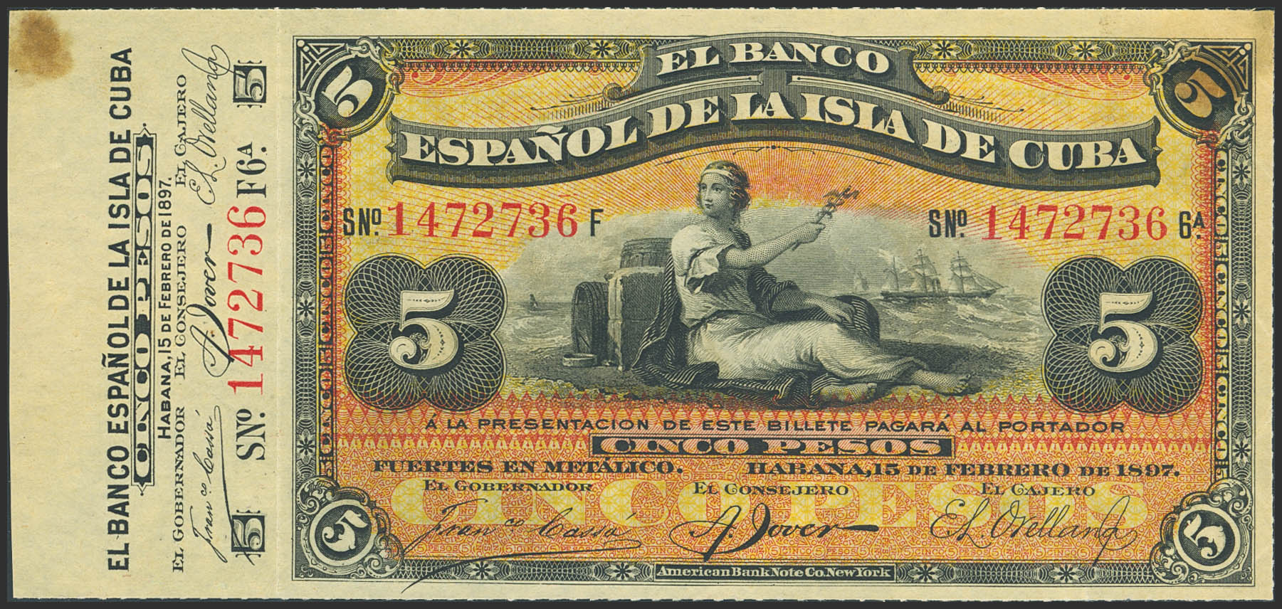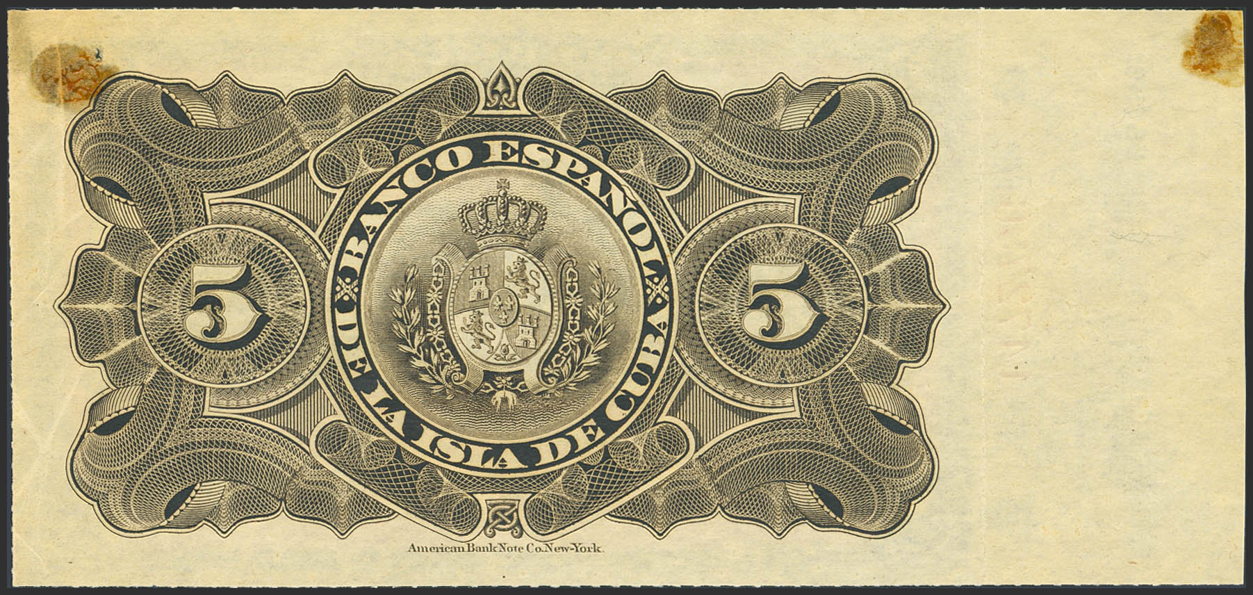 English SPANISH BANK OF THE ISLAND OF CUBA. 5 Pesos. February 13, 1897. Series F, matrix on the left. (Edifil 2023: 72). Original finish, very rare with the matrix, age spots and mounted. Uncirculated--.