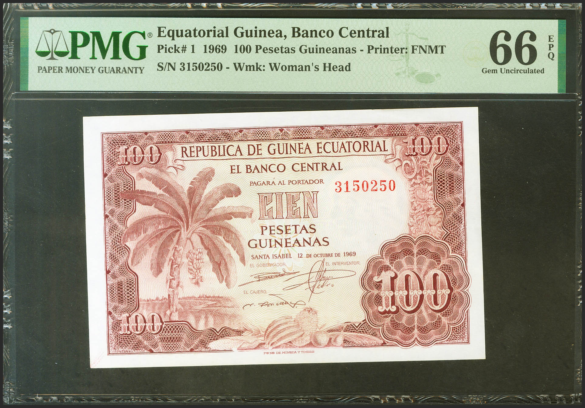 EQUATORIAL GUINEA. 100 Pesetas. October 12, 1969. No serial number. (Pick: 1). Rare in this exceptional condition, original finish. Uncirculated. Encapsulated PMG66EPQ.