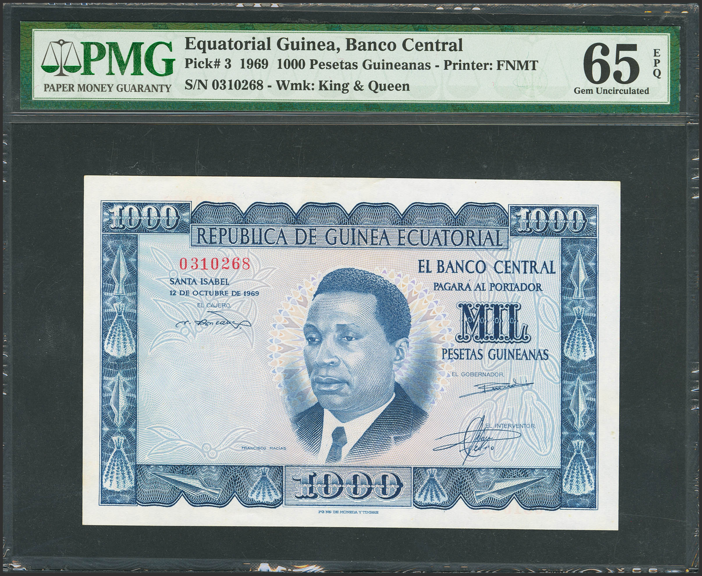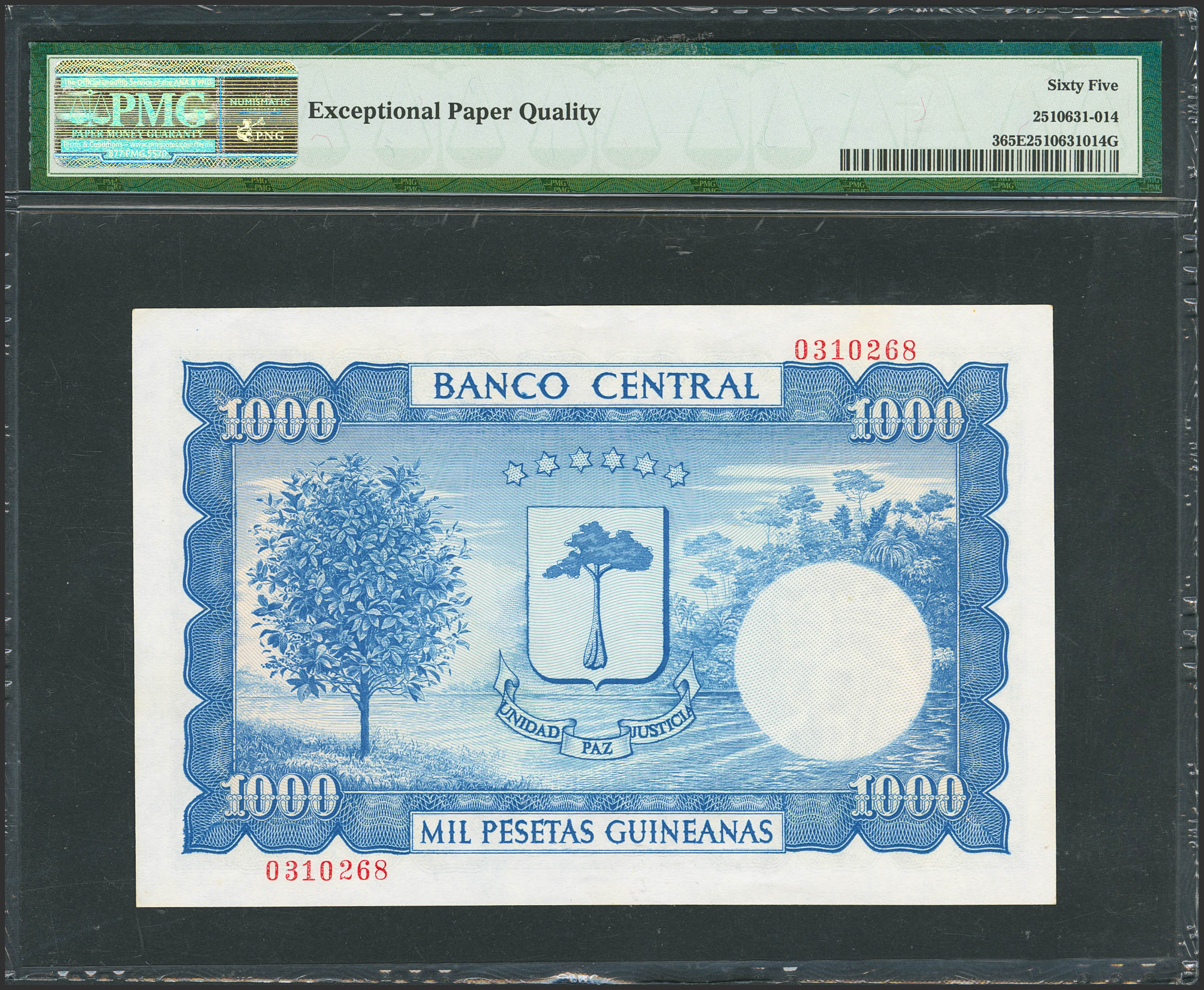 EQUATORIAL GUINEA. 1000 Pesetas. October 12, 1969. No serial number. (Pick: 3). Rare in this exceptional condition, original finish. Uncirculated. Encapsulated PMG65EPQ.