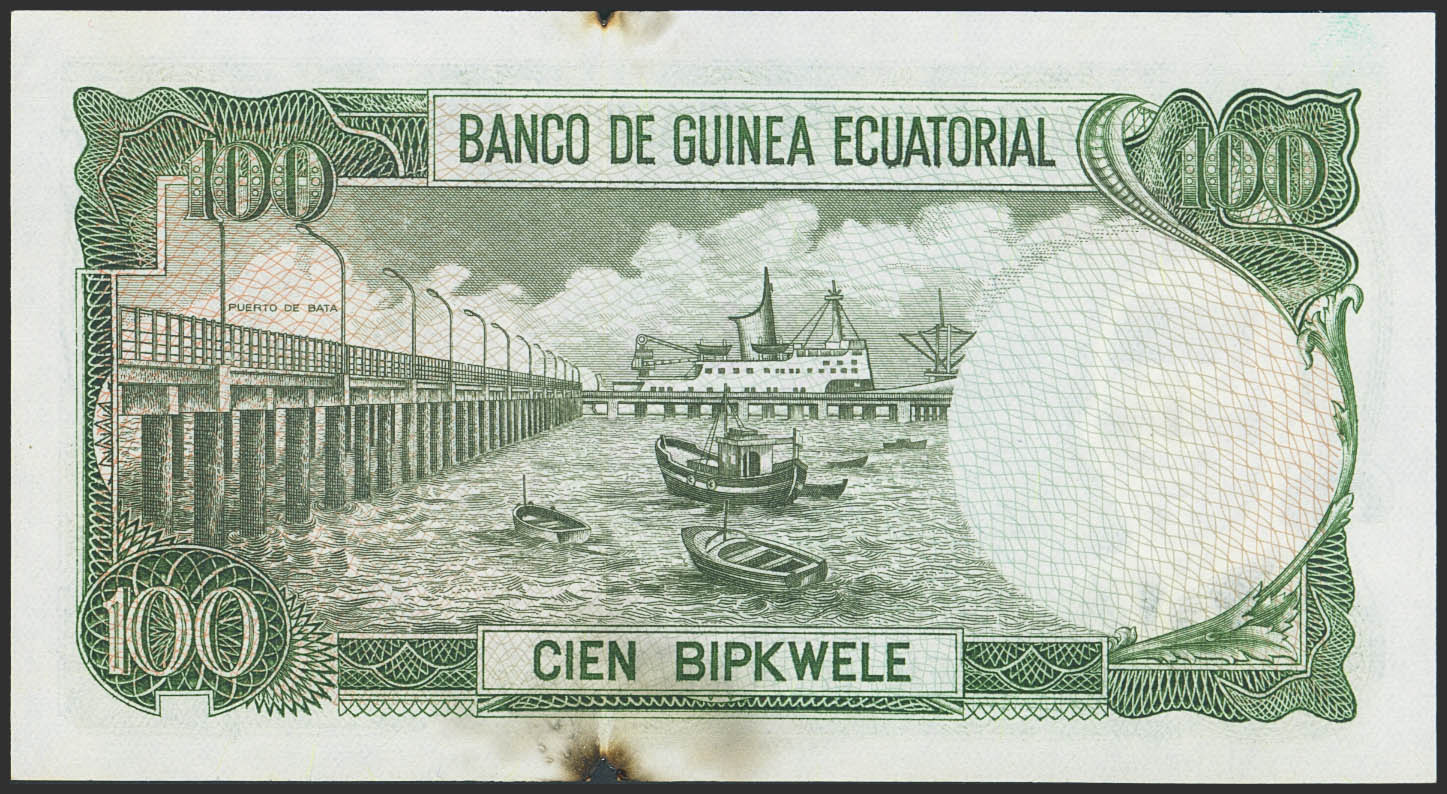 English EQUATORIAL GUINEA. 100 Bipkwele. August 3, 1979. (Pick: 14). Unusual, two small burns. Good Extremely Fine++.