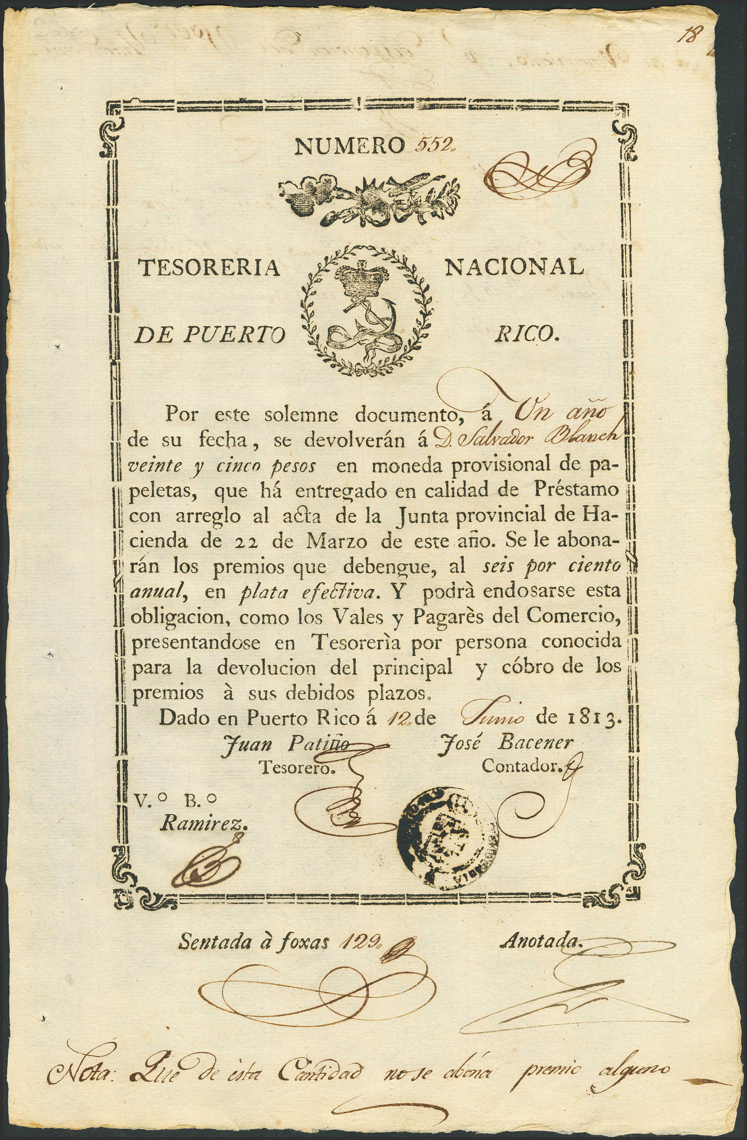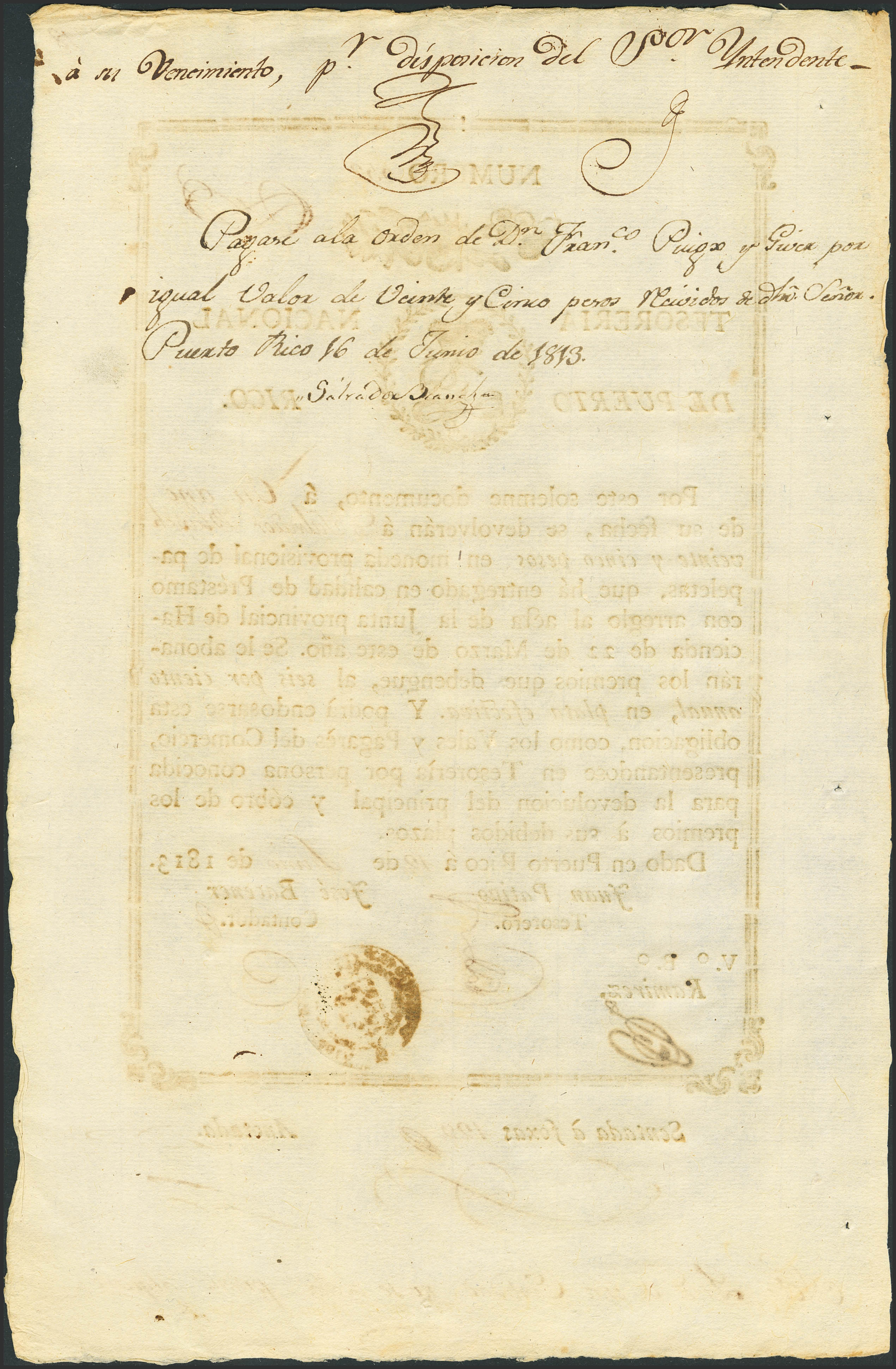 English PUERTO RICO. 25 Pesos. June 12, 1813. Royal Treasury. No series. (Edifil 2023: 4). Very rare. Uncirculated-.