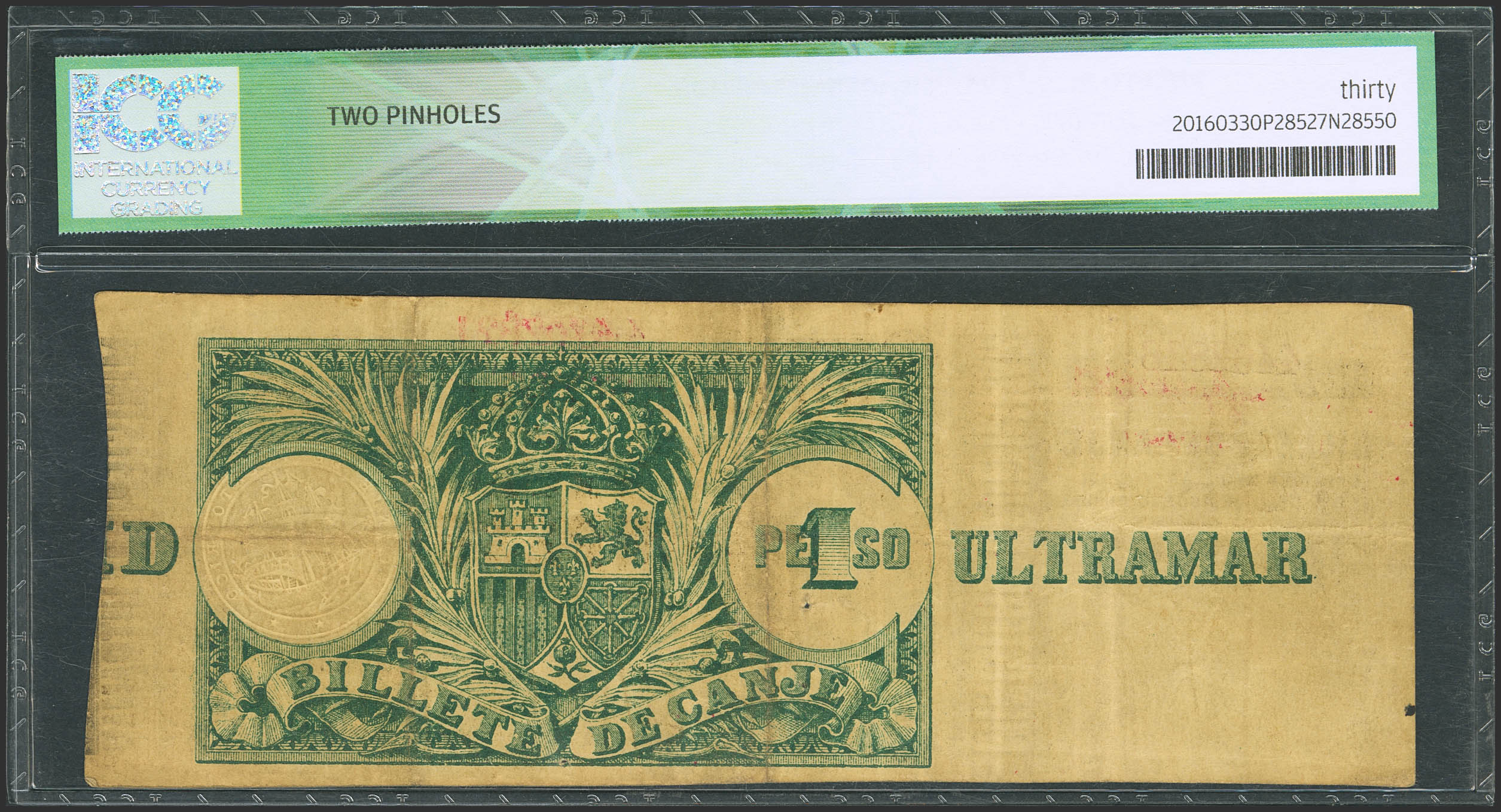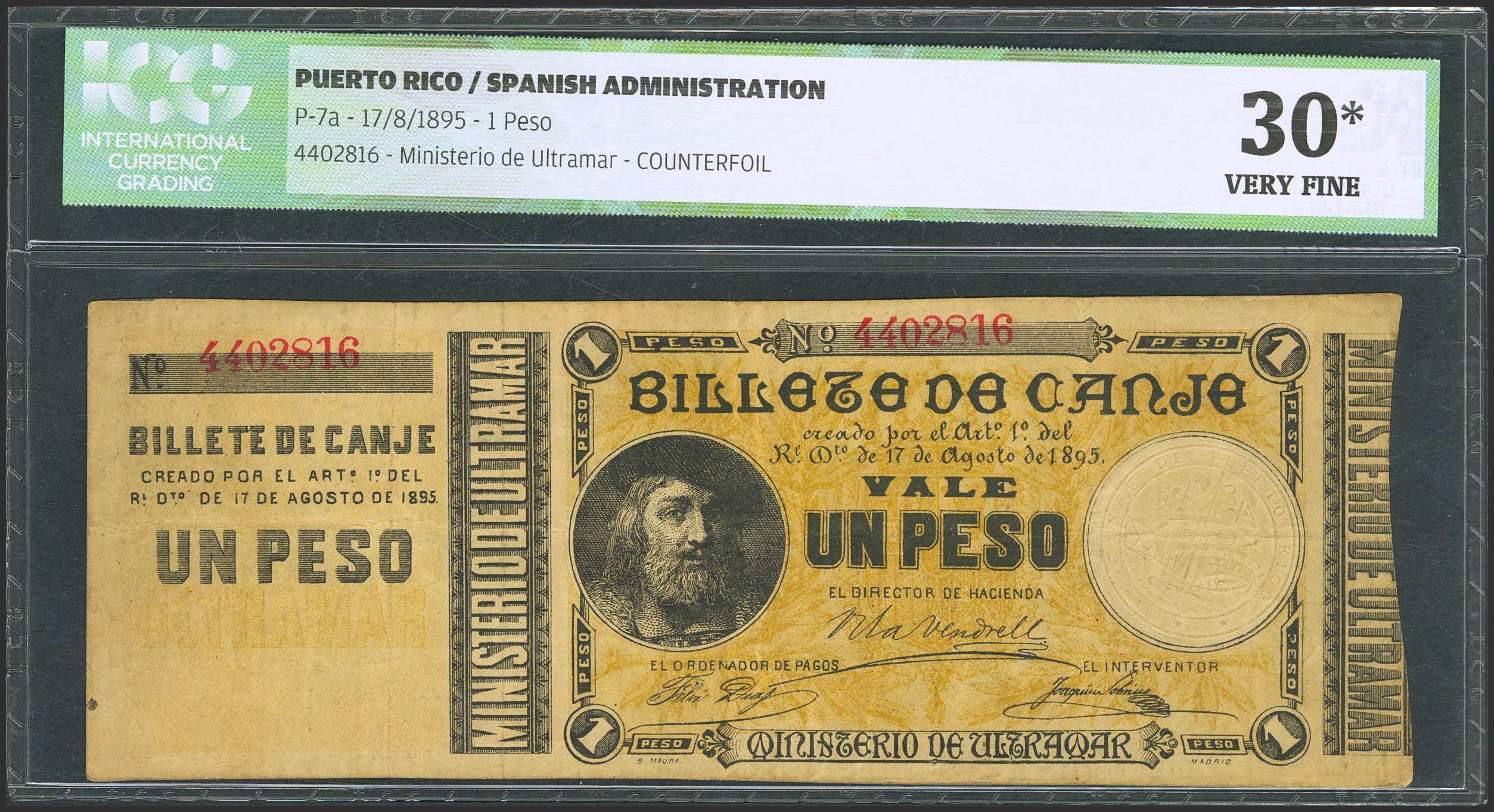 PUERTO RICO. 1 Peso. August 17, 1895. No serial number and matrix on the left. (Edifil 2023: 11, Pick: 7a). Extremely rare, needle dots. VF+. ICG30* (two pinhole) capsule.