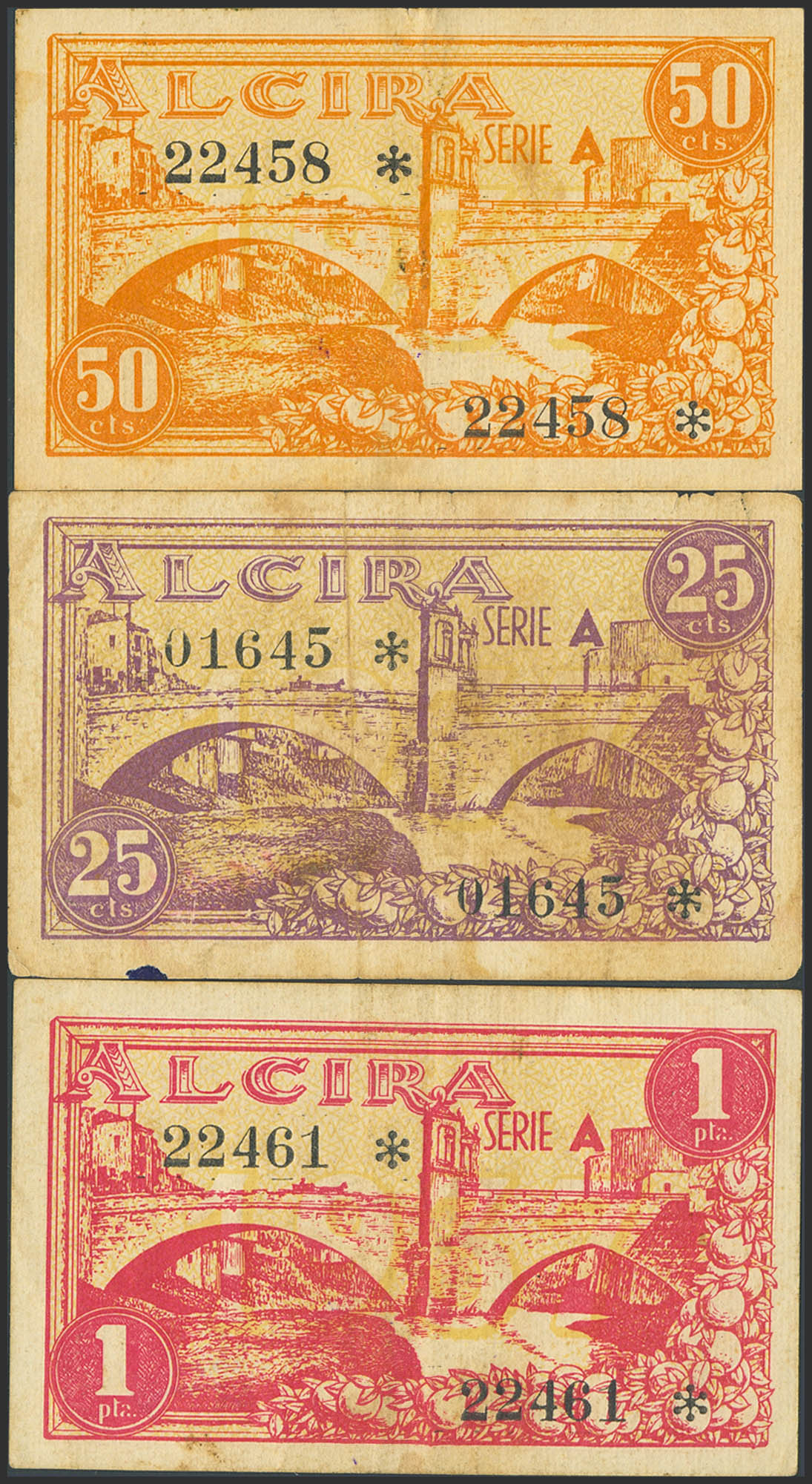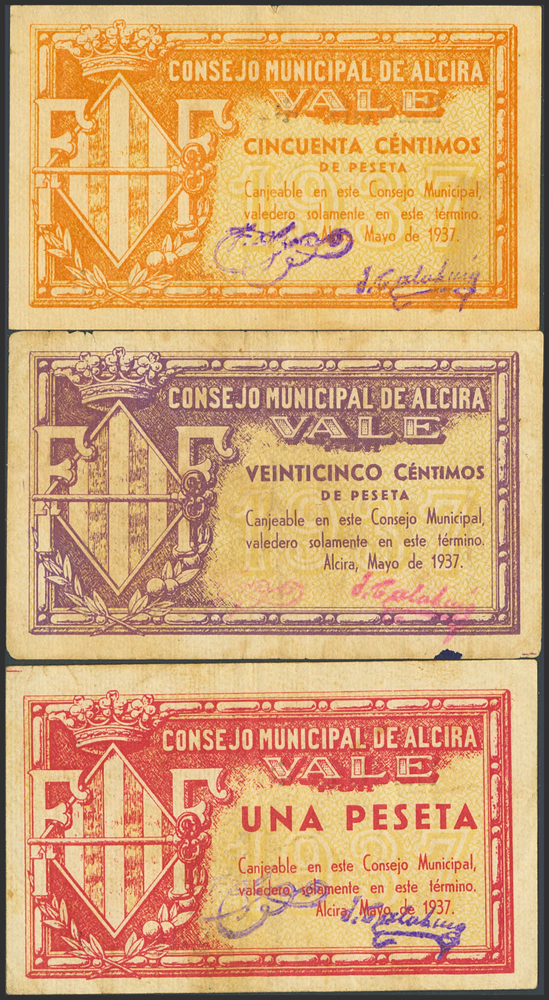 ALCIRA (VALENCIA). 25 Centimos, 50 Centimos and 1 Peseta. May 1937. (González: 324/26). Complete series. VF/EF-.