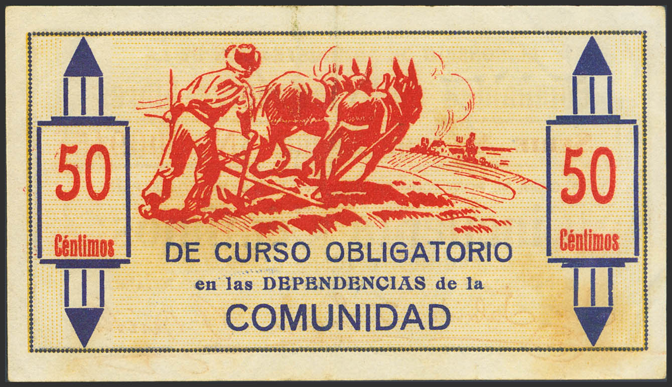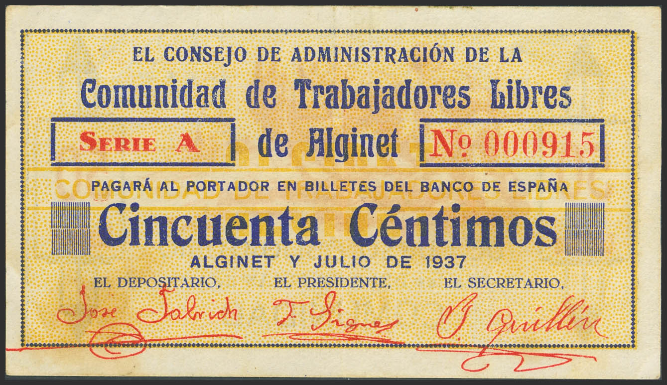 ALGINET (VALENCIA). 50 Centimos. July 1937. Series A. (González: 483). Very rare. VF-.