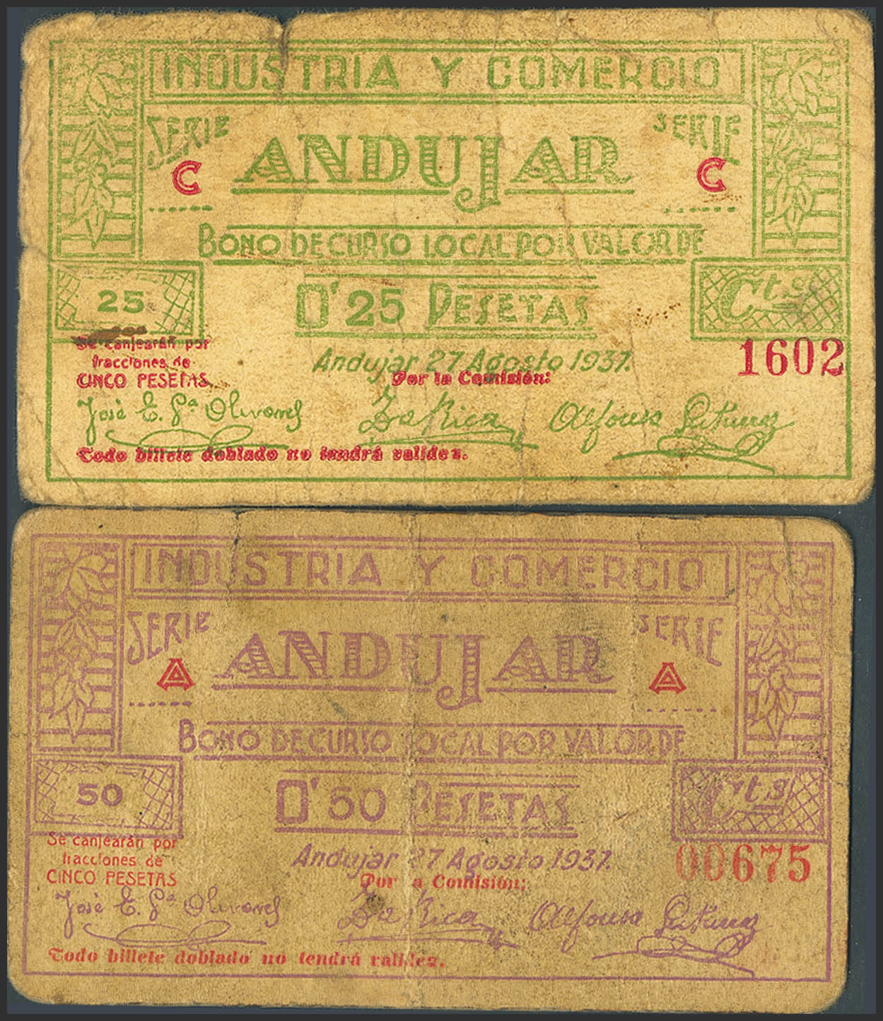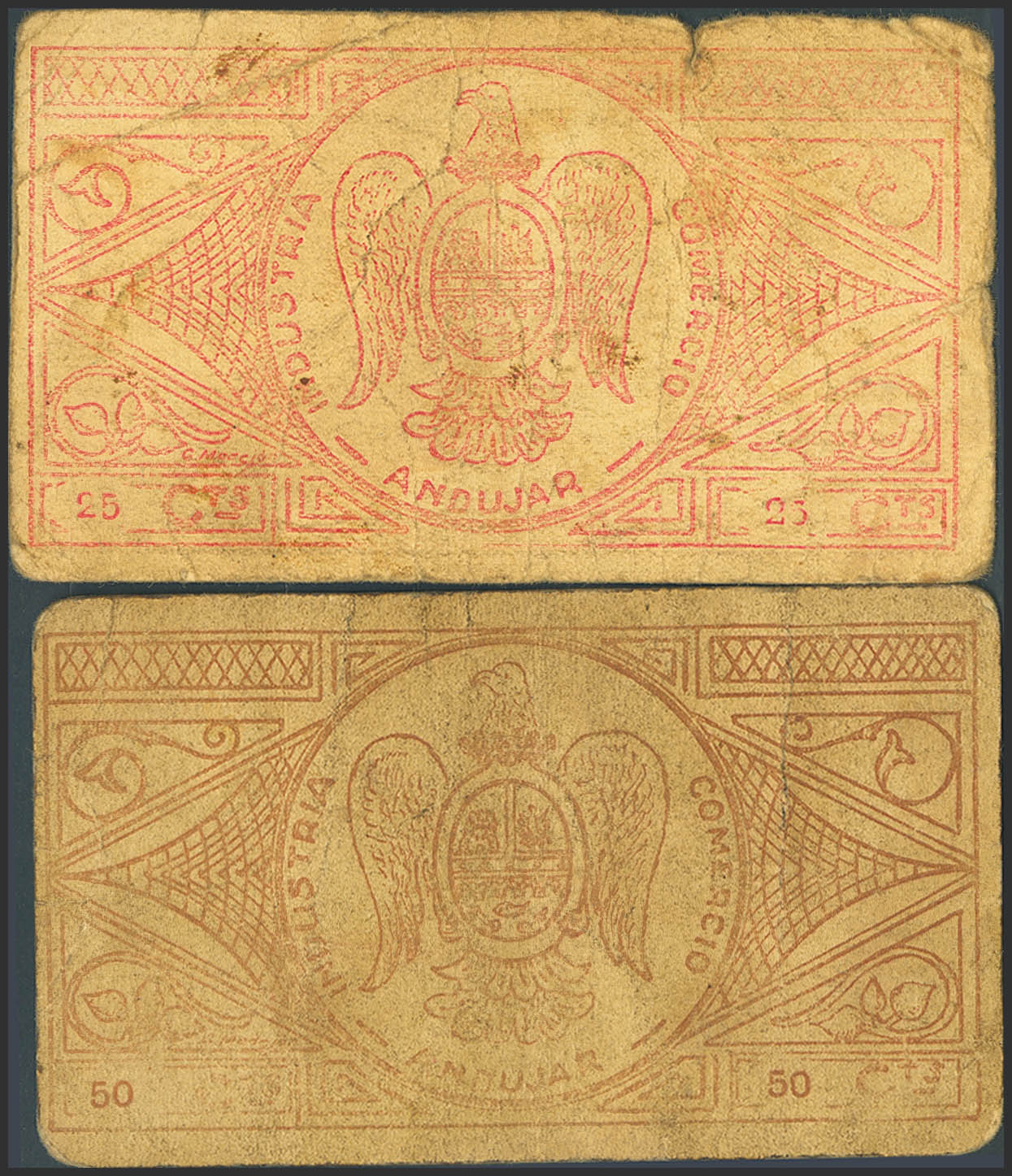 ANDUJAR (JAEN). 25 Centimos and 50 Centimos. August 27, 1937. Series C and A, respectively. (González: 695, 696). Unusual. Good Fine.