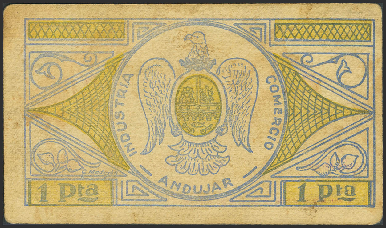 English ANDUJAR (JAEN). 1 Peseta. August 27, 1937. Series B. (González: 699). Unusual. Good Very Fine.