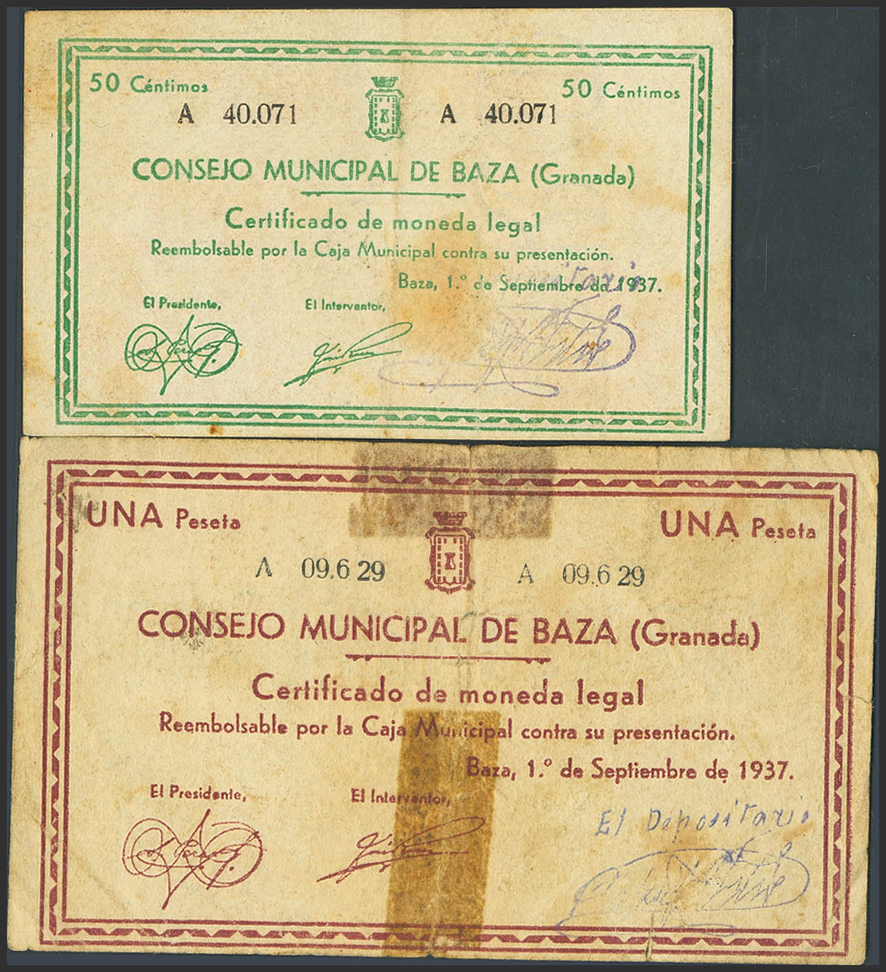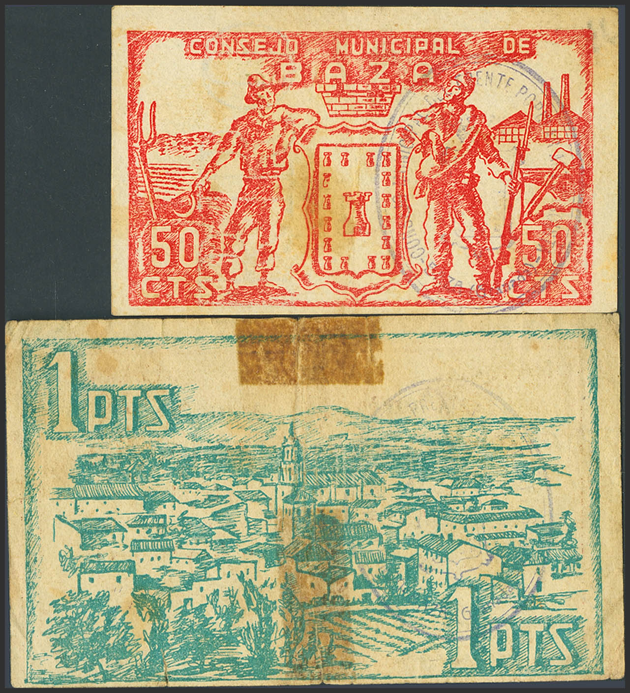 BAZA (GRANADA). 50 Centimos and 1 Peseta. September 1, 1937. Series A, both. (González: 906/07). Complete series. VF-.