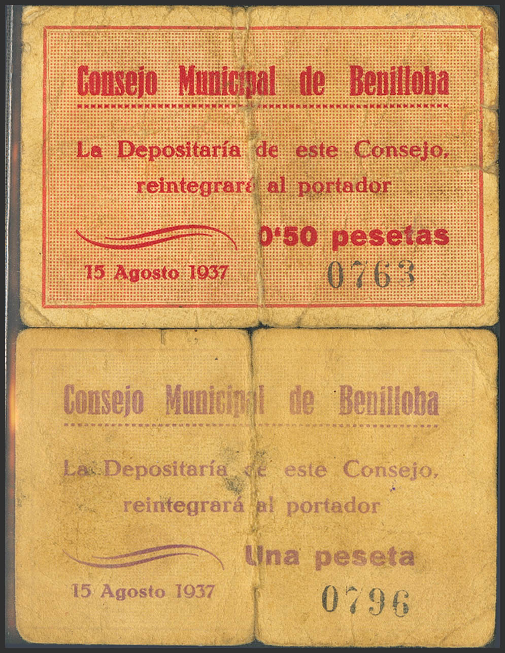 BENILLOBA (ALICANTE). 50 Centimos and 1 Peseta. August 15, 1937. (González: 1122, 1123). Unusual. Fine-.