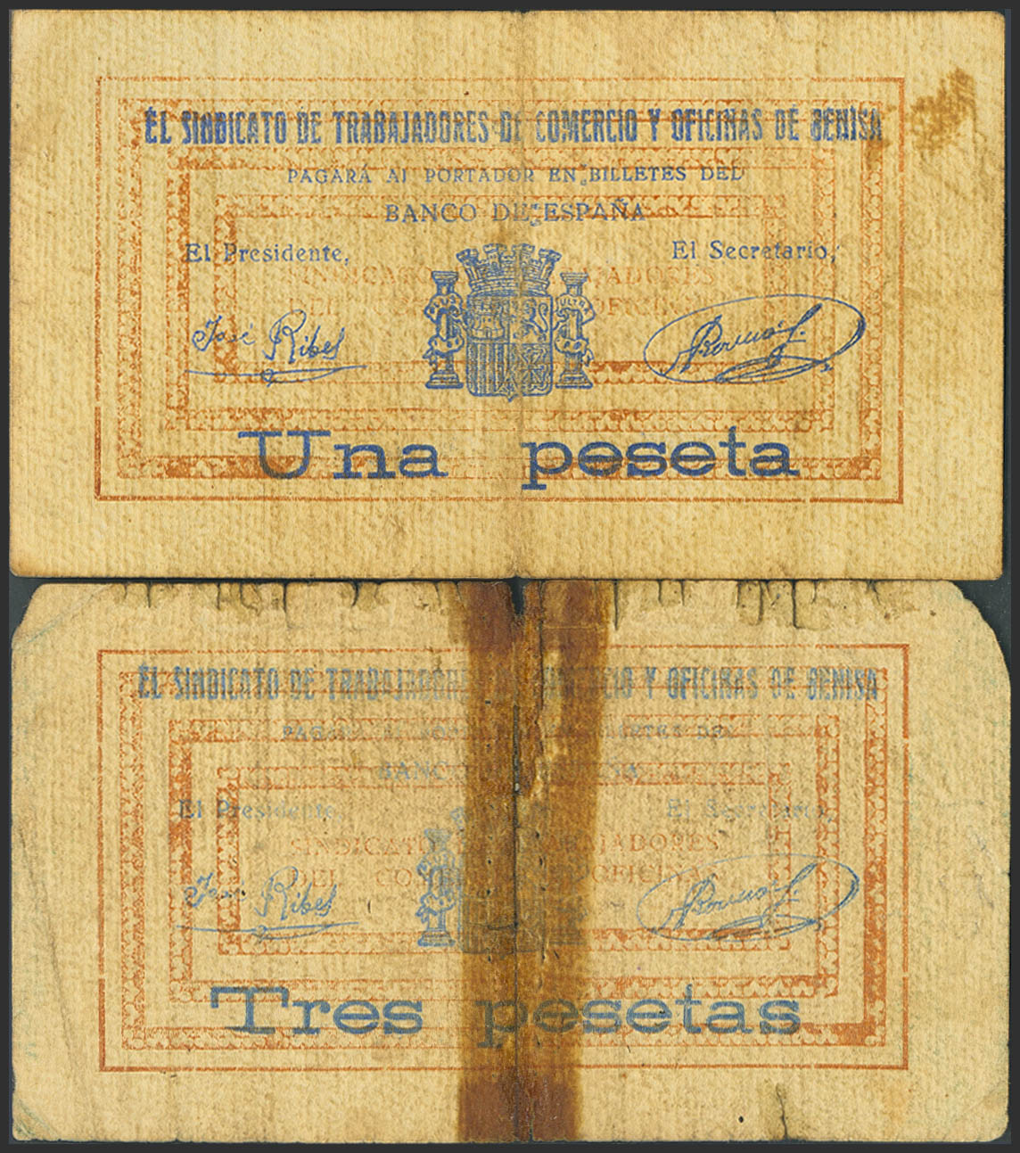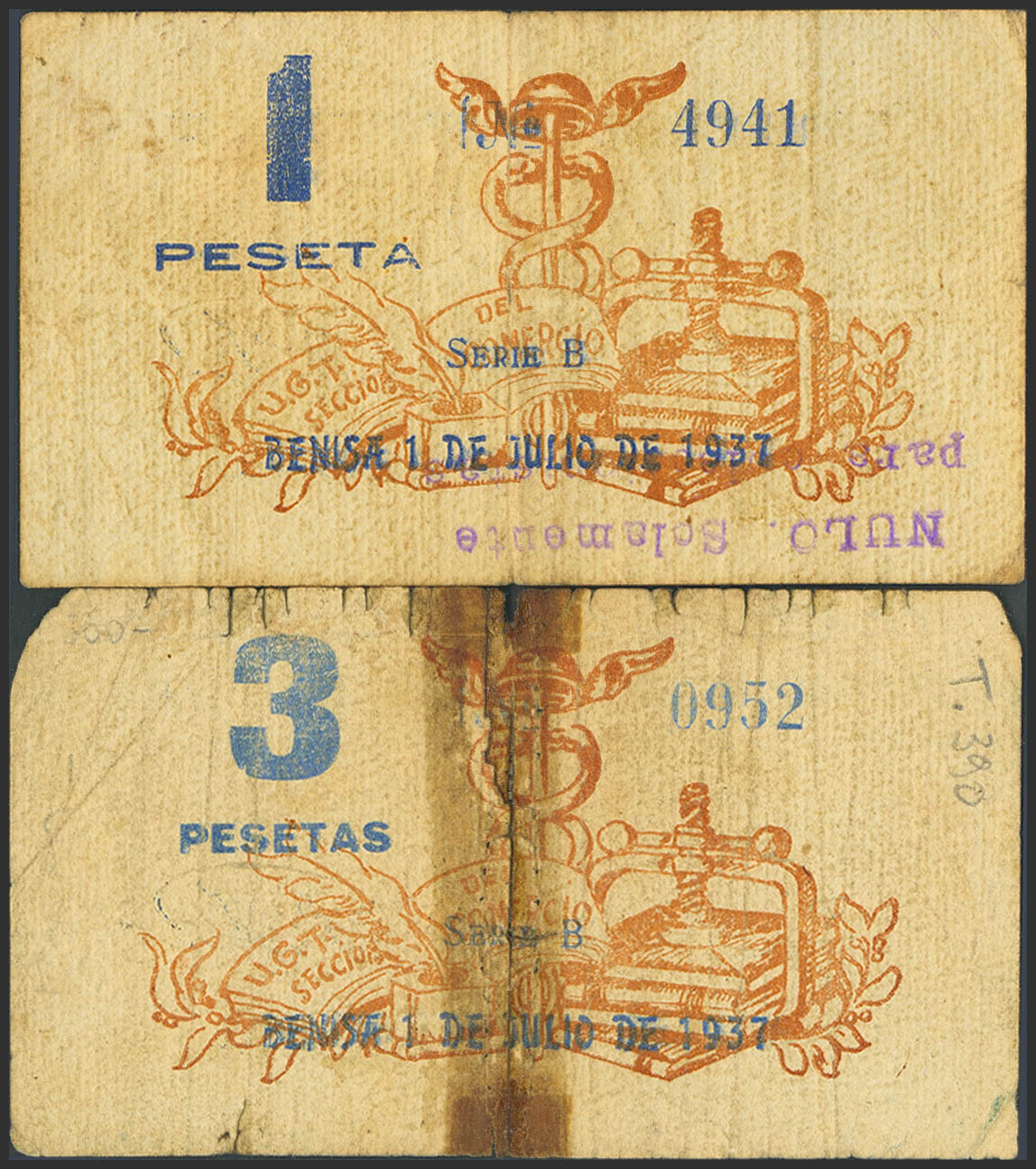 BENISA (ALICANTE). 1 Peseta and 3 Pesetas. July 1, 1937. Series B, both. (González: 1162, 1163). Very rare, 3 pts with adhesive tape present. VF-/Good-.