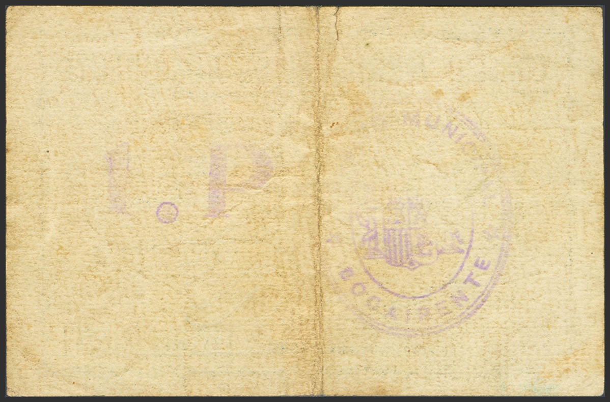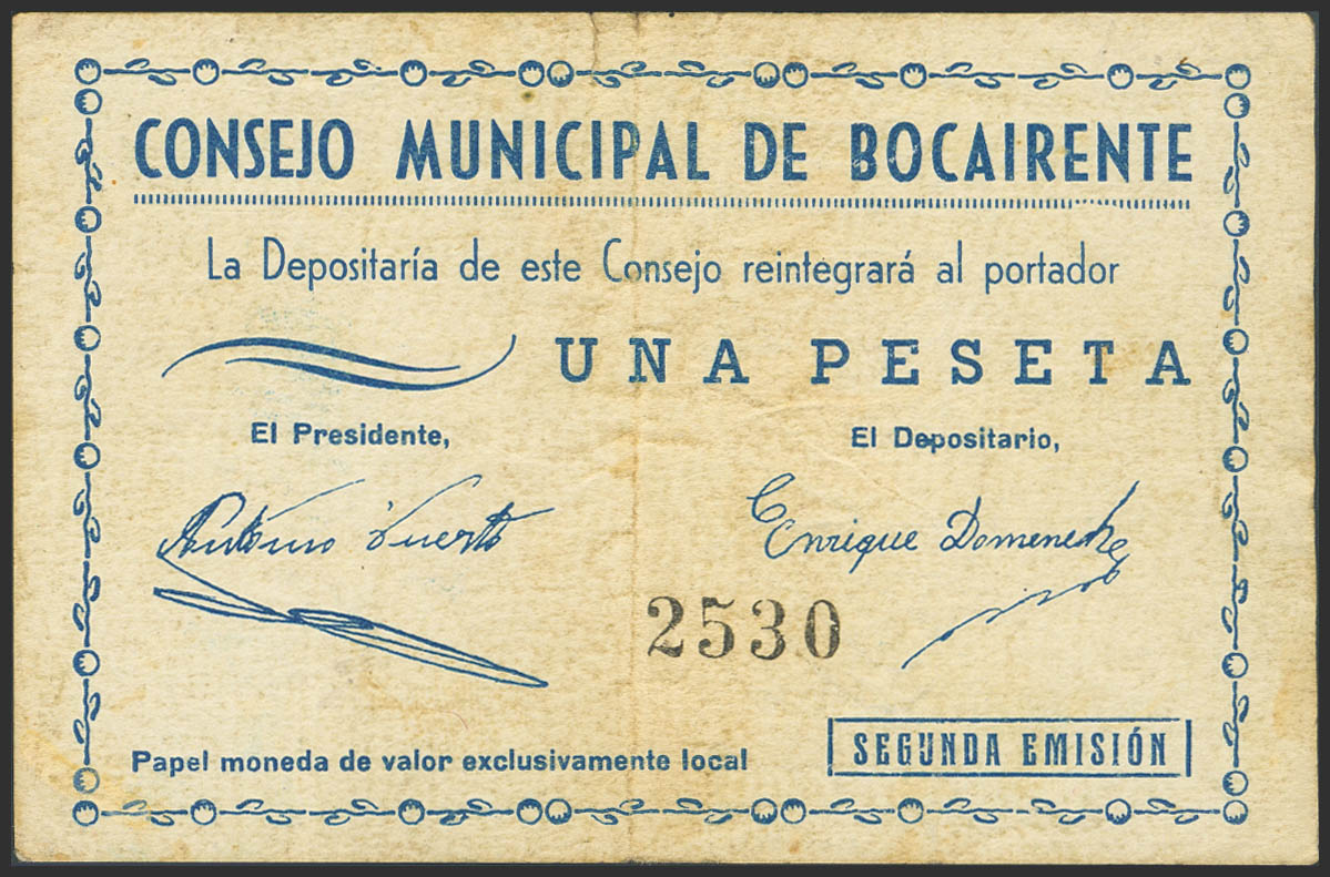 BOCAIRENTE (VALENCIA). 1 Peseta. (1937ca). (González: 1254). Queer. Very Fine-.