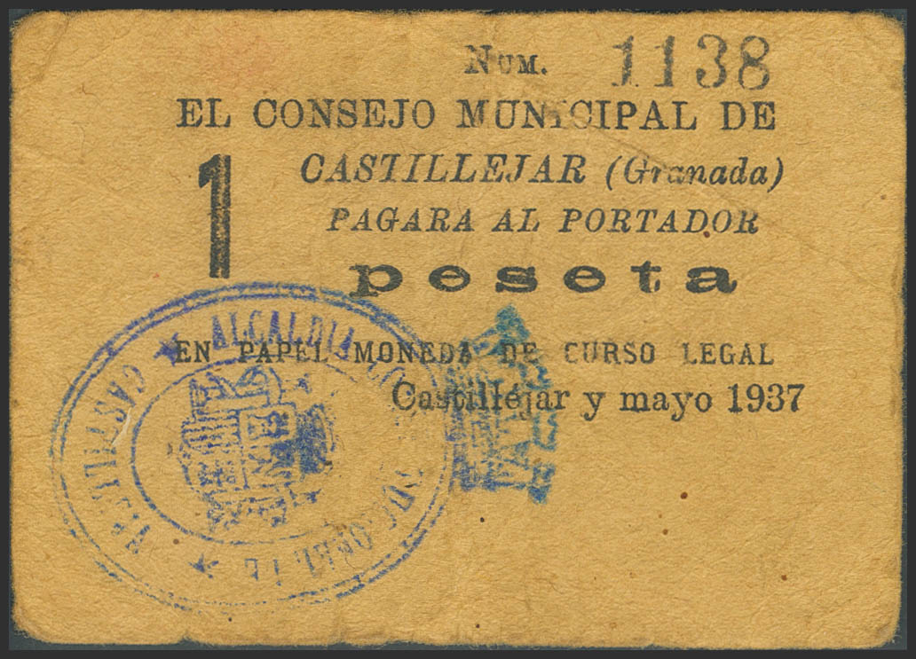 CASTILLEJAR (GRANADA). 1 Peseta. May 1937. (González: 1811). Very rare. VF-.