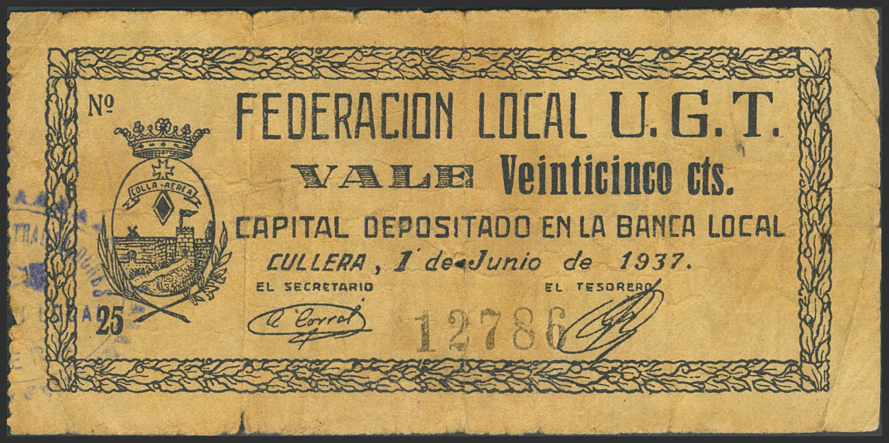 English CULLERA (VALENCIA). 25 Centimos. June 1, 1937. (González: 2168). Rare. Fine.