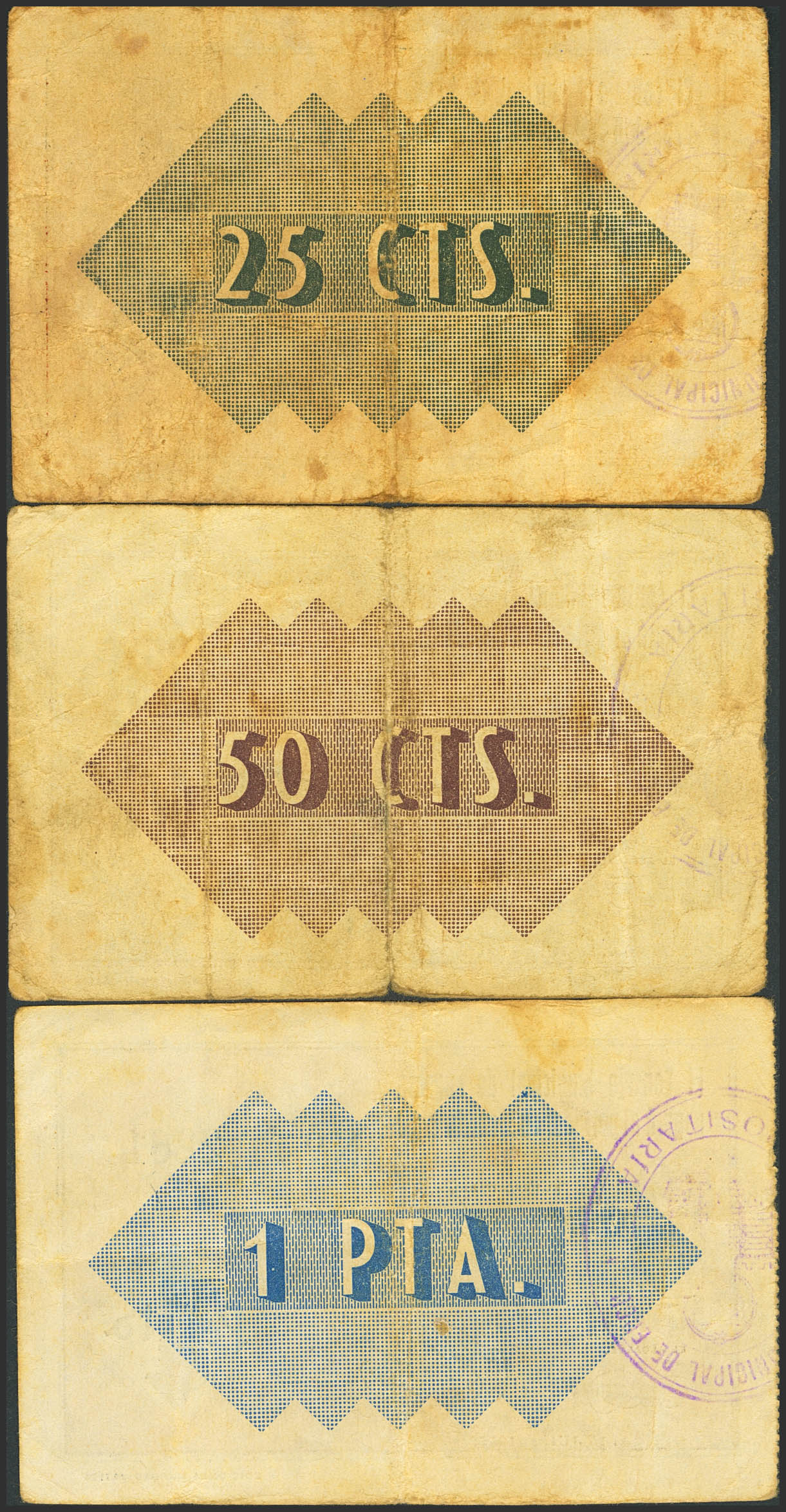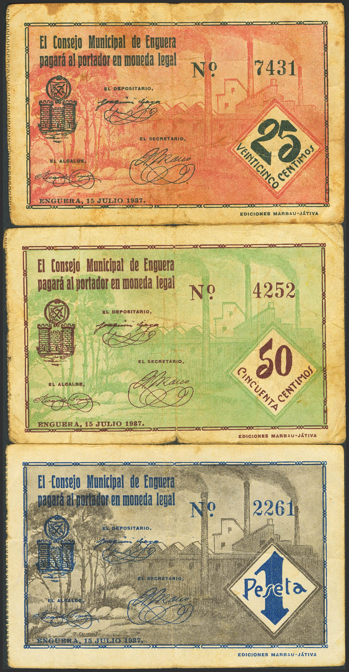 ENGUERA (VALENCIA). 25 Centimos, 50 Centimos and 1 Peseta. July 15, 1937. (González: 2295/97). Unusual complete series. VF-.