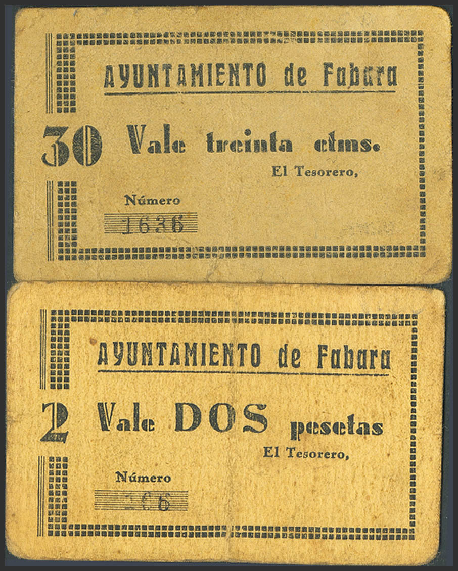 FABARA (ZARAGOZA). 30 Centimos and 2 Pesetas. (circa 1937). (González: 2395, 2398). Extremely rare; to give an idea of their rarity, the 2 peseta coin is not photographed in González. VF-.