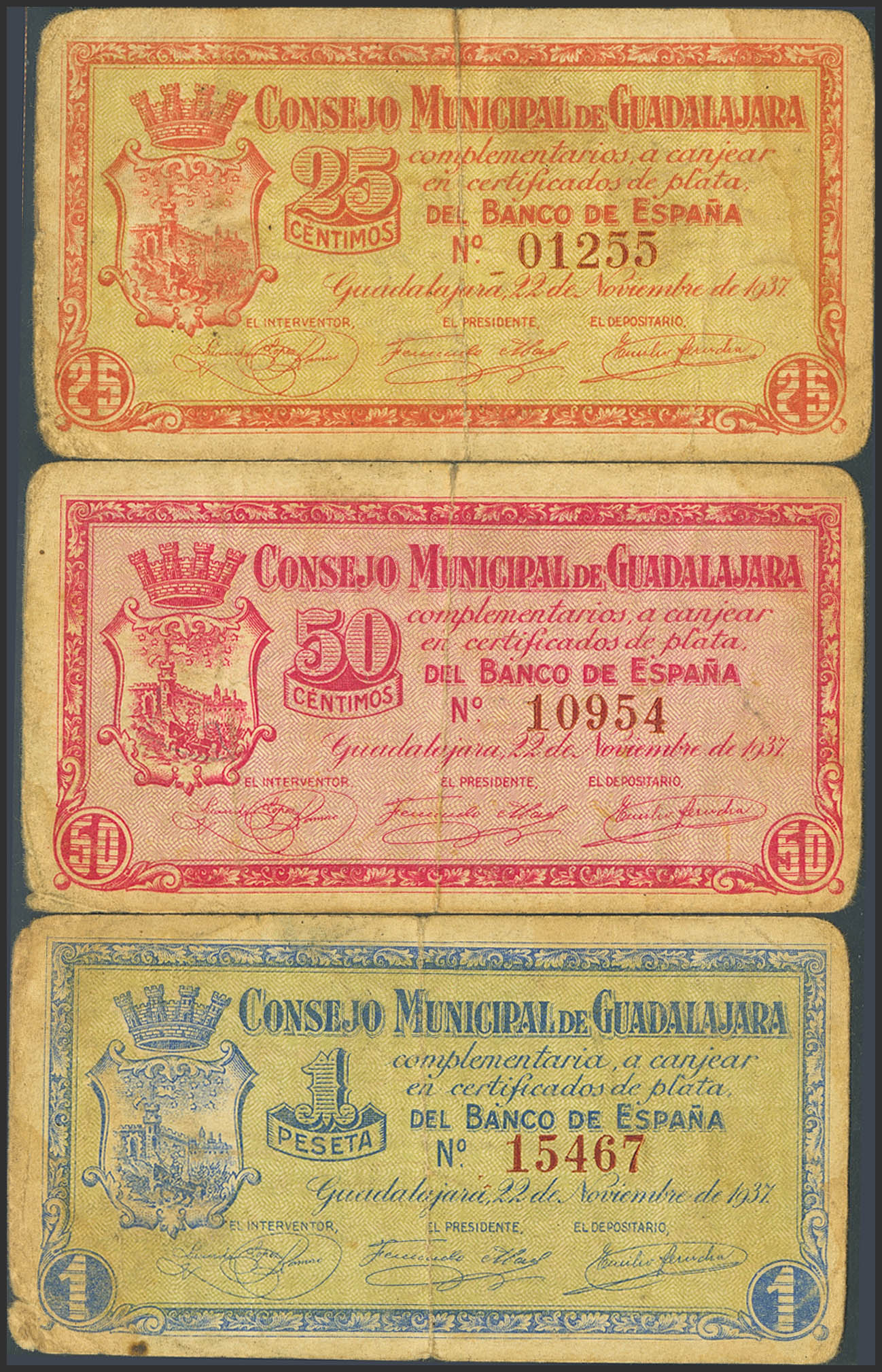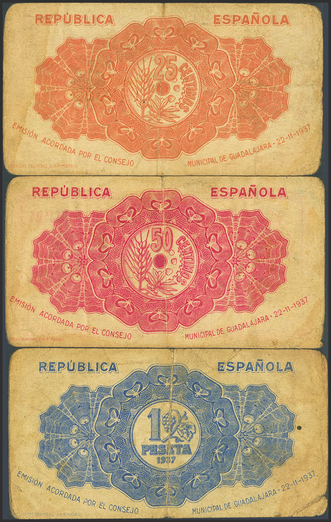 GUADALAJARA. 25 Centimos, 50 Centimos and 1 Peseta. November 22, 1937. (González: 2748/50). Complete series. Good Fine.