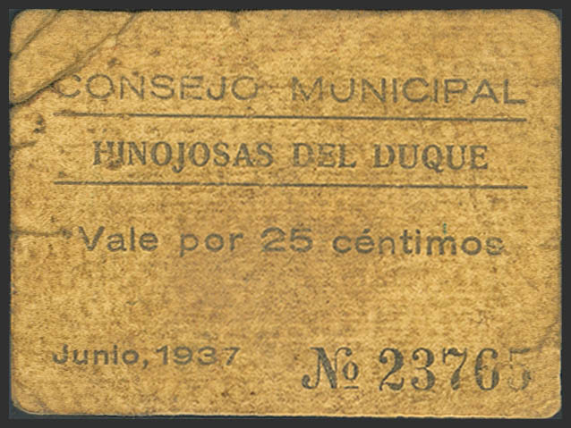 HINOJOSA DEL DUQUE (CORDOBA). 25 Cents. June 1937. (González: 2862). Queer. Good Fine.