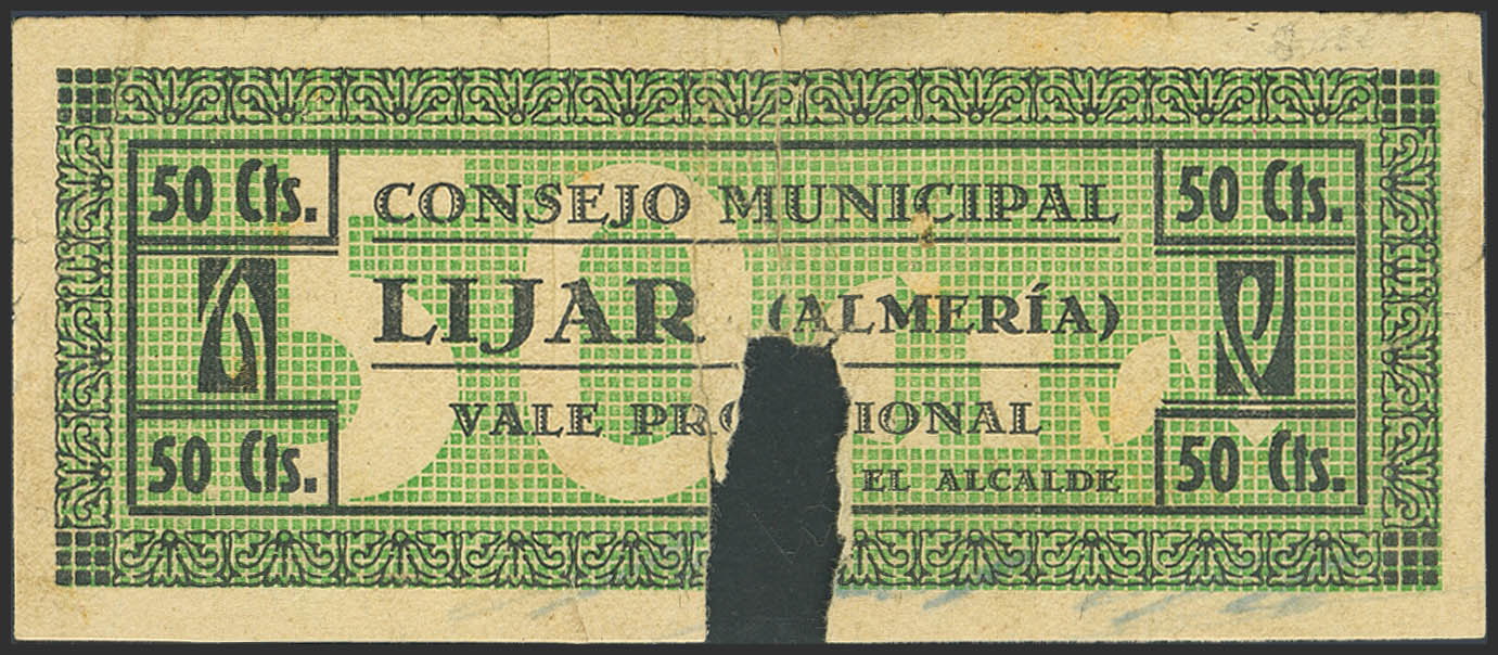 English LIJAR (ALMERIA). 50 Centimos. (circa 1937). (González: 3152). Very rare. Good-.
