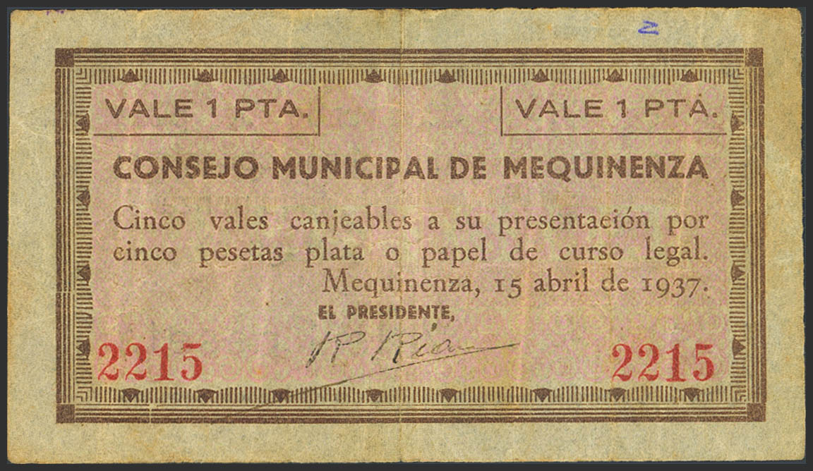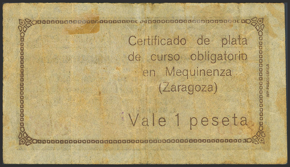 MEQUINENZA (ZARAGOZA). 1 Peseta. April 15, 1937. (González: 3494). Rare. VF+.