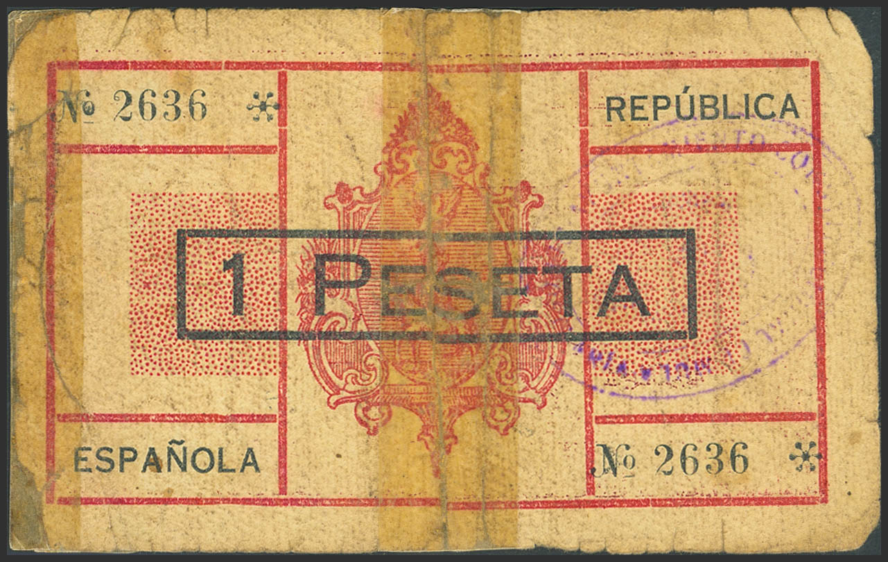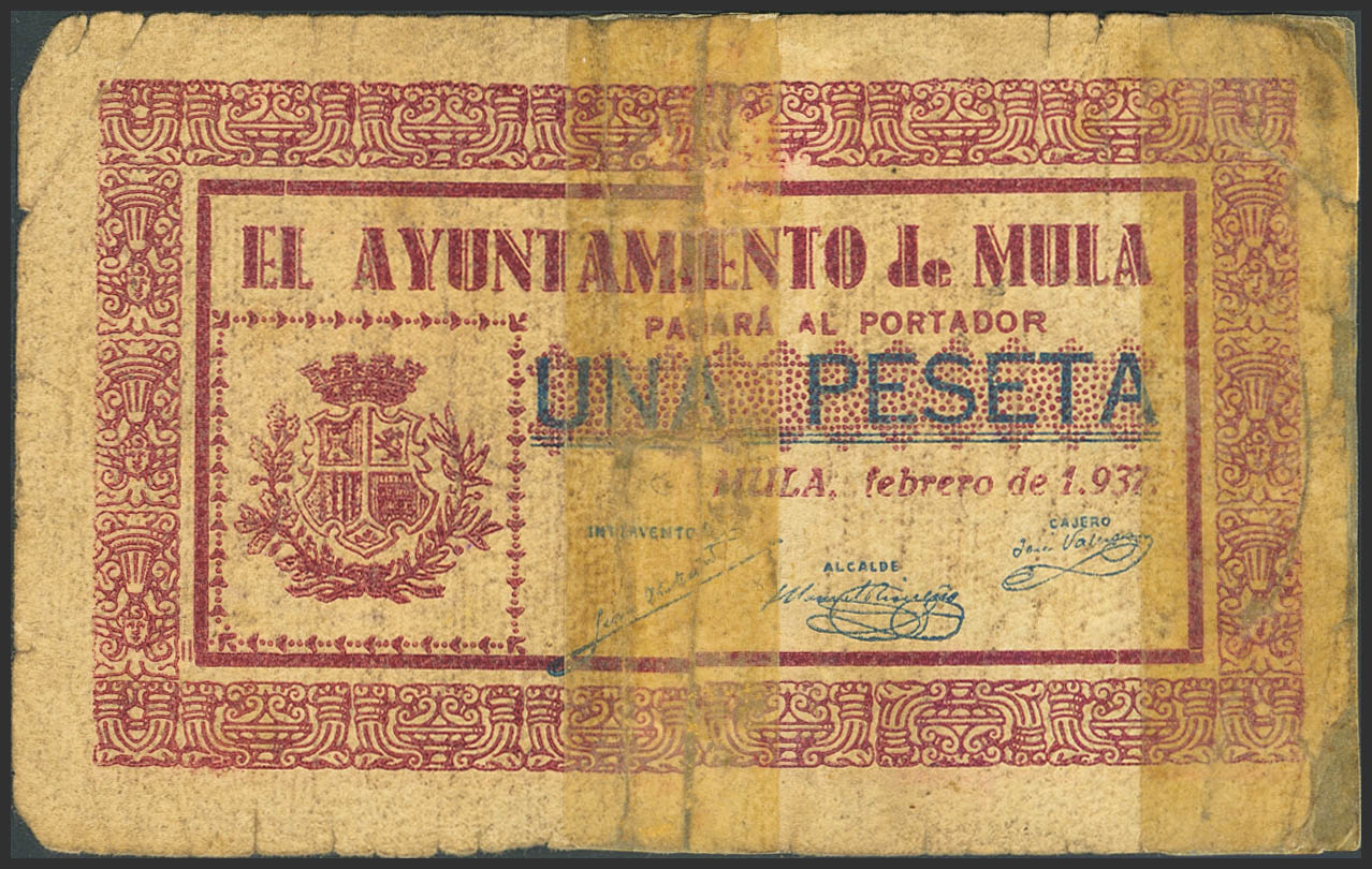 MULA (MUGoodIA). 1 Peseta. February 1937. (González: 3756). Rare, presence of adhesive citation. Fine-.