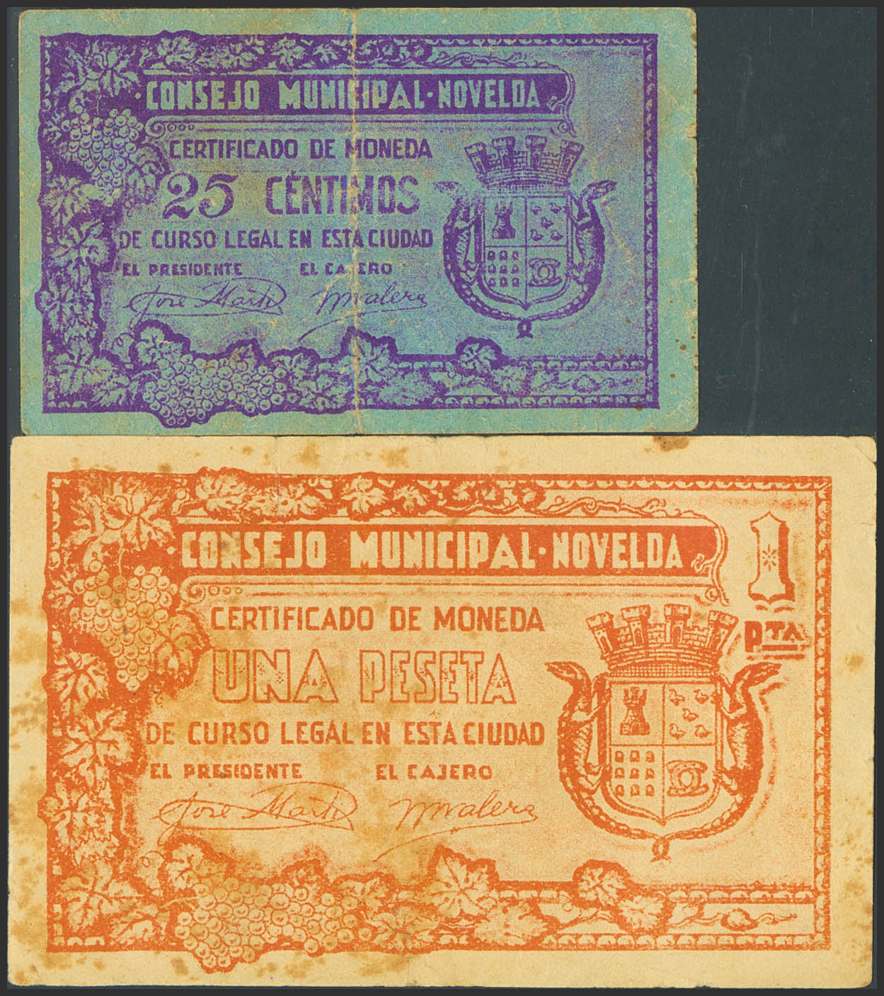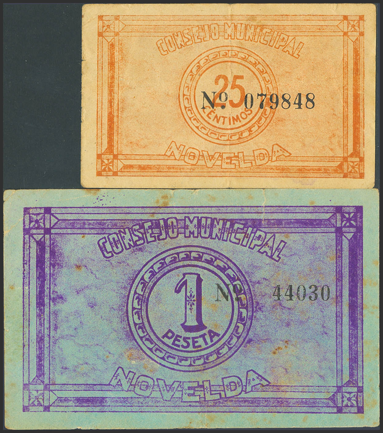 NOVELDA (ALICANTE). 25 Centimos and 1 Peseta. (1937ca). (González: 3865/66). Complete series. VF-.