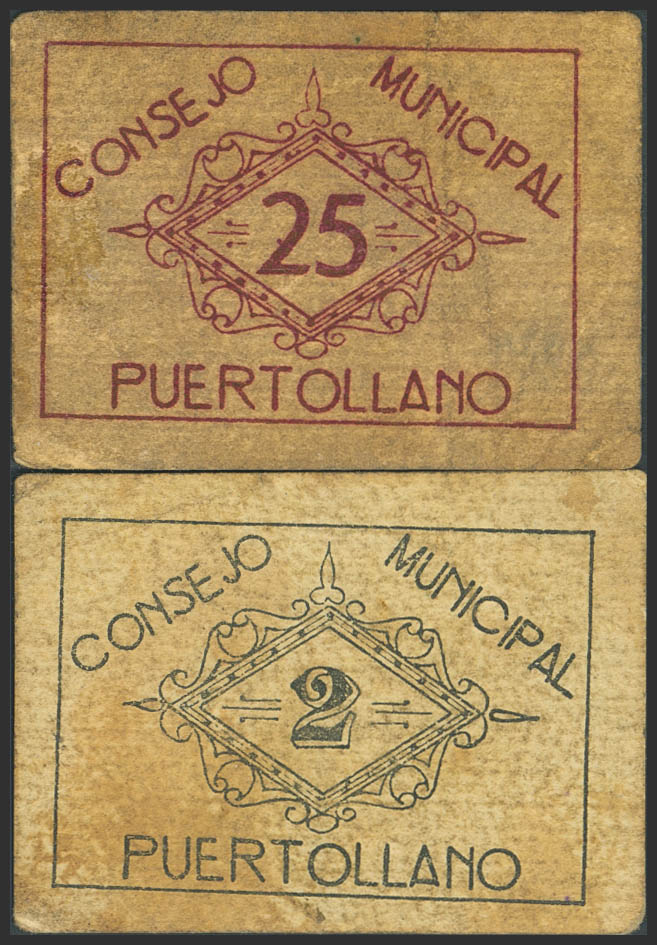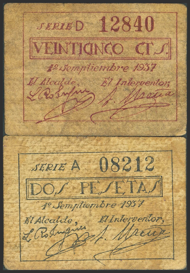 PUERTOLLANO (CIUDAD REAL). 25 Centimos and 2 Pesetas. September 1, 1937. Series D and A, respectively. (González: 4400, 4403). Unusual. VF-.